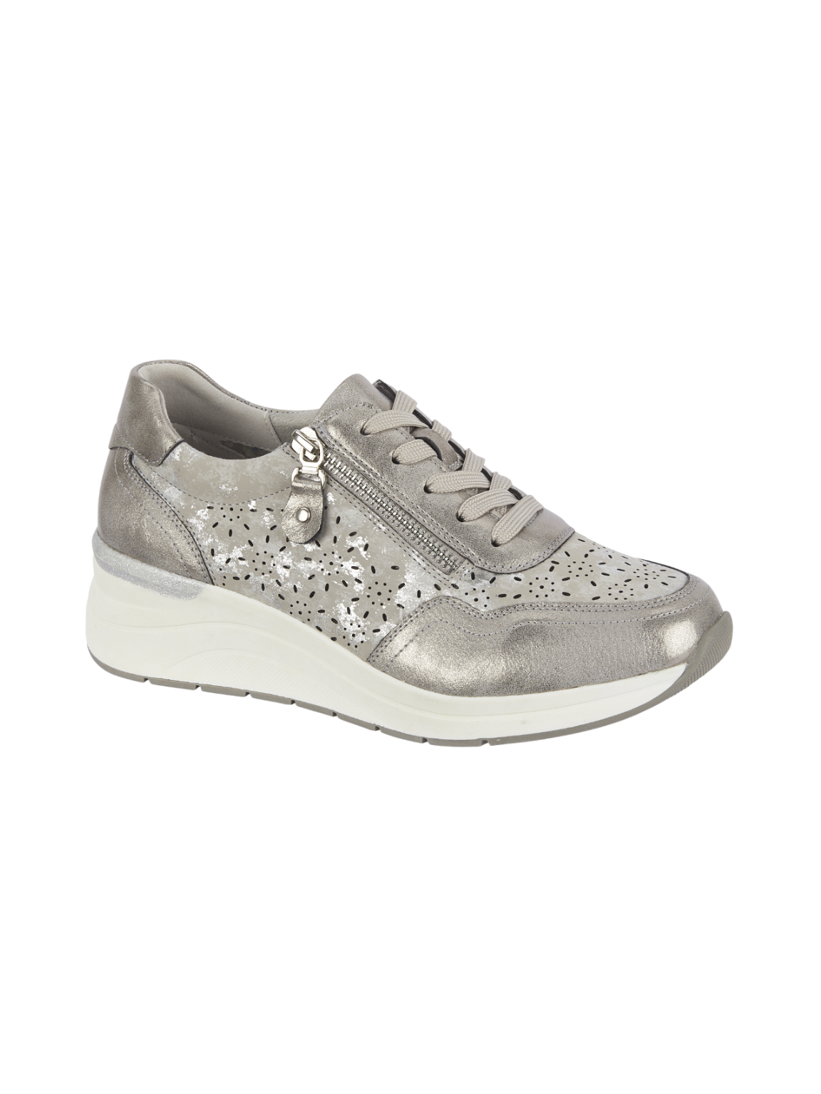 Step up your style with the Foil Wedge Delia Trainer. This eye-catching trainer features a striking shimmering foil pattern that catches the light beautifully, paired with a subtle wedge heel for added comfort and height. The practical lace-up and zip fastening gives you flexibility—wear it fully laced for support or unzip for easy on-and-off convenience. Perfect for everyday wear, these trainers blend fashion-forward design with functional comfort to keep you looking great all day long.