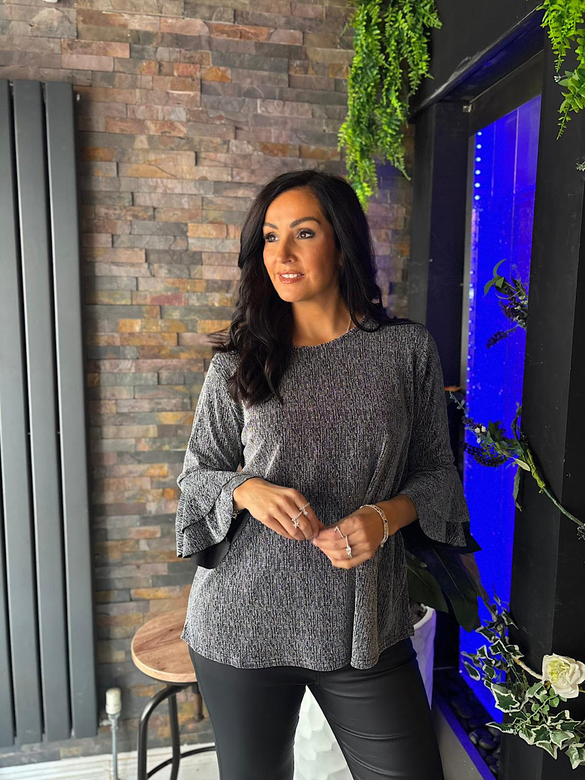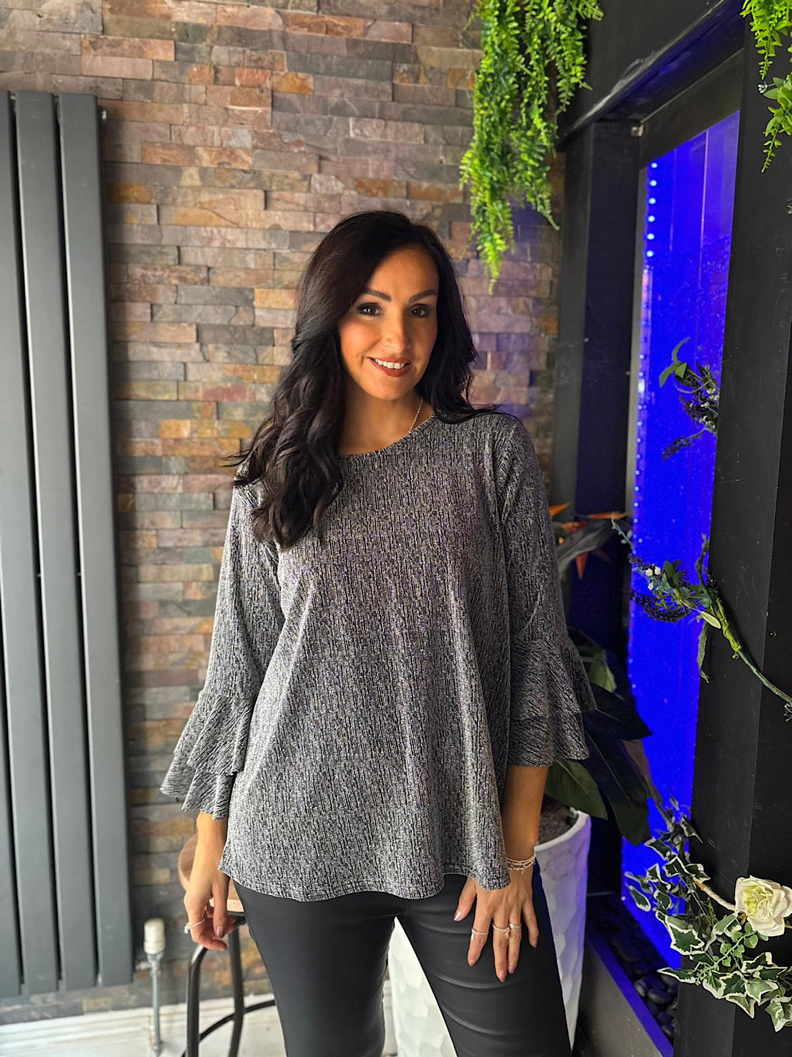 This elegant top features metallic fibres woven into the fabric, adding a subtle shimmer that catches the light beautifully. The layered angel sleeves create a graceful, flowing silhouette, perfect for adding a touch of sophistication to any outfit. Comfortable and eye-catching, this top is designed to make you feel confident and stylish for any occasion.