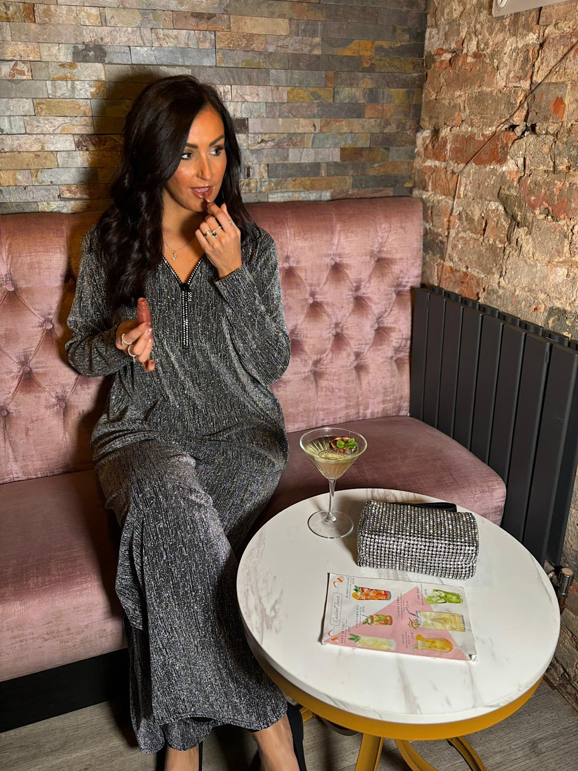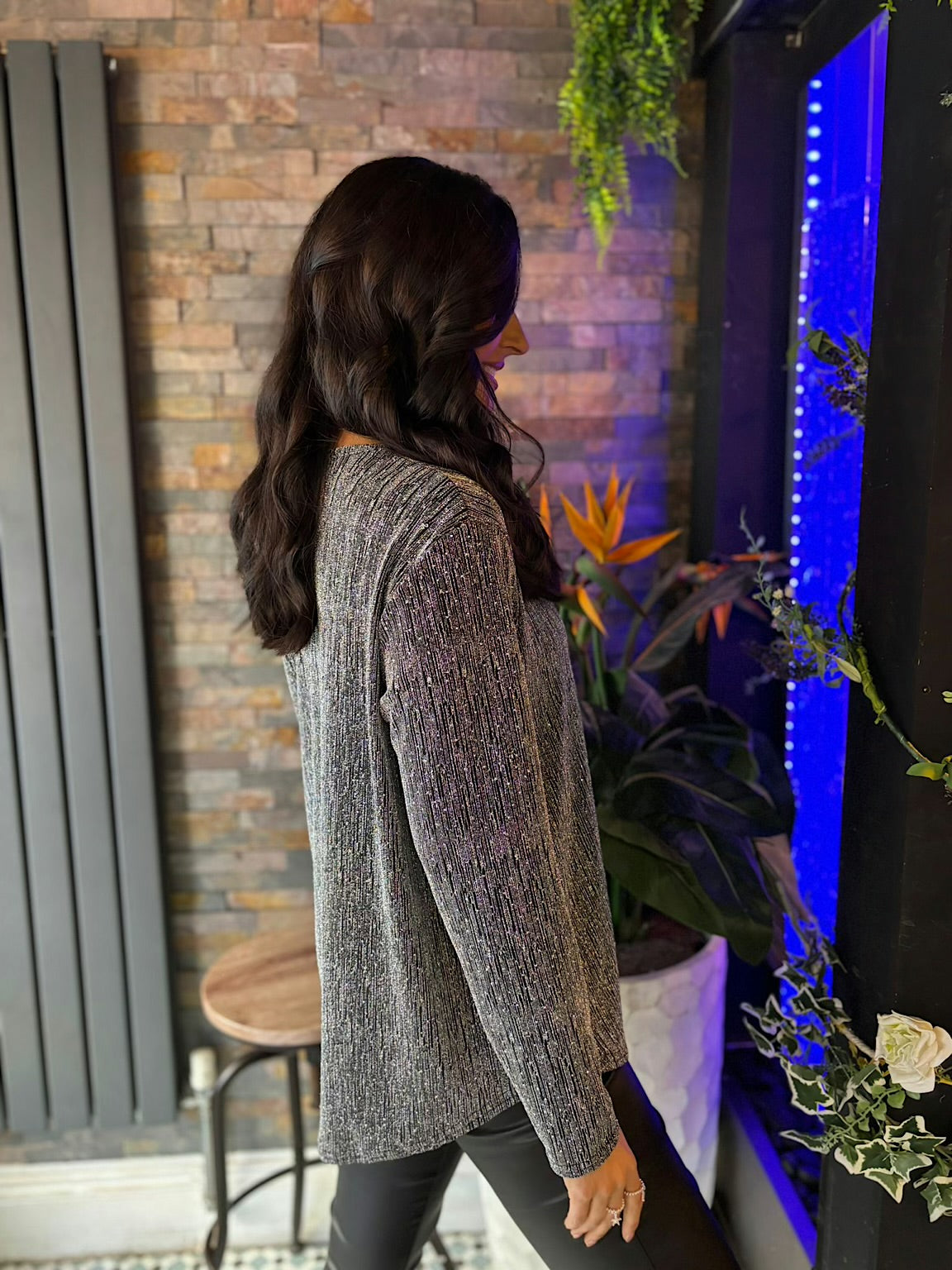 Elevate your party wardrobe with our classic Cassie top, now crafted in a shimmering metallic fibre. The sparkle fabric and diamantes catch the light beautifully, while delicate diamante detailing along the neckline adds a touch of glamour. Featuring a smooth zip for easy wear, this top combines comfort with festive sparkle, making it the perfect choice to celebrate in style.