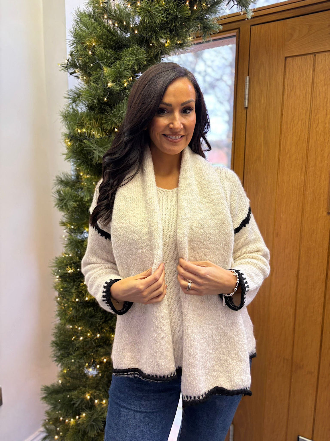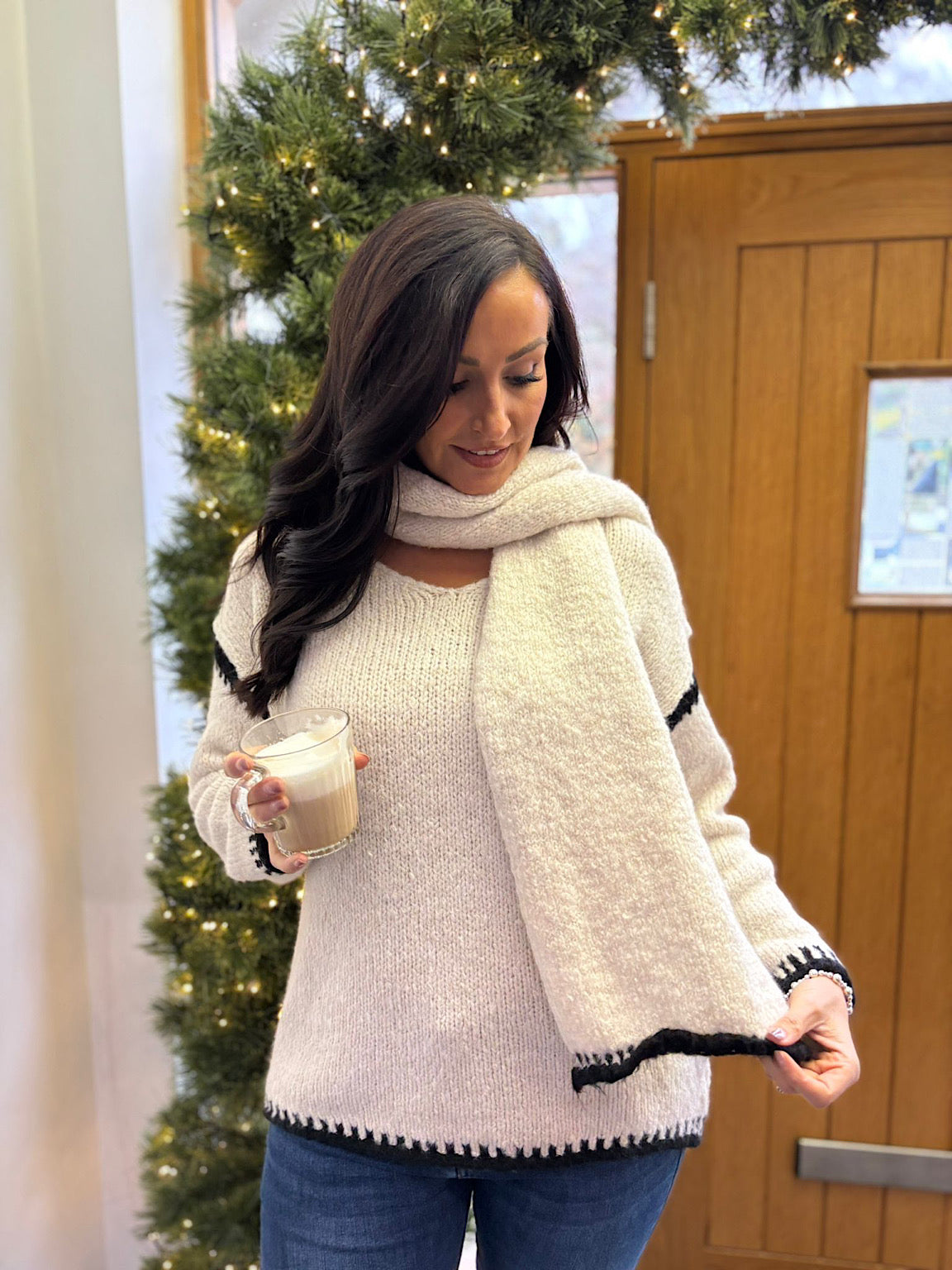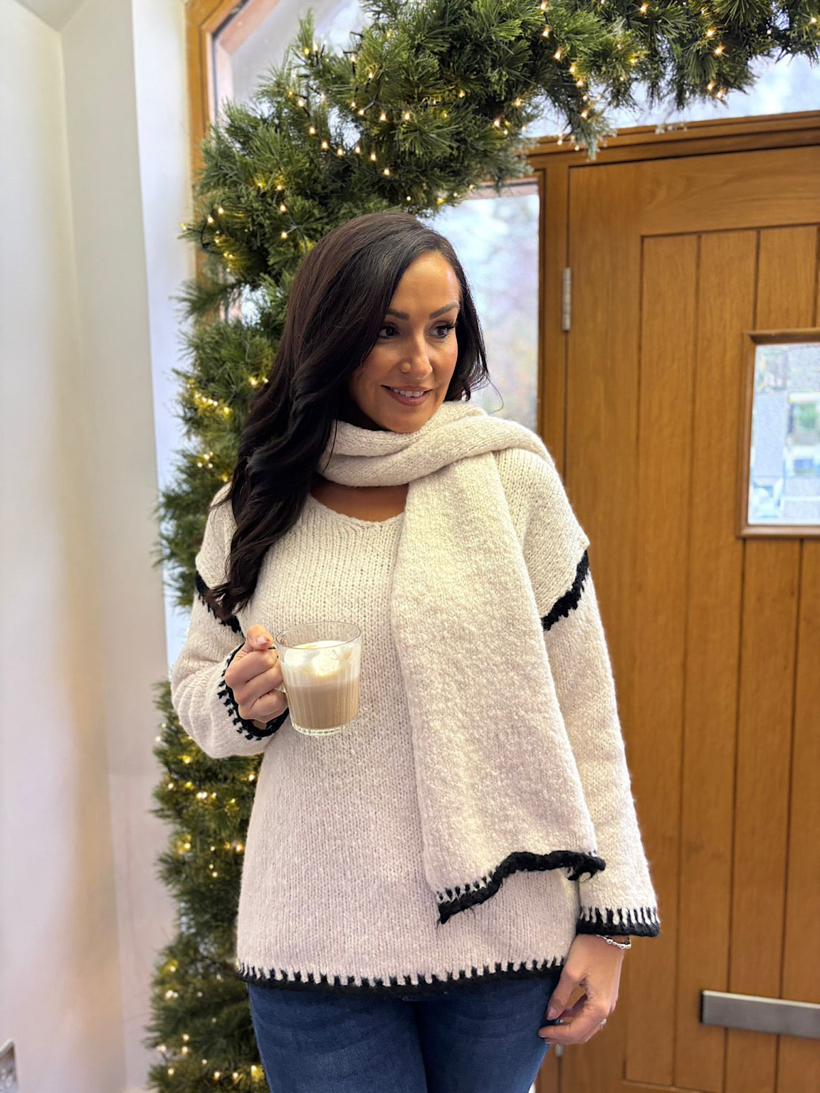 Experience the perfect blend of comfort and style with this blanket stitch knit. The soft fabric features a distinctive blanket stitch pattern that catches the eye, while the elegant V-neckline offers a flattering silhouette. This two-piece set includes a detachable matching scarf, giving you the freedom to style it your way—wear them together for a coordinated ensemble or separately for versatile layering. A thoughtfully designed piece that supports your everyday comfort without sacrificing sophistication.