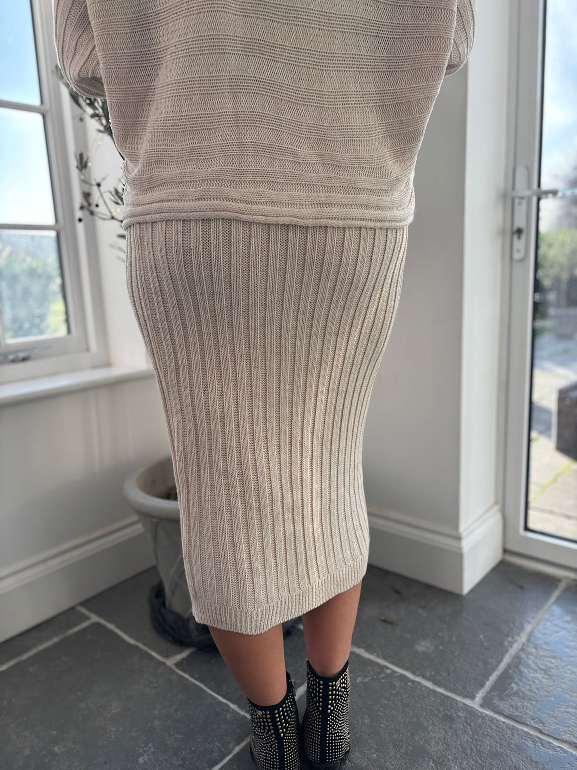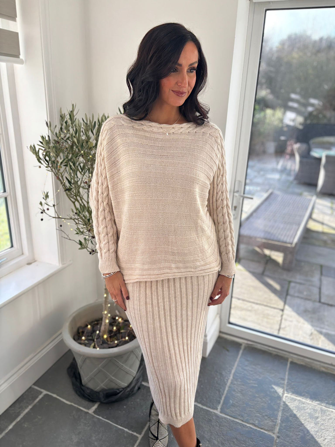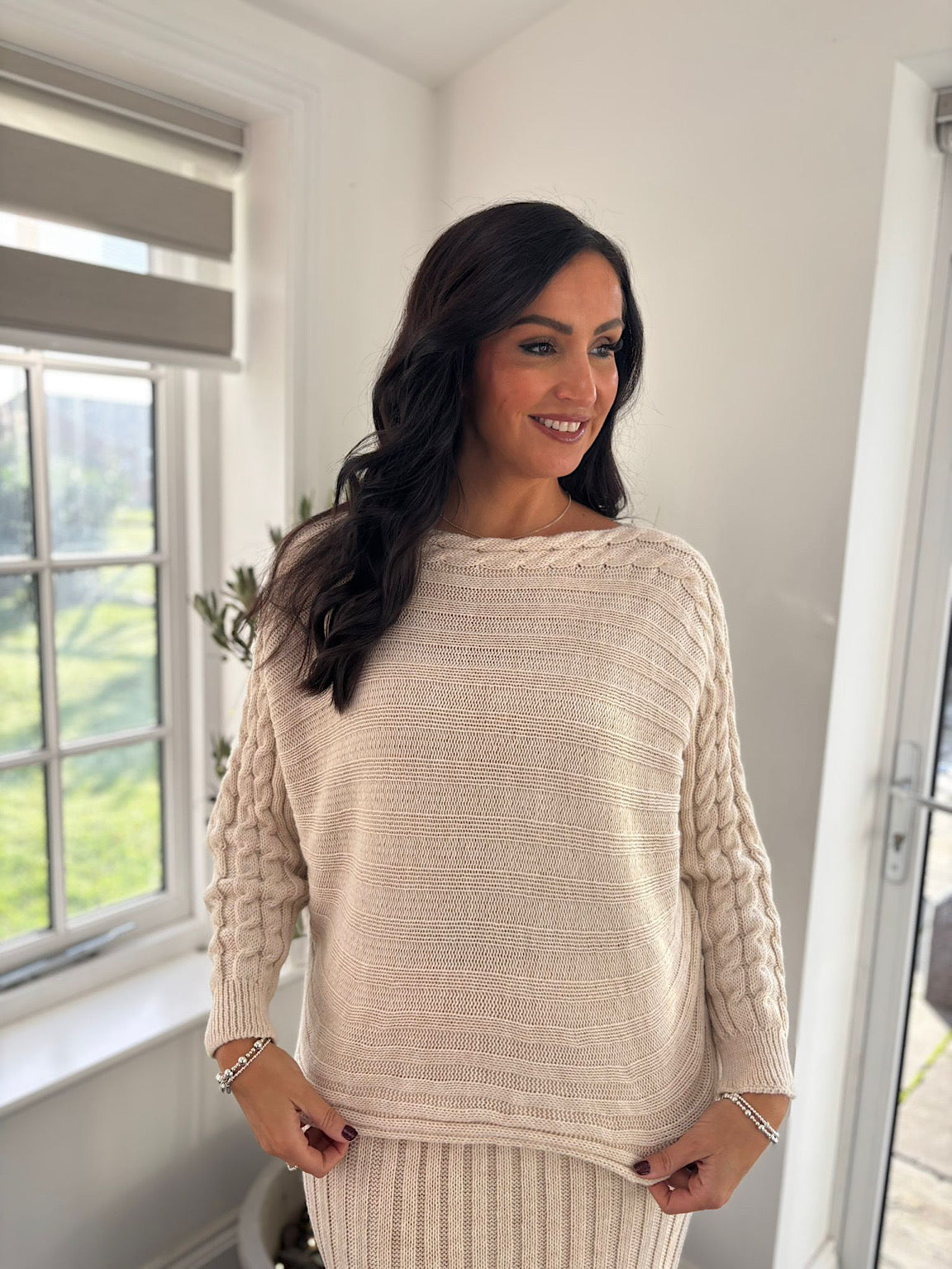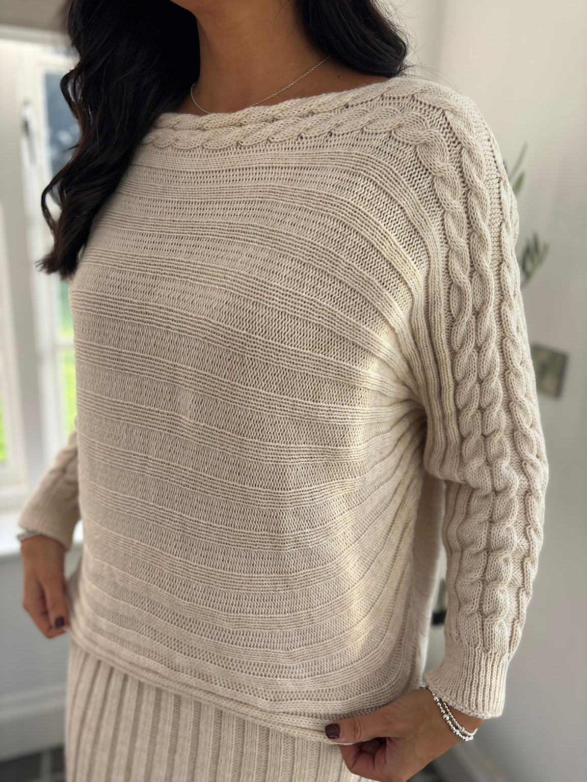 This two piece set is versatile and perfect for any occasion. Made of cosy knitted fabric, the cable detailing on the shoulder adds a touch of elegance. The ribbed design enhances the overall look of this stylish outfit. Perfect for staying warm and fashionable in the colder months.