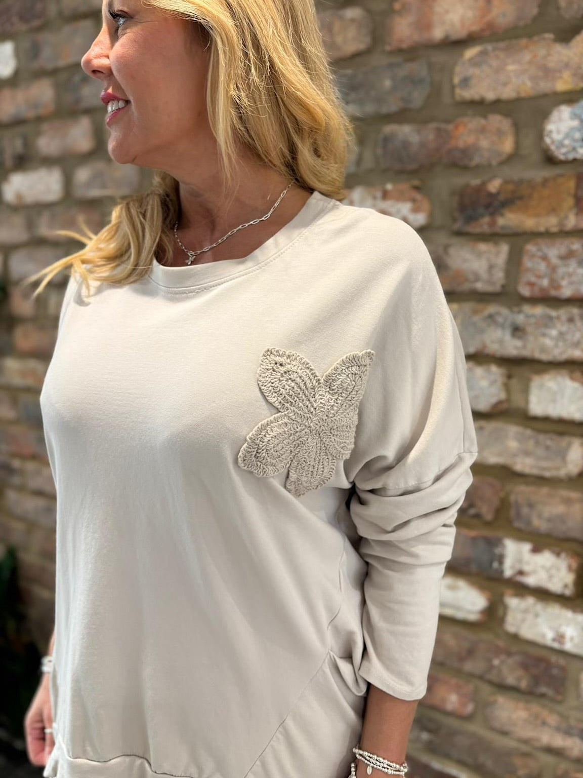 Wrap yourself in comfort with this sweatshirt, beautifully adorned with a delicate crochet flower detail at the front. The thoughtfully placed side tucks create a flattering silhouette that skims your figure without clinging. Perfect for those days when you want to feel both cosy and put-together, this piece effortlessly transitions from relaxed weekends to casual outings. The soft fabric and charming handcrafted element make it a wardrobe essential that celebrates your individual style.