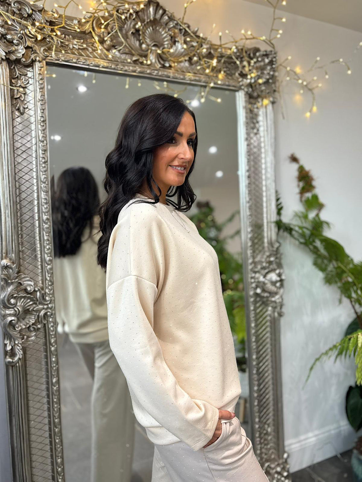 Discover effortless elegance with this Diamante Sweat Top Nina. Featuring delicate diamante embellishments scattered across the fabric, this piece brings a touch of sparkle to your casual wardrobe. With its cosy, relaxed fit inspired by our cherished Esme collection, it's the perfect choice for those moments when you want comfort without compromising on style. Layer it, dress it down, or wear it solo—this versatile top adapts to your mood and your day.