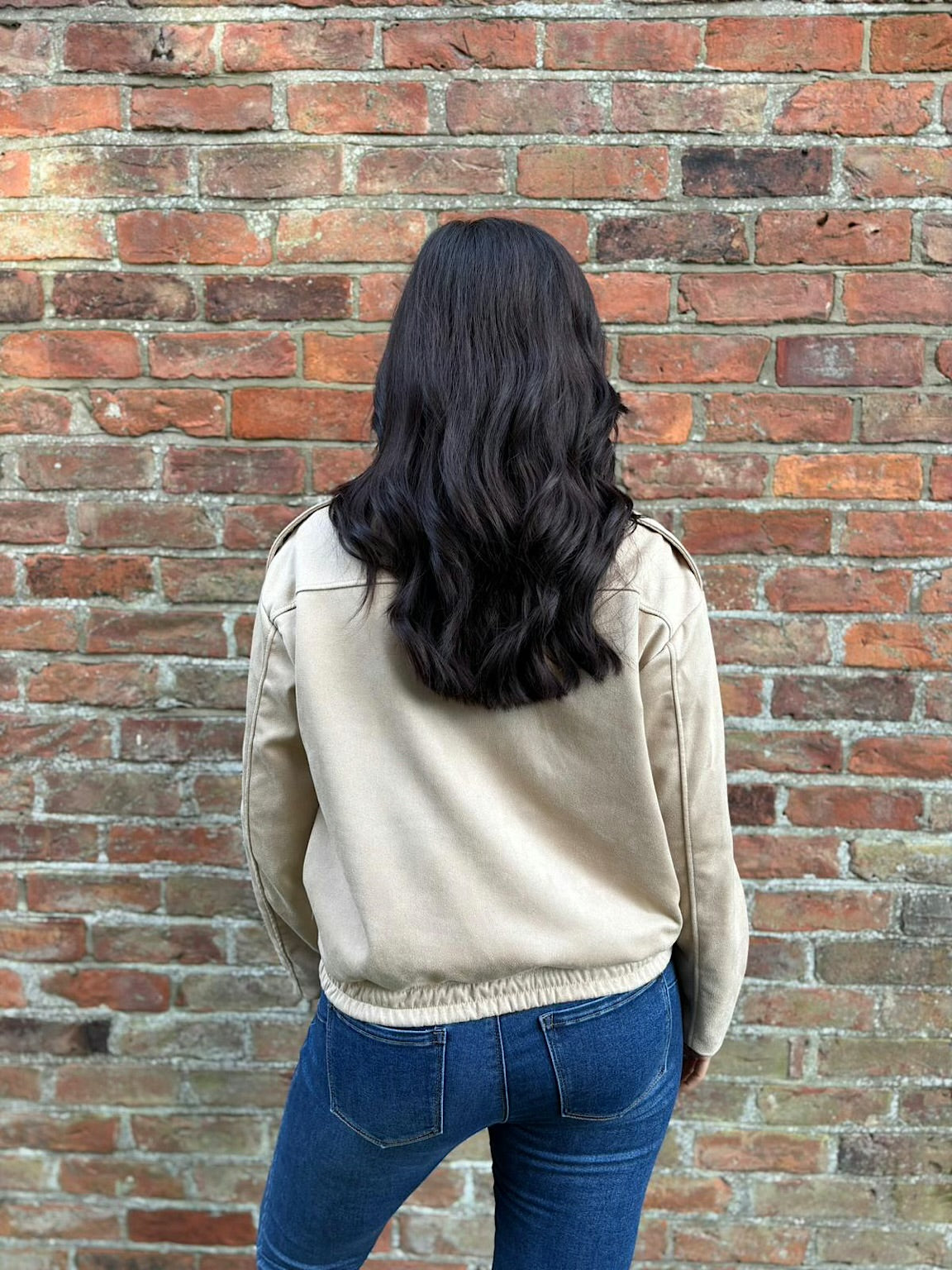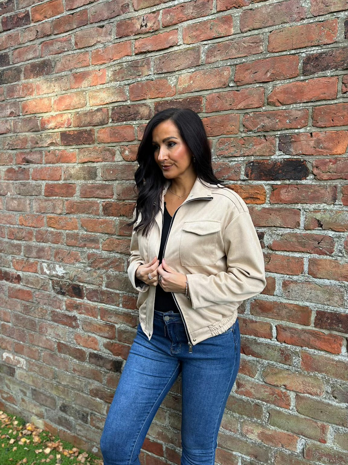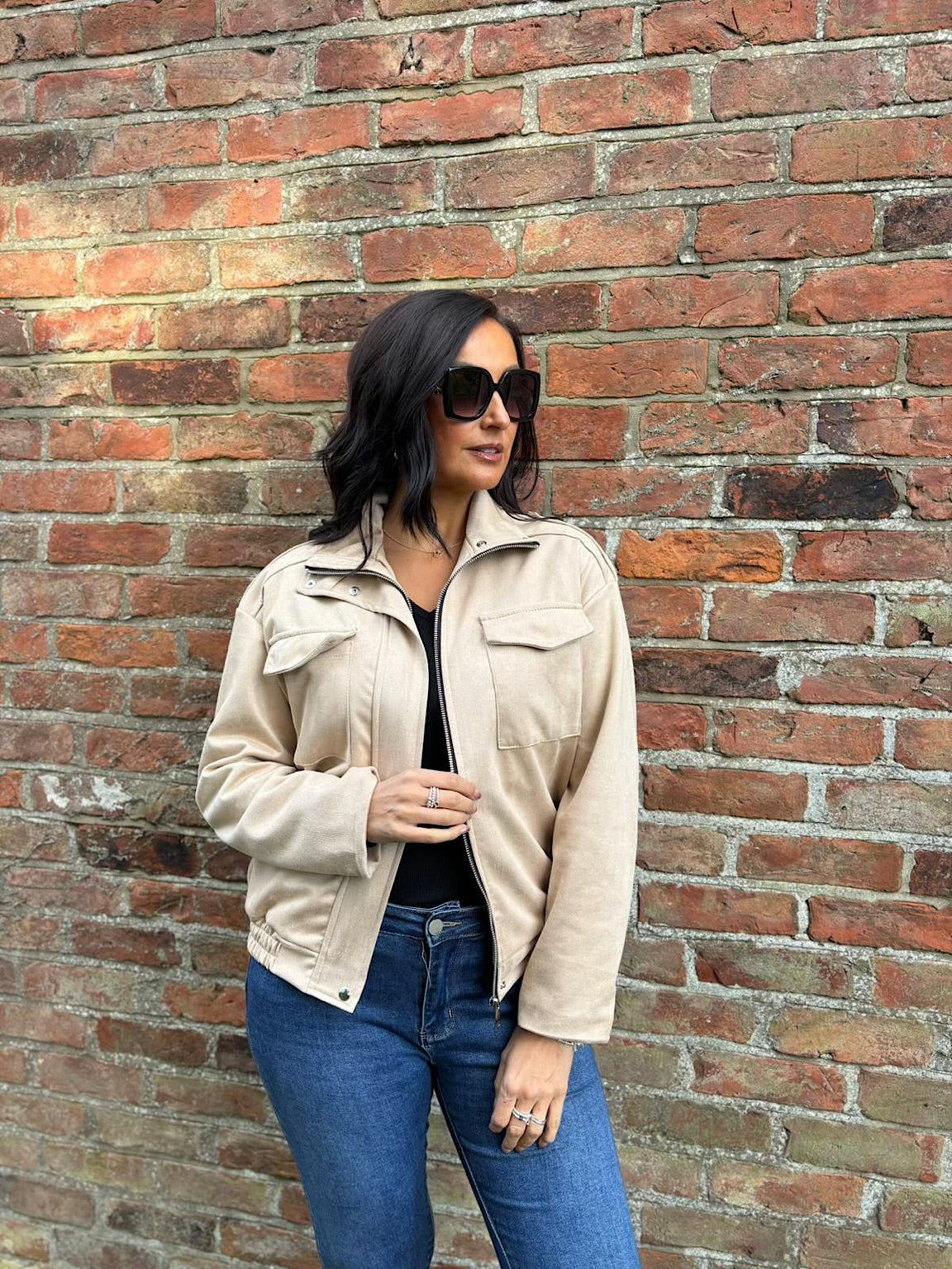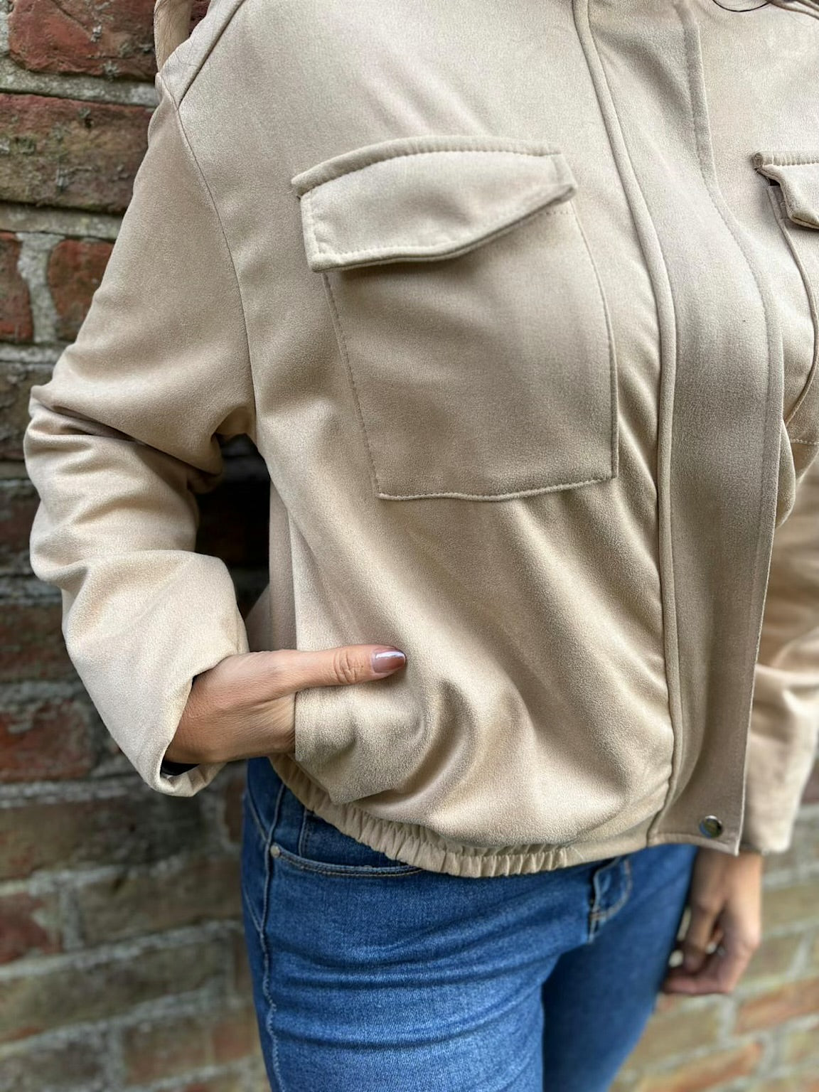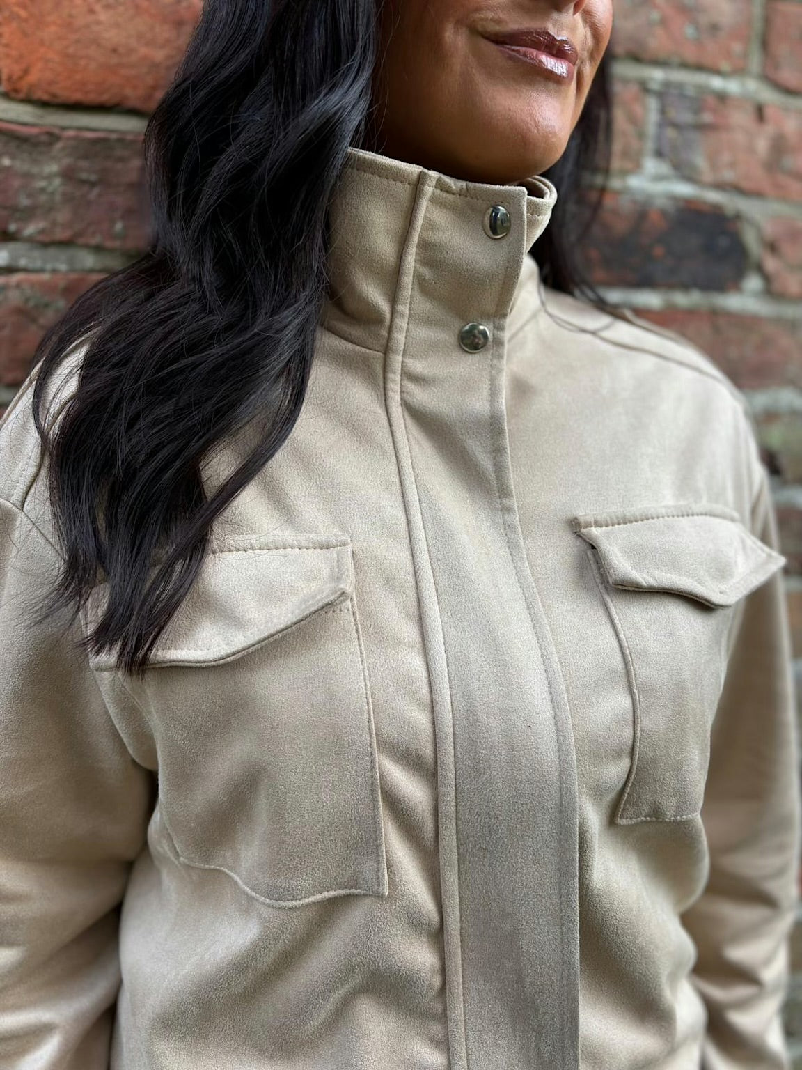 Embrace effortless style with the Chocolate Faux Suede Jacket Shana. Crafted from luxuriously soft faux suede, this versatile piece features a secure zip fastening complemented by a button closure for added peace of mind. The elasticated hem keeps everything in place, while four practical pockets—two at the top and two on the sides—provide convenient storage for your essentials. Comes fully lined. Perfect for layering, this jacket combines comfort with functionality for everyday wear.