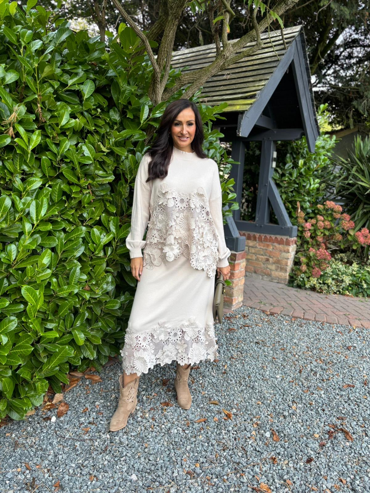 Styled with.....>Black Coated Trousers/ Stone Floral Applique Knit Skirt Dina