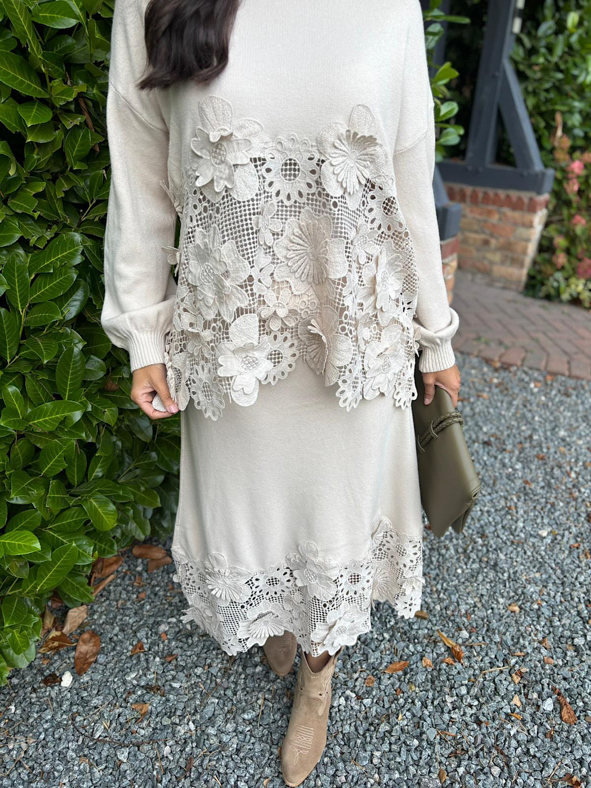 This elegant black knit features a refined crew neck and long sleeves, subtly enhanced by a delicate floral applique decorating the bottom half. Perfect for adding a touch of sophistication to your wardrobe, this piece pairs versatile comfort with artisanal detail.