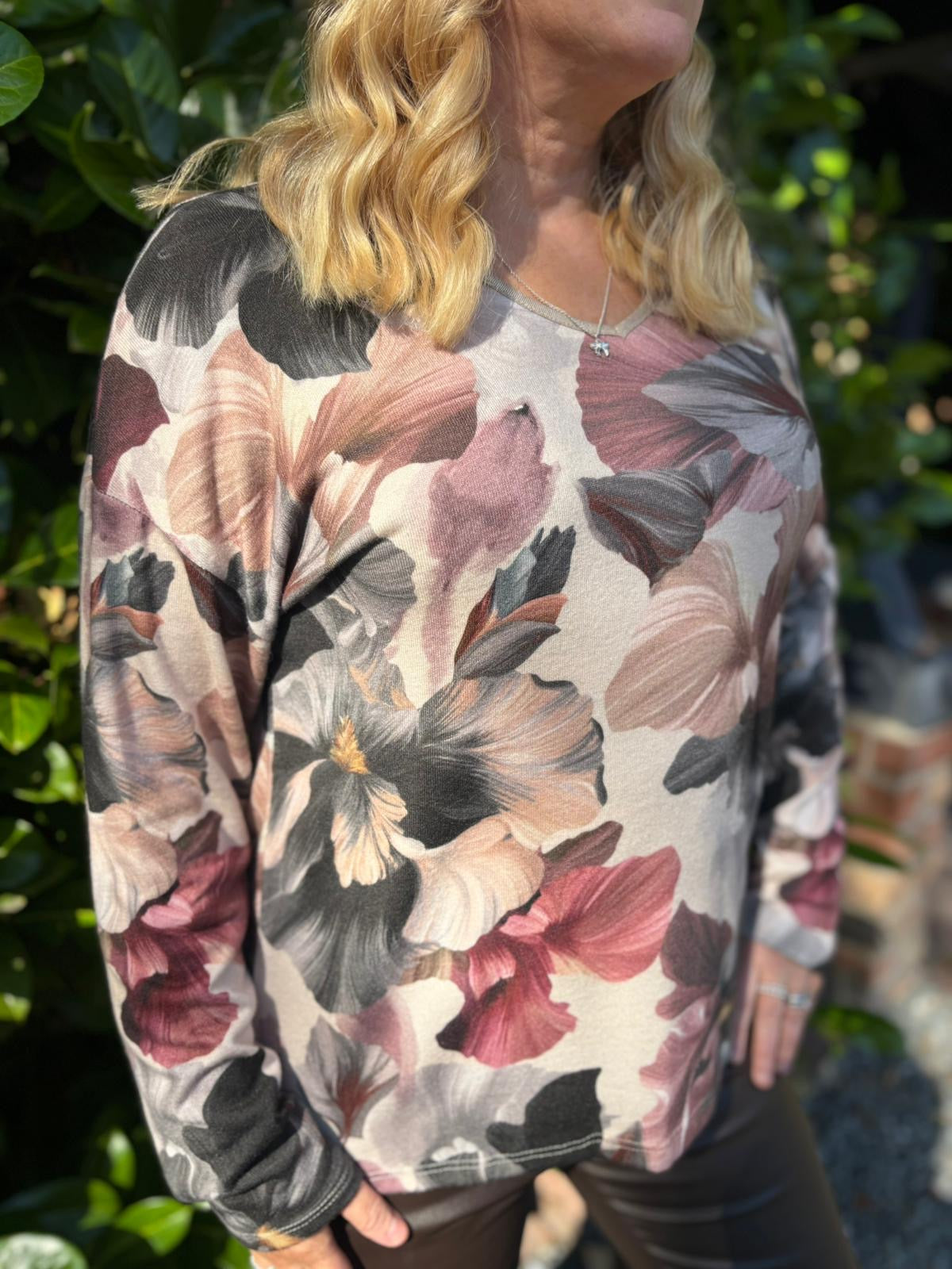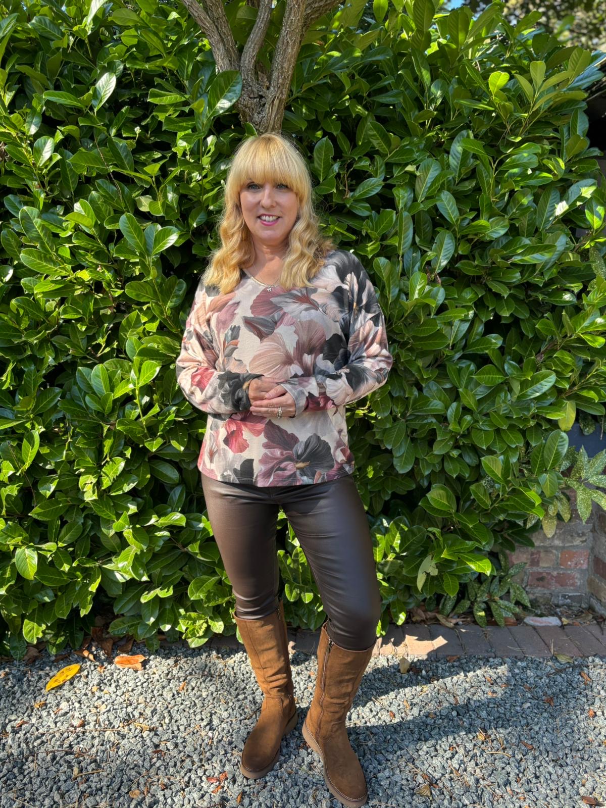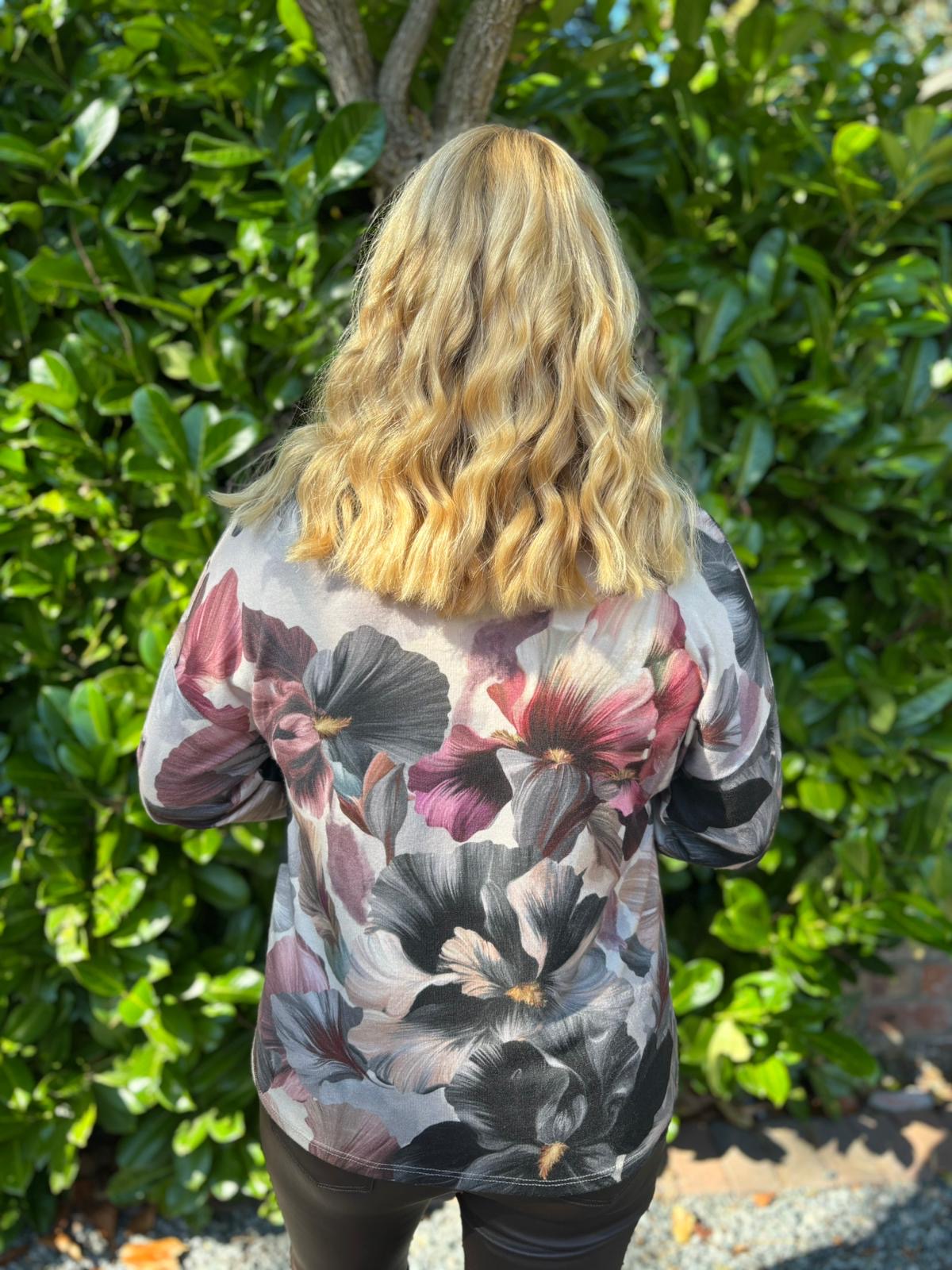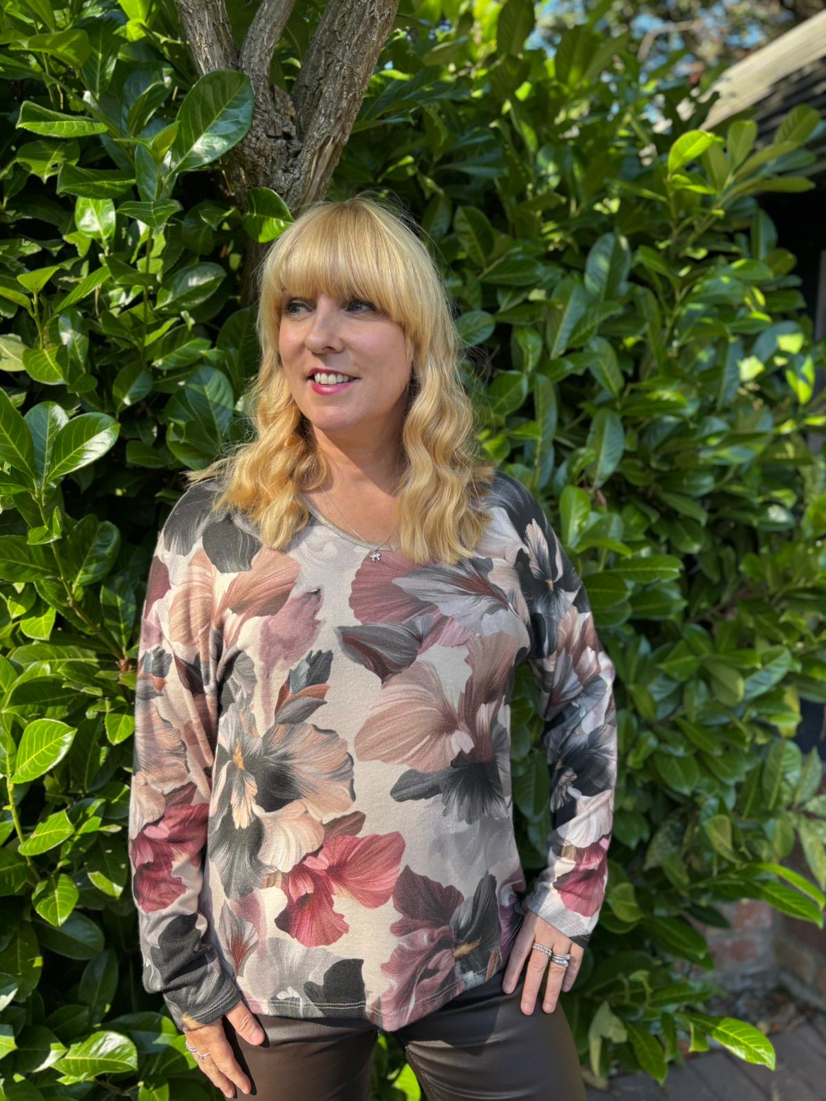 Elevate your wardrobe with the Flower Soft Touch Top Kira, featuring a delicate flower design that adds a refined touch. The long sleeves offer elegant coverage, while the gold sparkle trim along the V-neckline brings a subtle yet sophisticated shimmer. Crafted for comfort and style, this top is perfect for occasions where understated elegance matters.