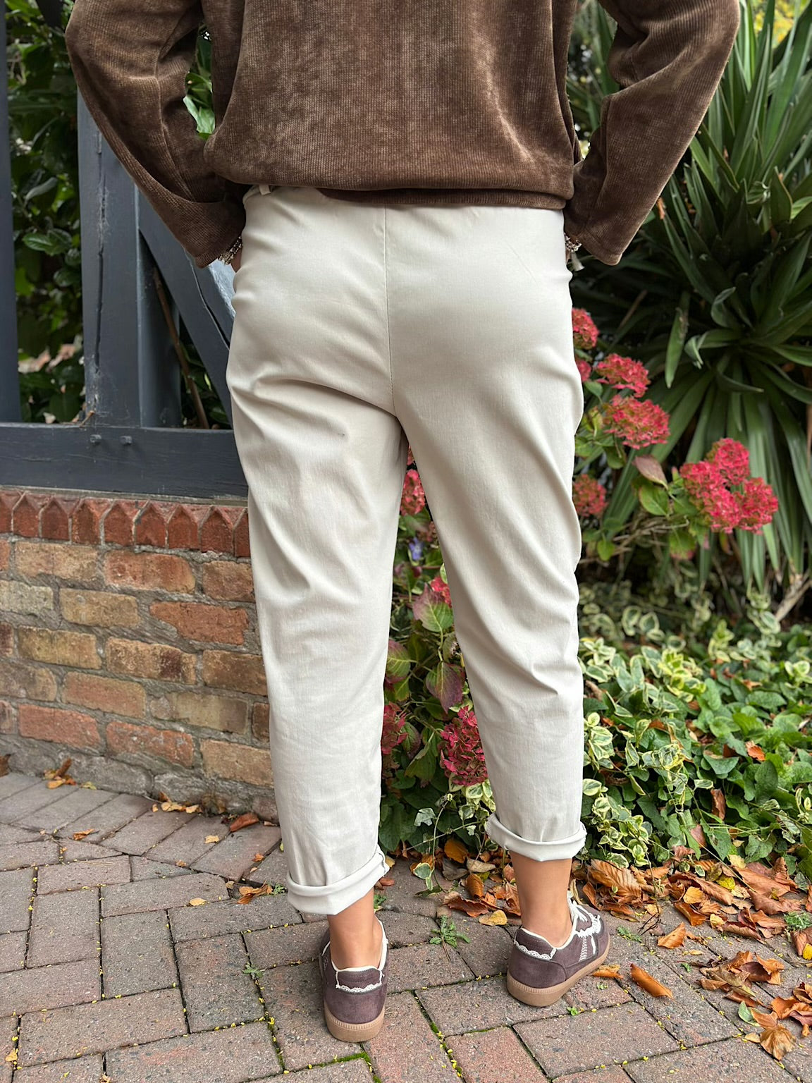 These Frill Pocket Trousers offer a comfortable, flattering fit thanks to their slight stretch fabric reminiscent of our magic trousers, adapting to your shape throughout the day. Featuring delicate frill detailing on the pockets and practical belt loops, they combine subtle style with everyday functionality. Perfect for adding a touch of refined charm to your wardrobe while ensuring all-day comfort.