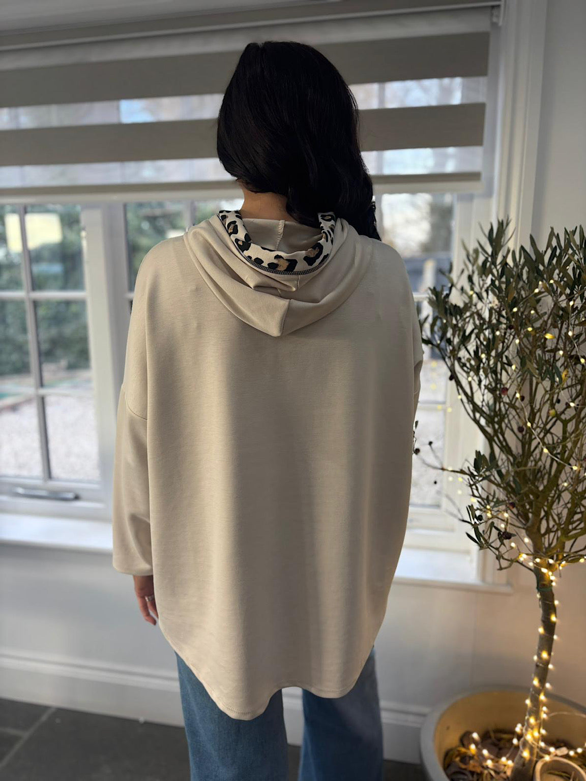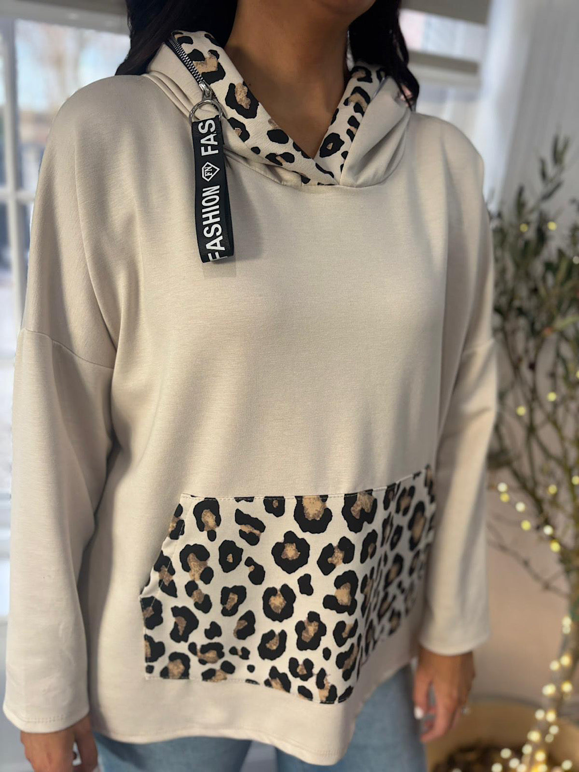 Elevate your casual wardrobe with this versatile hoodie featuring eye-catching leopard pattern detailing on the hood. Crafted from smooth, lightweight fabric that moves with you, it's perfect for layering or wearing solo. Love the leopard trim on the hood? Keep it. Prefer a classic look? Simply zip it off for instant style flexibility. Whether you're heading out for errands or relaxing at home, this hoodie adapts to your mood and your wardrobe needs.