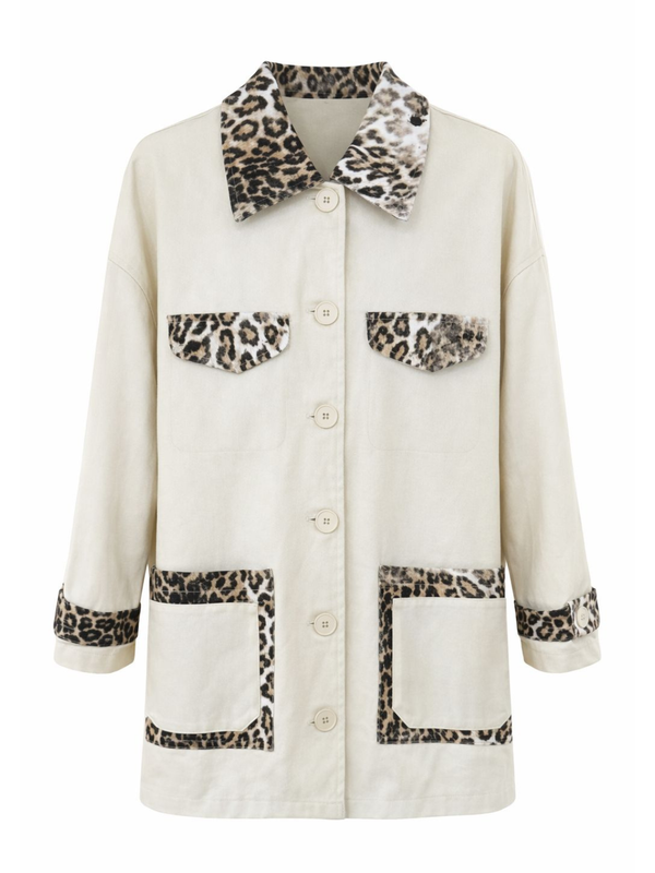 This stone utility jacket delivers authentic denim feel with a contemporary twist. Boasting a soft-touch fabric and full lining, it offers both comfort and durability for everyday wear. The leopard trim detailing brings personality to the classic silhouette, while functional button fastenings and a distinctive sleeve button add utilitarian charm. Versatile enough to layer over anything, it's an essential piece for building effortless, stylish outfits.