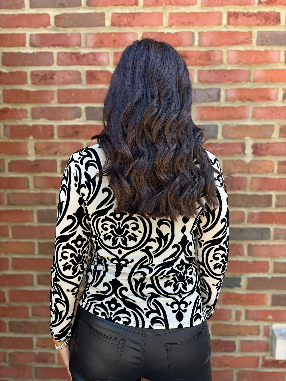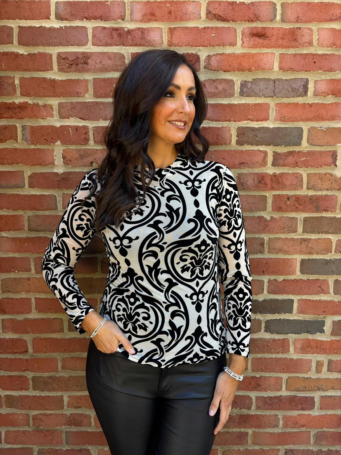 Elevate your wardrobe with the Printed Mesh Top Helen, featuring a delicate printed mesh fabric that offers subtle sophistication. Its long sleeves provide graceful coverage while maintaining a lightweight, breathable feel, perfect for layering or wearing alone. This elegant piece adds a refined touch to any outfit, seamlessly blending style with comfort.