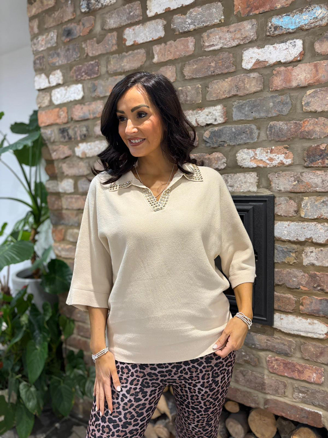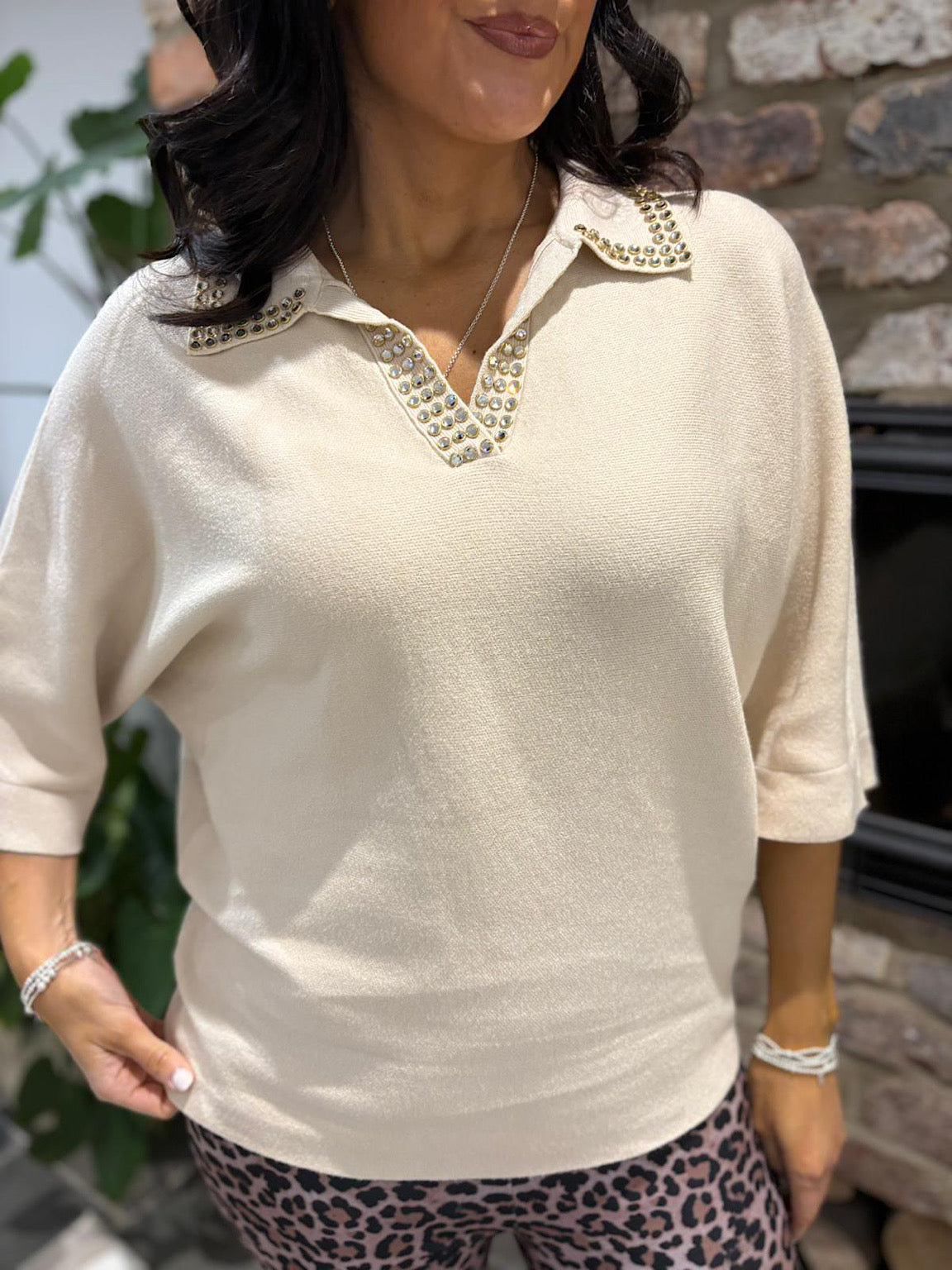 Introducing the Relaxed Collared Knit Abbie – your new go-to piece for effortless style. This beautifully crafted knit features a relaxed collar that brings a laid-back elegance to your everyday wardrobe, while delicate jewel embellishments add a touch of sparkle and sophistication. Perfect for dressing up or down. The soft knit fabric feels wonderful against your skin, making it as comfortable as it is chic. Whether you're heading to the office or out for the evening, Abbie delivers understated glamour with a modern twist.