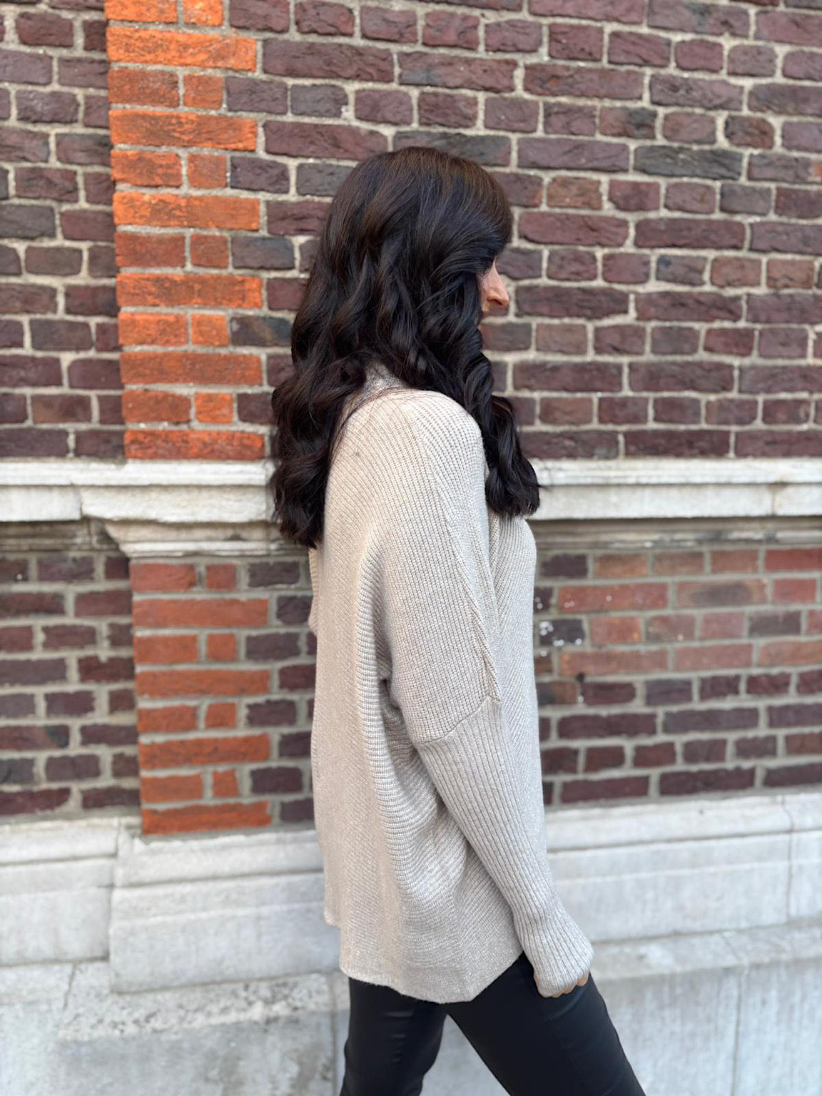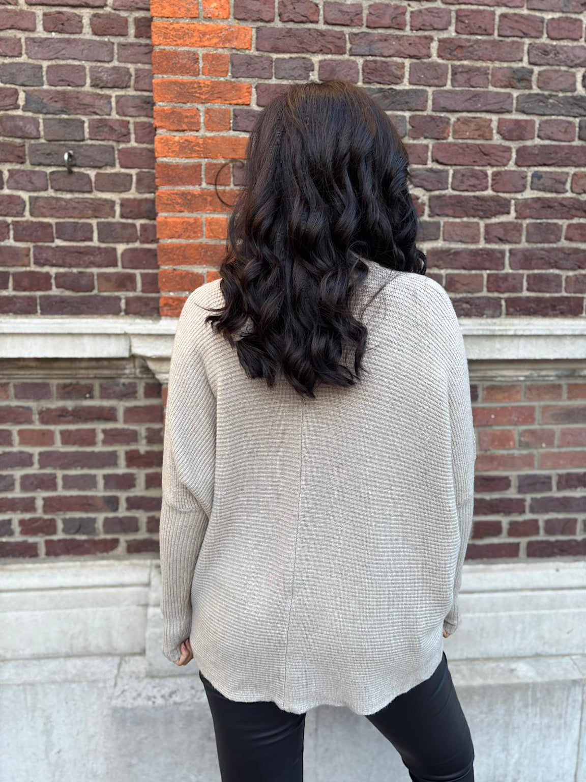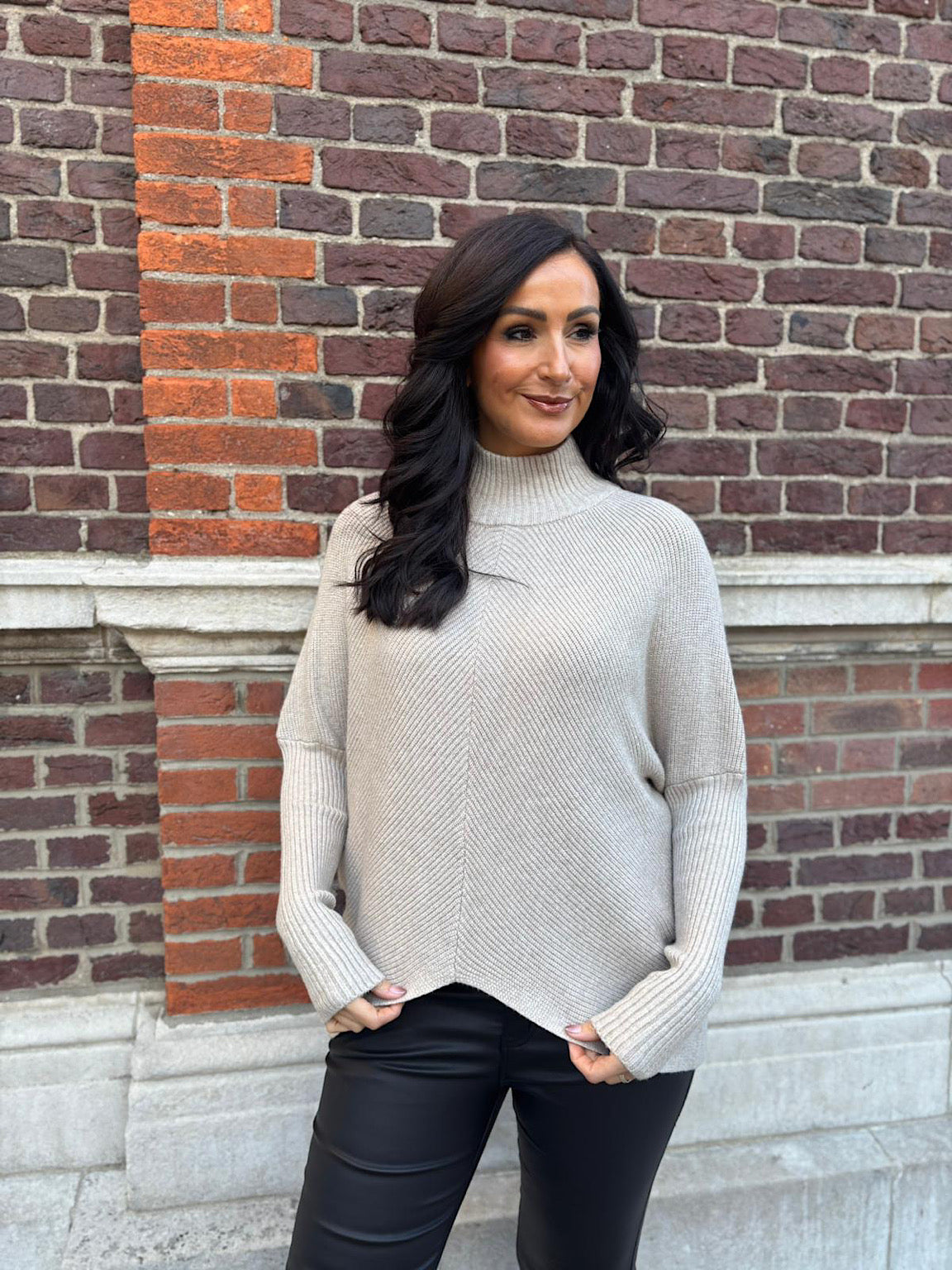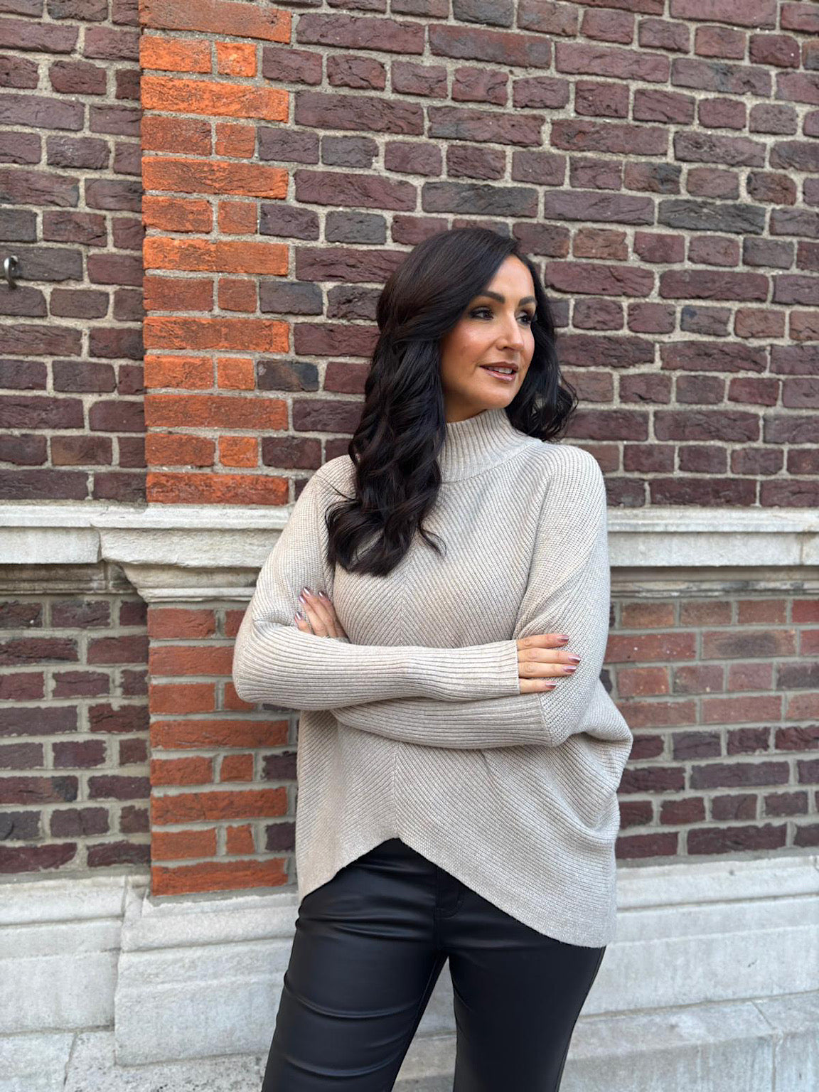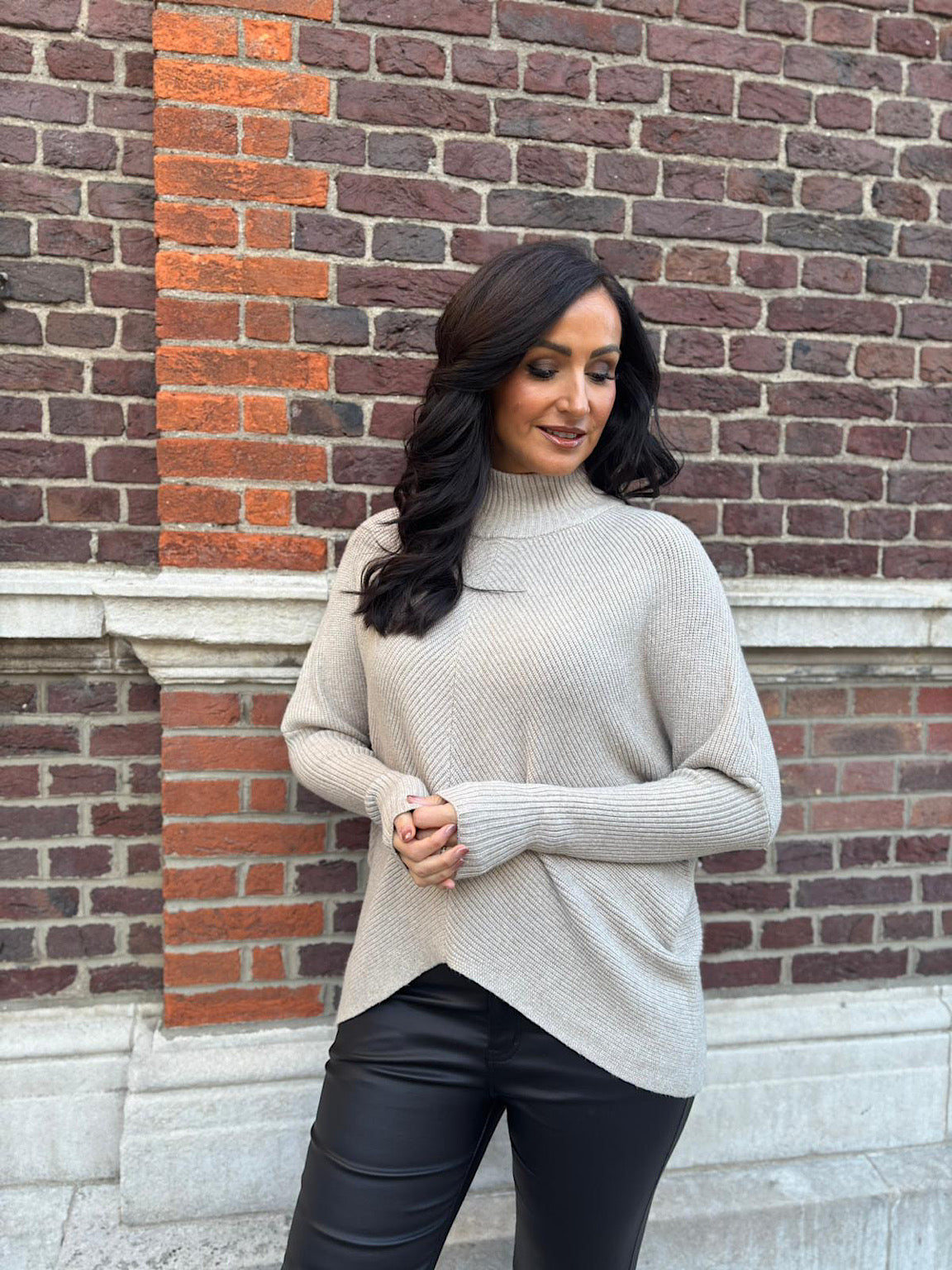 Experience comfort and style with the Ribbed Dip Hem Jumper Vicky. Made from soft, high-quality spacious fabric, this jumper features a sophisticated chevron knit design and a ribbed high neck for extra warmth. The unique high-low hem and tube sleeves offer a flattering fit that moves with you, making it perfect for layering or wearing on its own during cooler days.