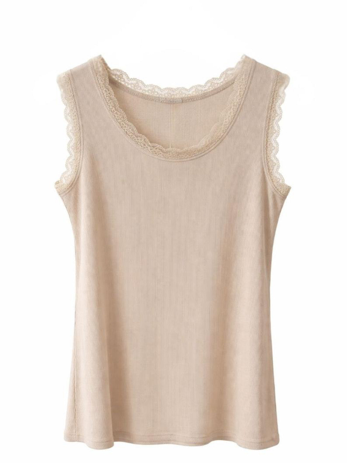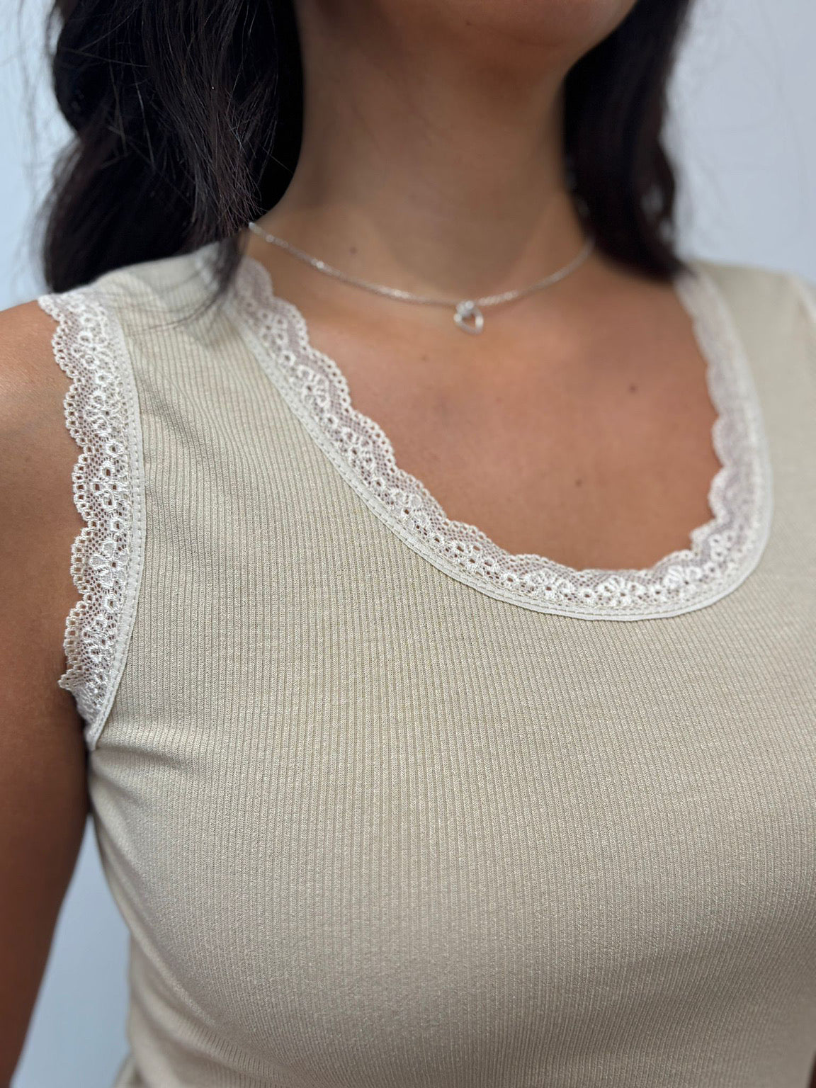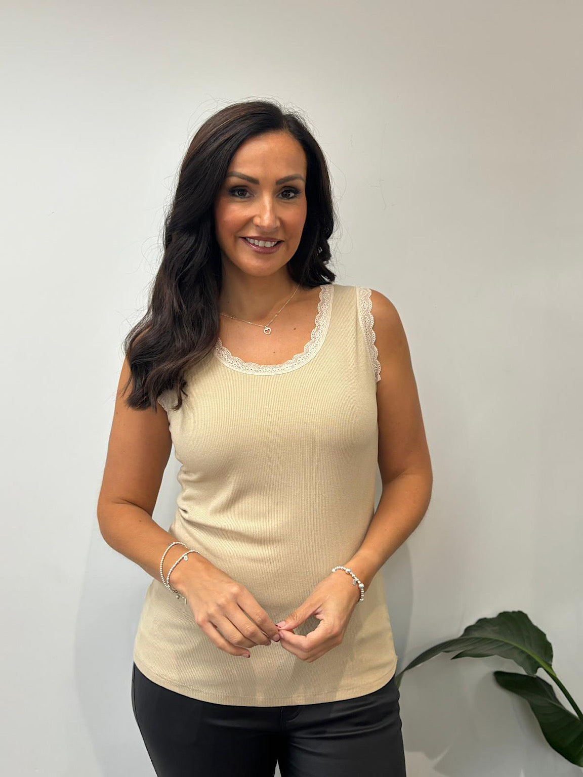 Expertly crafted with delicate lace on the neckline and sleeves, the Ribbed Lace Vest Trina adds a feminine touch to any outfit. Its fine ribbed texture elevates this basic style, creating a timeless and sophisticated look. Perfect for those who appreciate quality design and attention to detail.