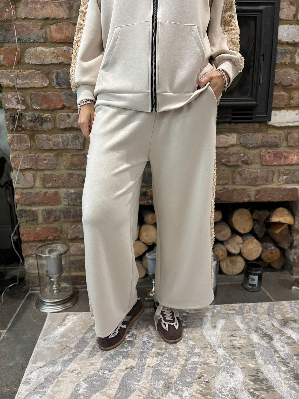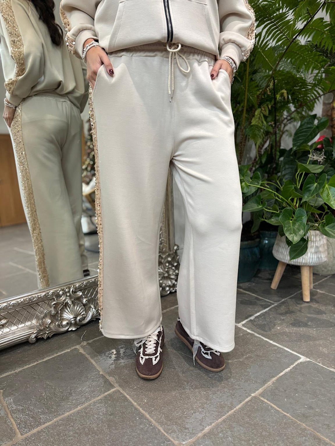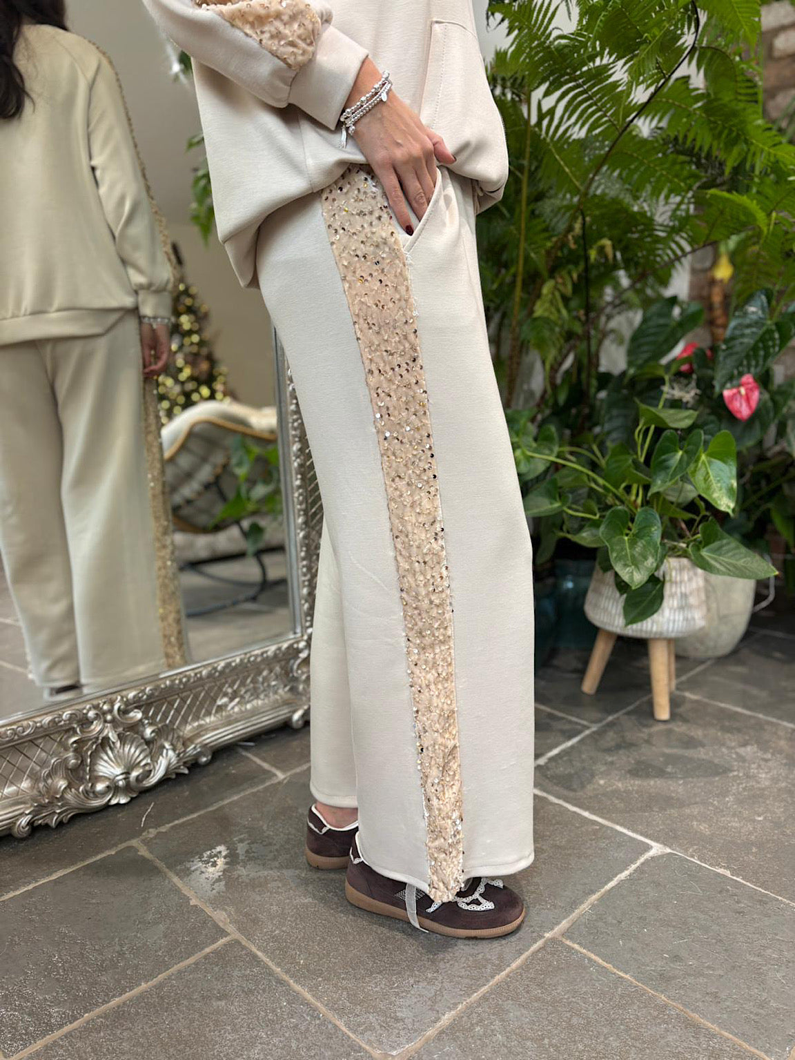Elevate your loungewear with these Sequin Velour Trim Joggers Trixie. Crafted from the same soft, comfortable material you love from our Esme collection, these joggers feature a striking sequin velour panel running down each side for a touch of glamour. The adjustable drawstring waist ensures a perfect fit for all-day comfort, whether you're relaxing at home or stepping out in style.