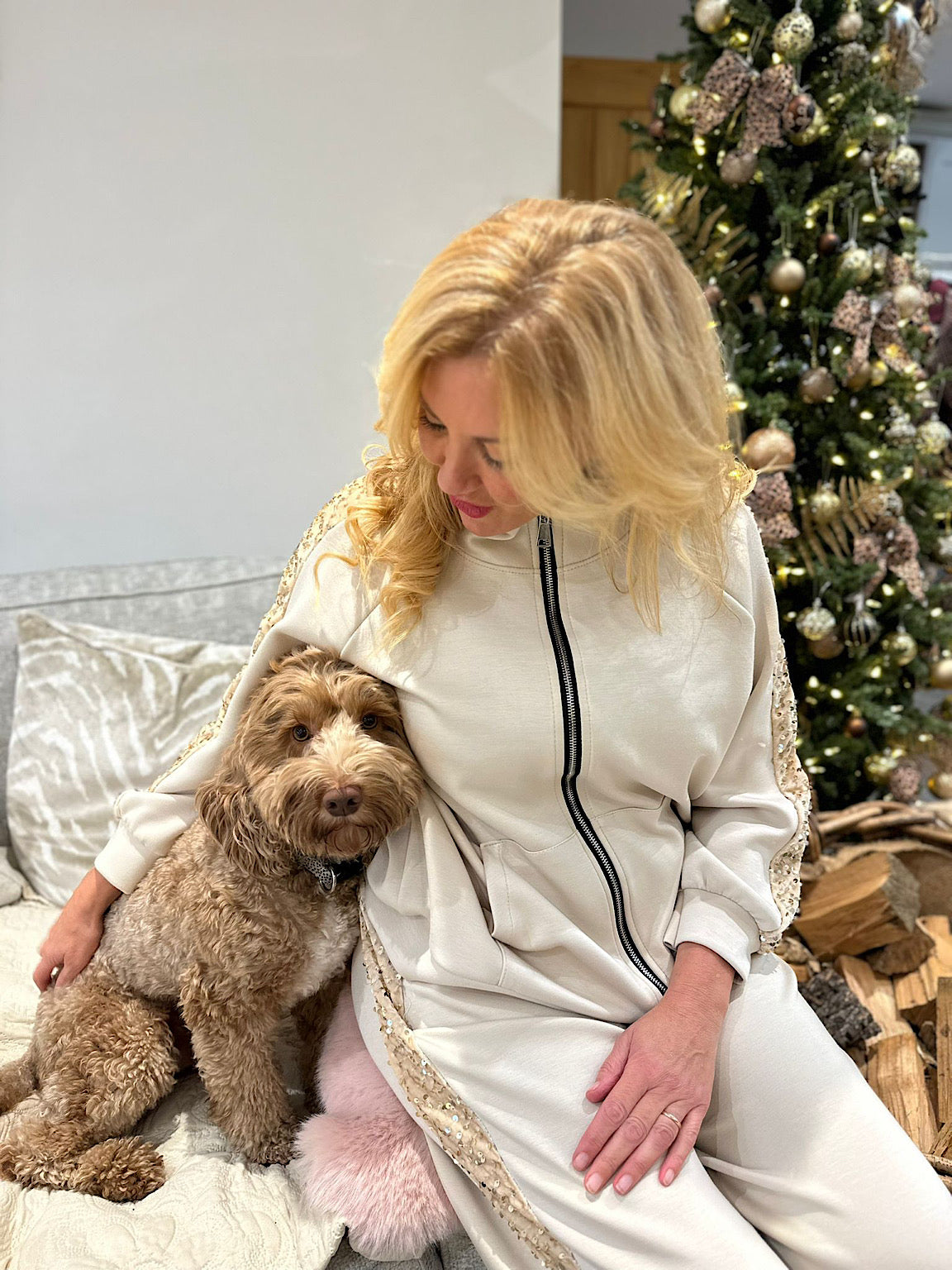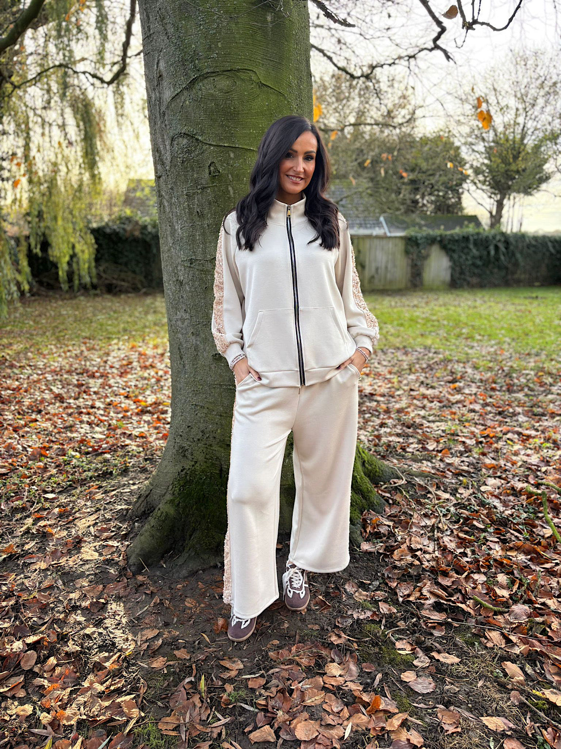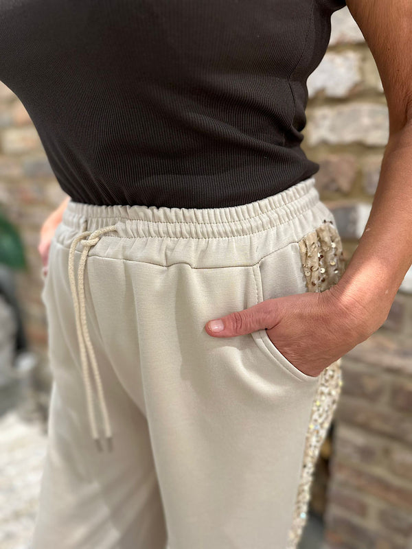 Elevate your loungewear with these Sequin Velour Trim Joggers Trixie. Crafted from the same soft, comfortable material you love from our Esme collection, these joggers feature a striking sequin velour panel running down each side for a touch of glamour. The adjustable drawstring waist ensures a perfect fit for all-day comfort, whether you're relaxing at home or stepping out in style.