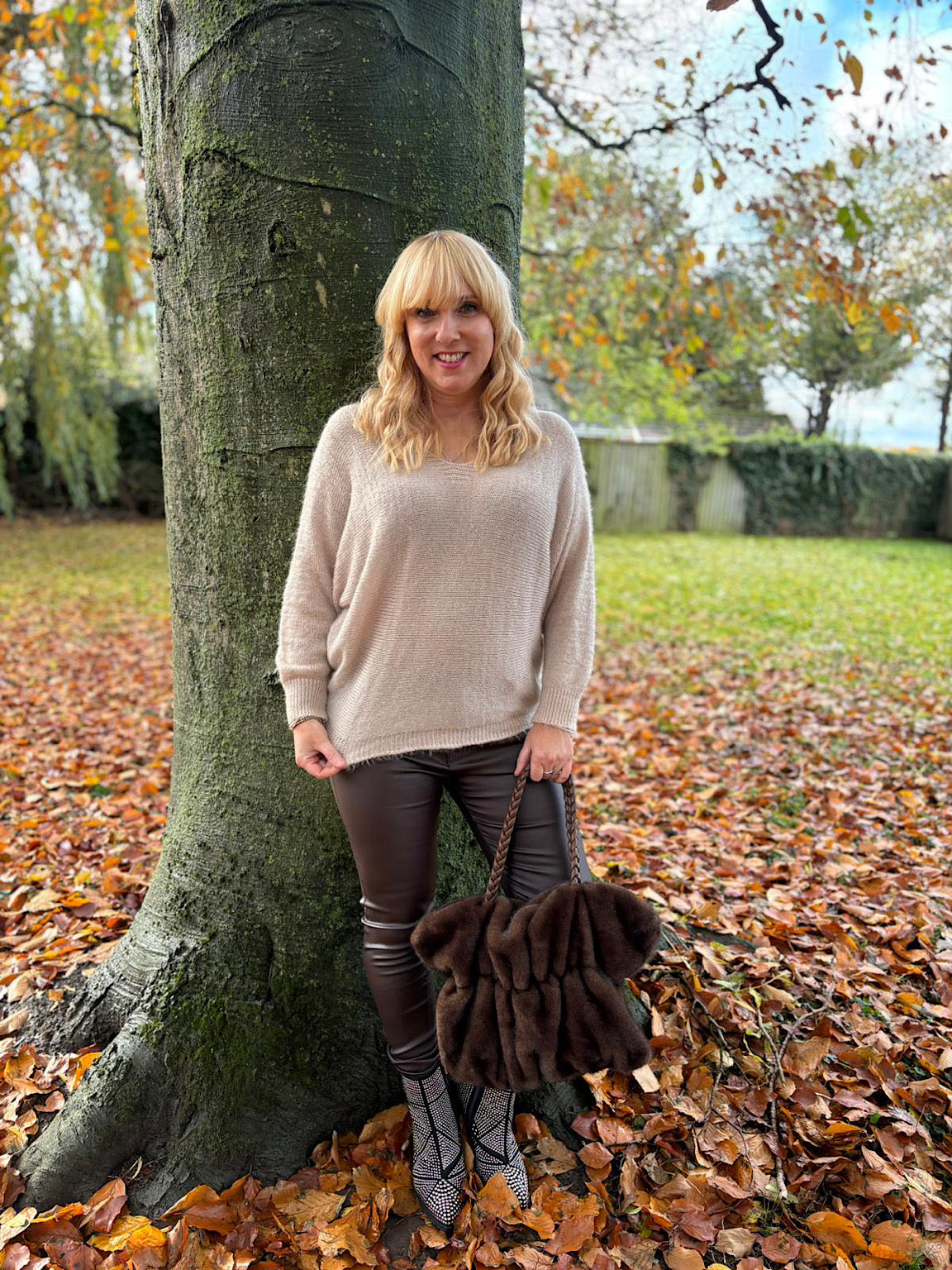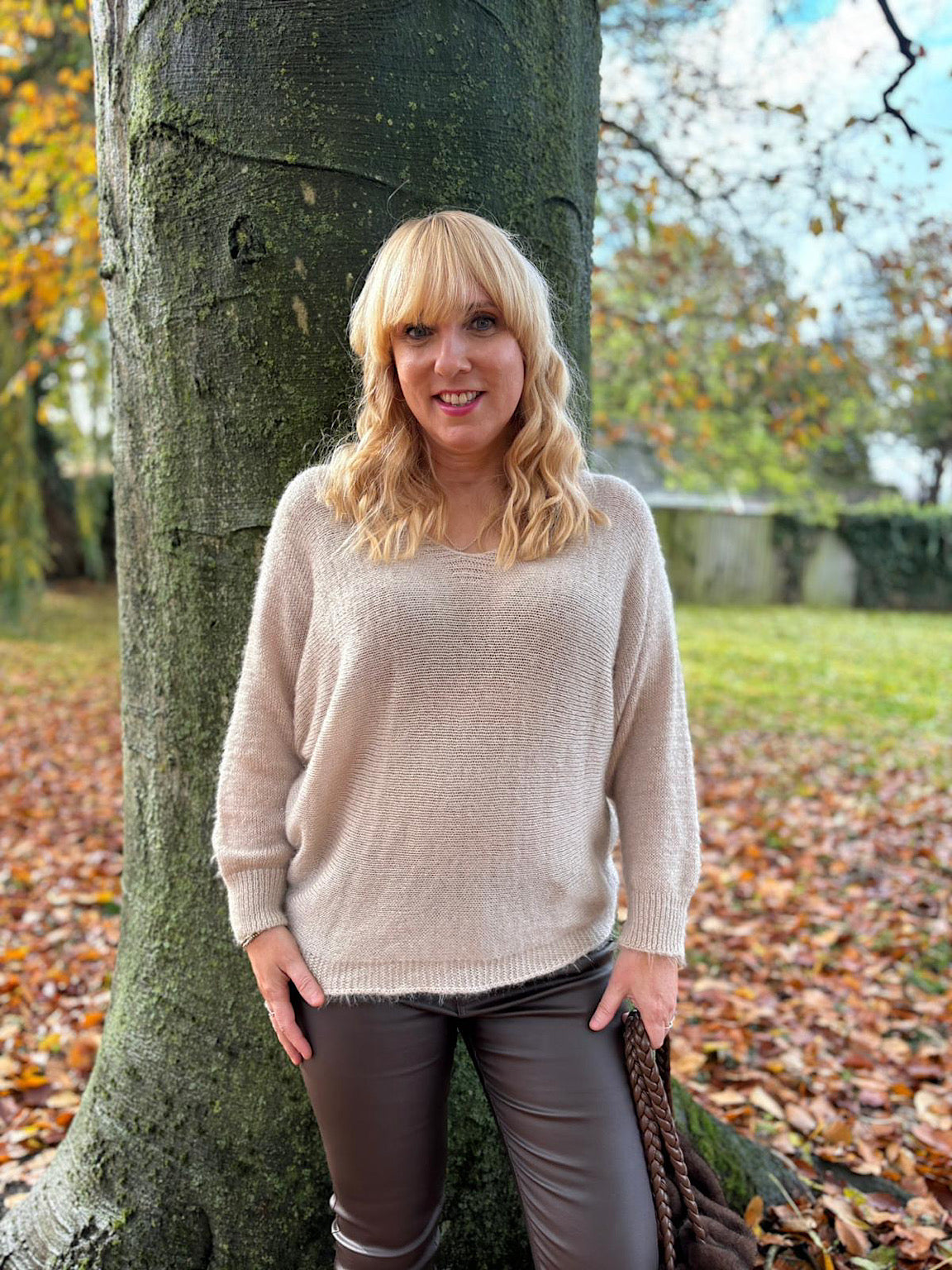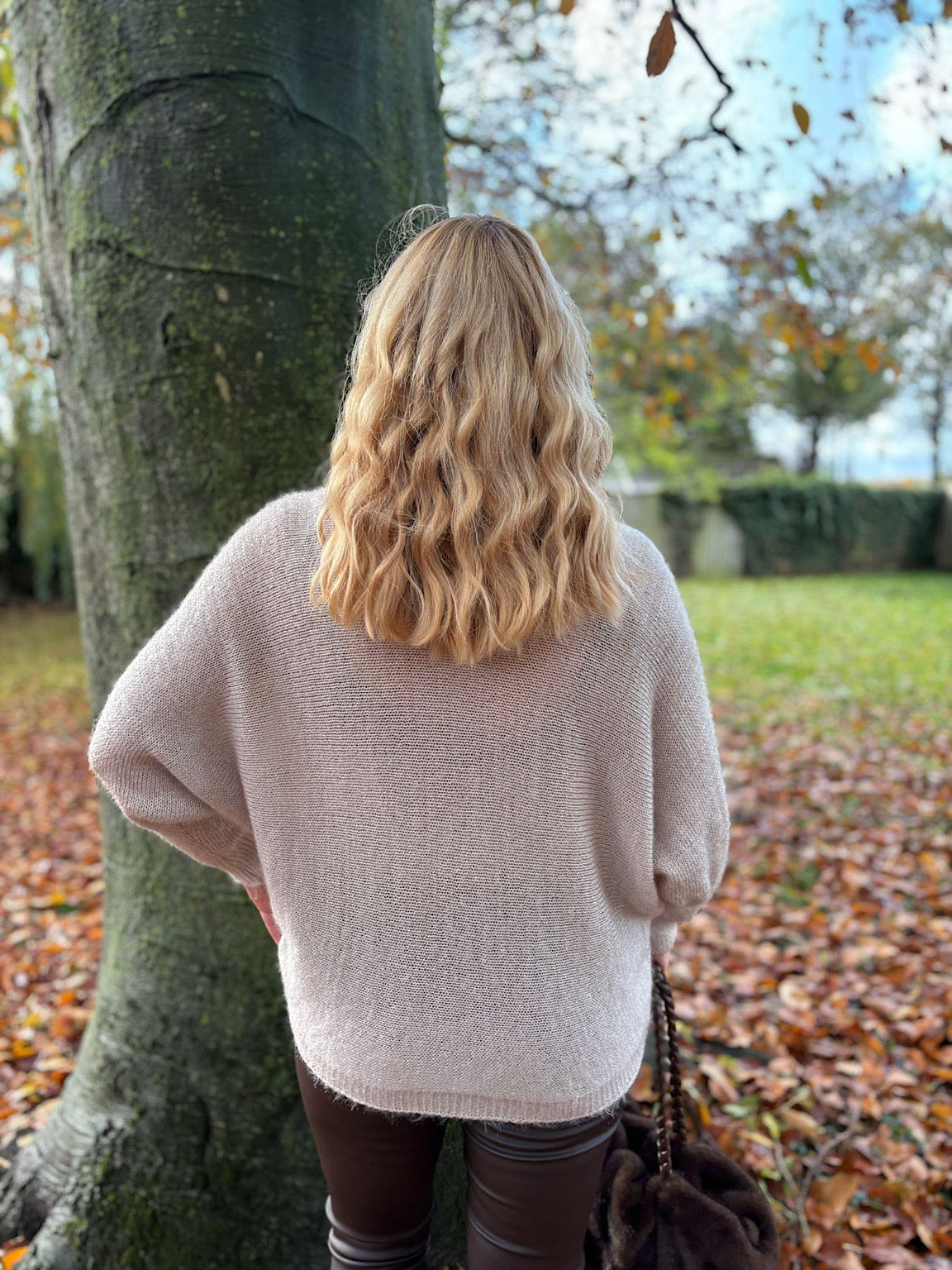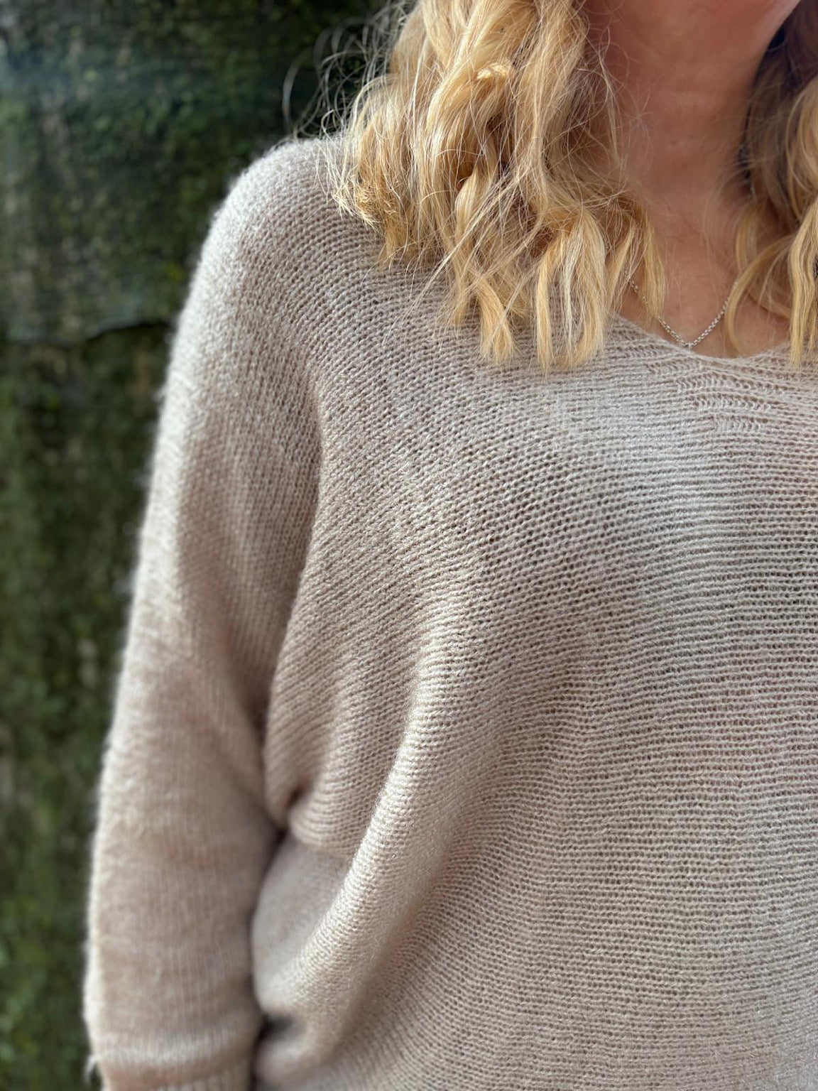 Elevate your everyday wardrobe with this V-neck knit featuring luxurious batwing sleeves that drape beautifully. Delicate lurex sparkle threads shimmer throughout the fabric, adding subtle glamour to a timeless silhouette. Perfect for layering or wearing solo, Seren brings effortless sophistication to any occasion. The soft construction ensures all-day comfort, while the shimmering detail catches the light with every movement.