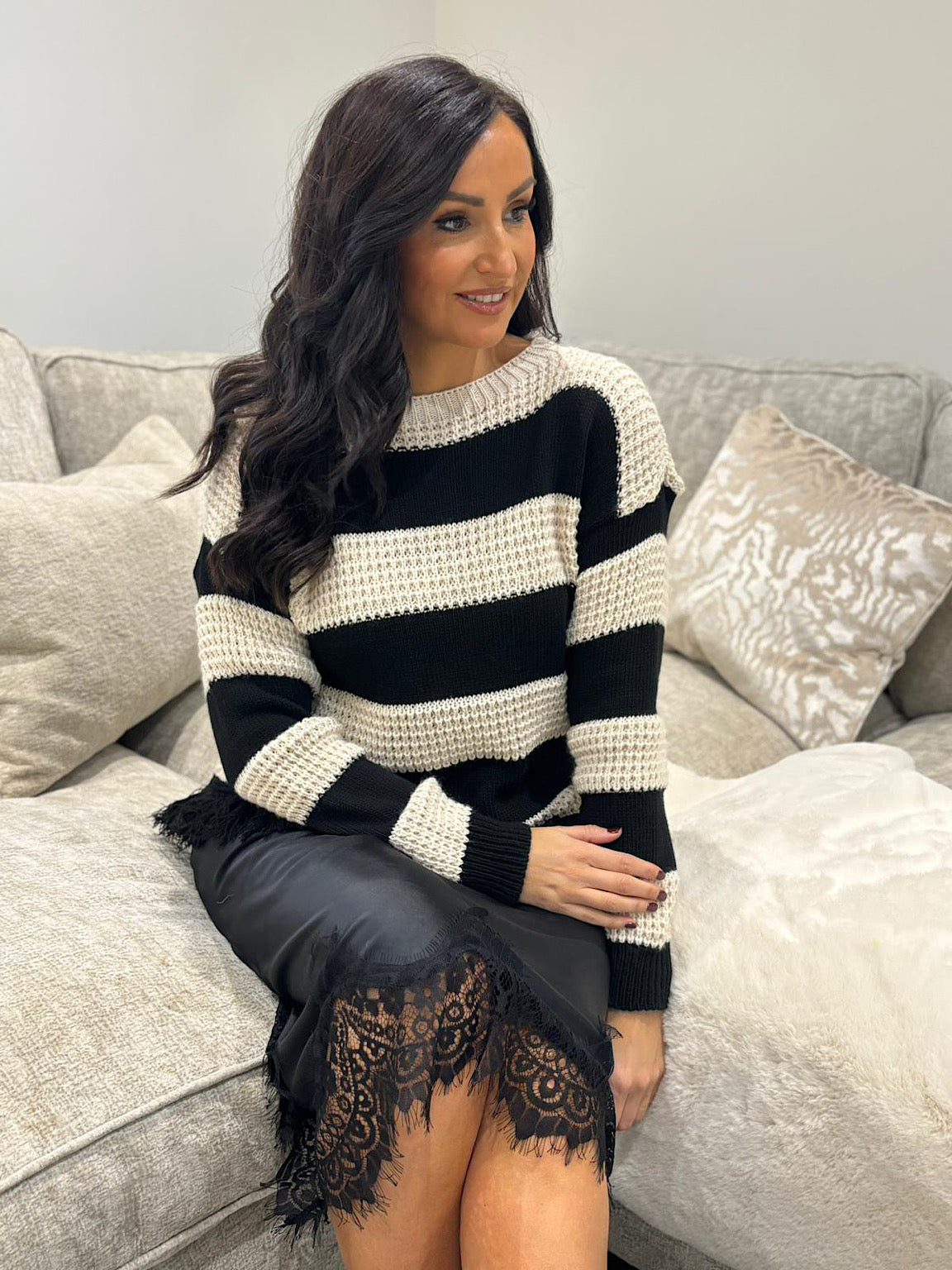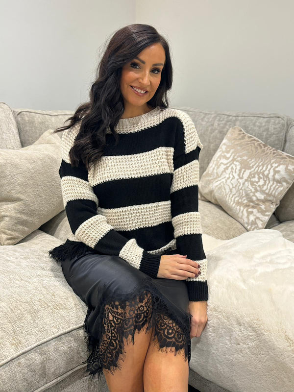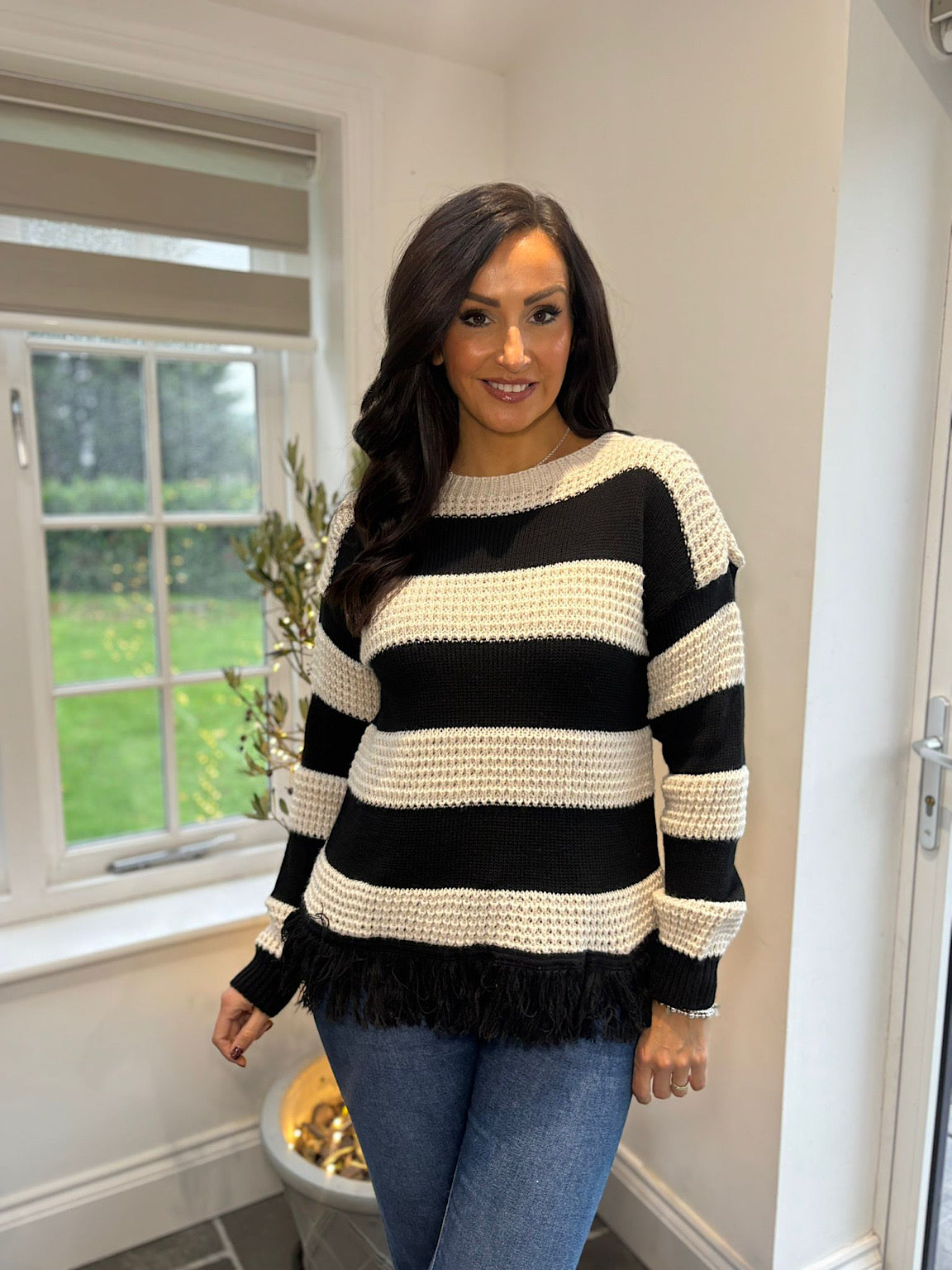 The Stone Stripe Fringed Knit Robyn combines timeless style with thoughtful design details. Its classic stripe pattern creates visual depth, while the fringed hem adds a playful, textured finish that elevates the everyday knit. Perfect for layering or wearing solo, this piece brings effortless sophistication to your wardrobe. The supportive structure of quality knitwear means you'll reach for it again and again, season after season.