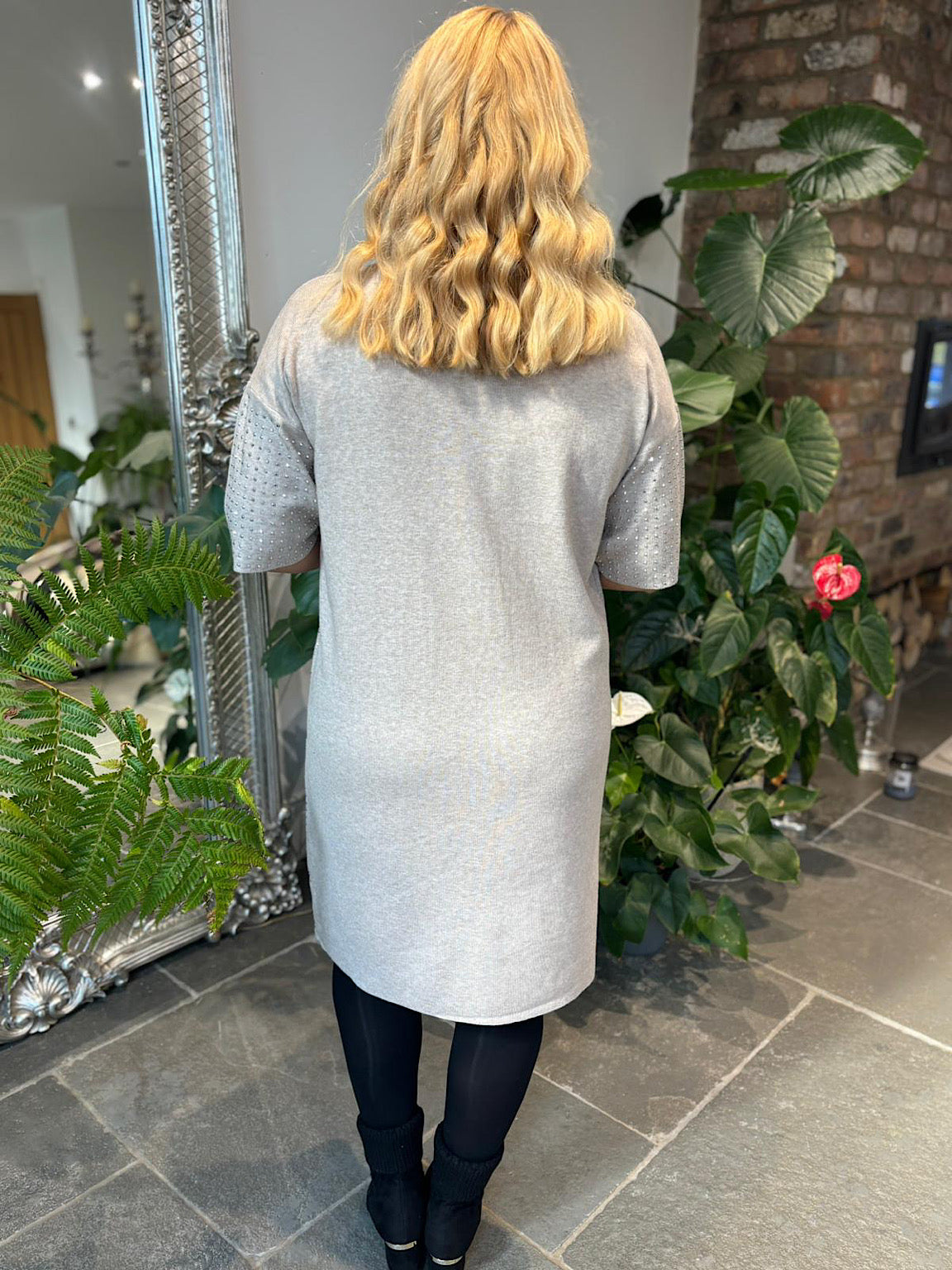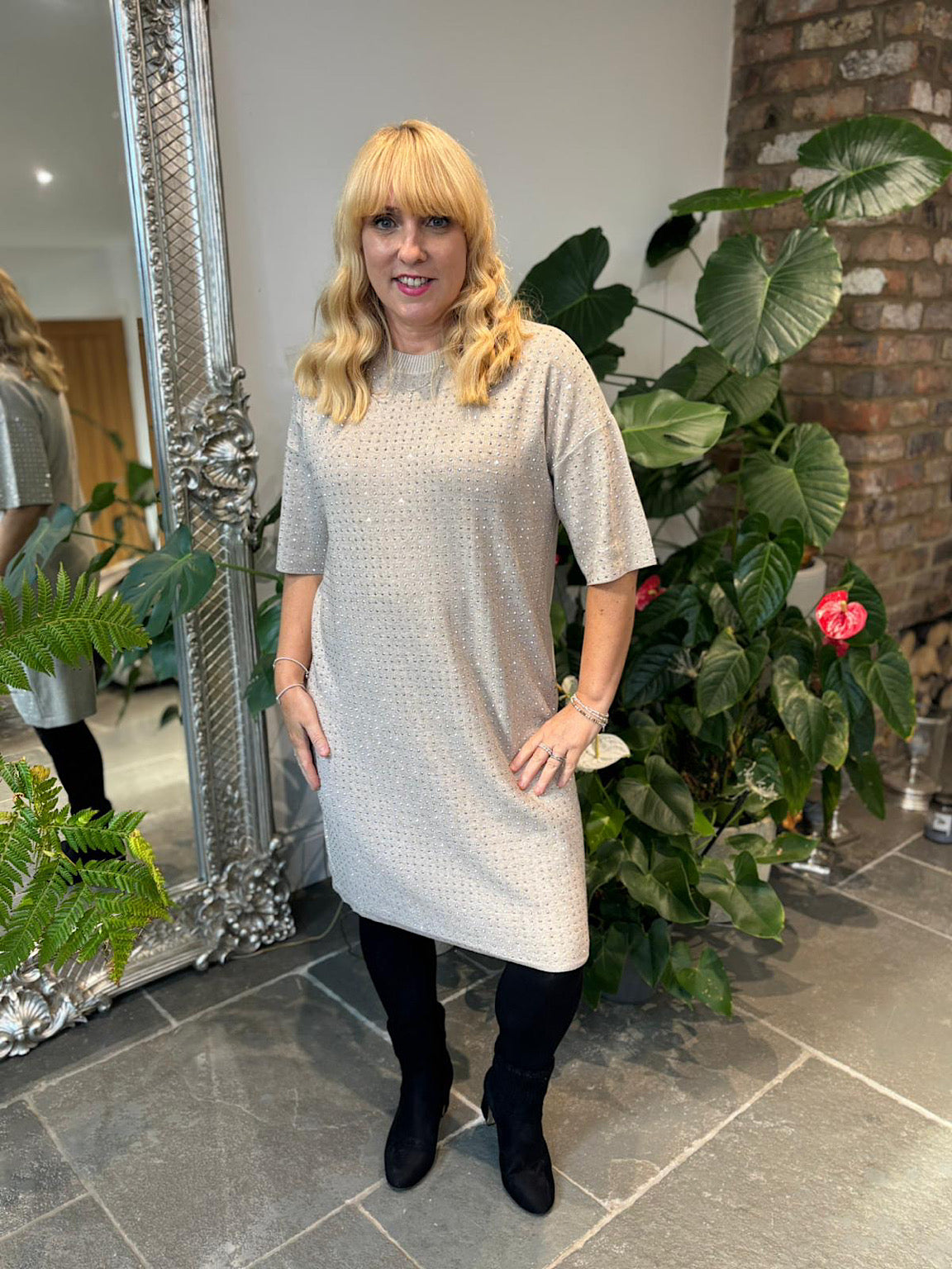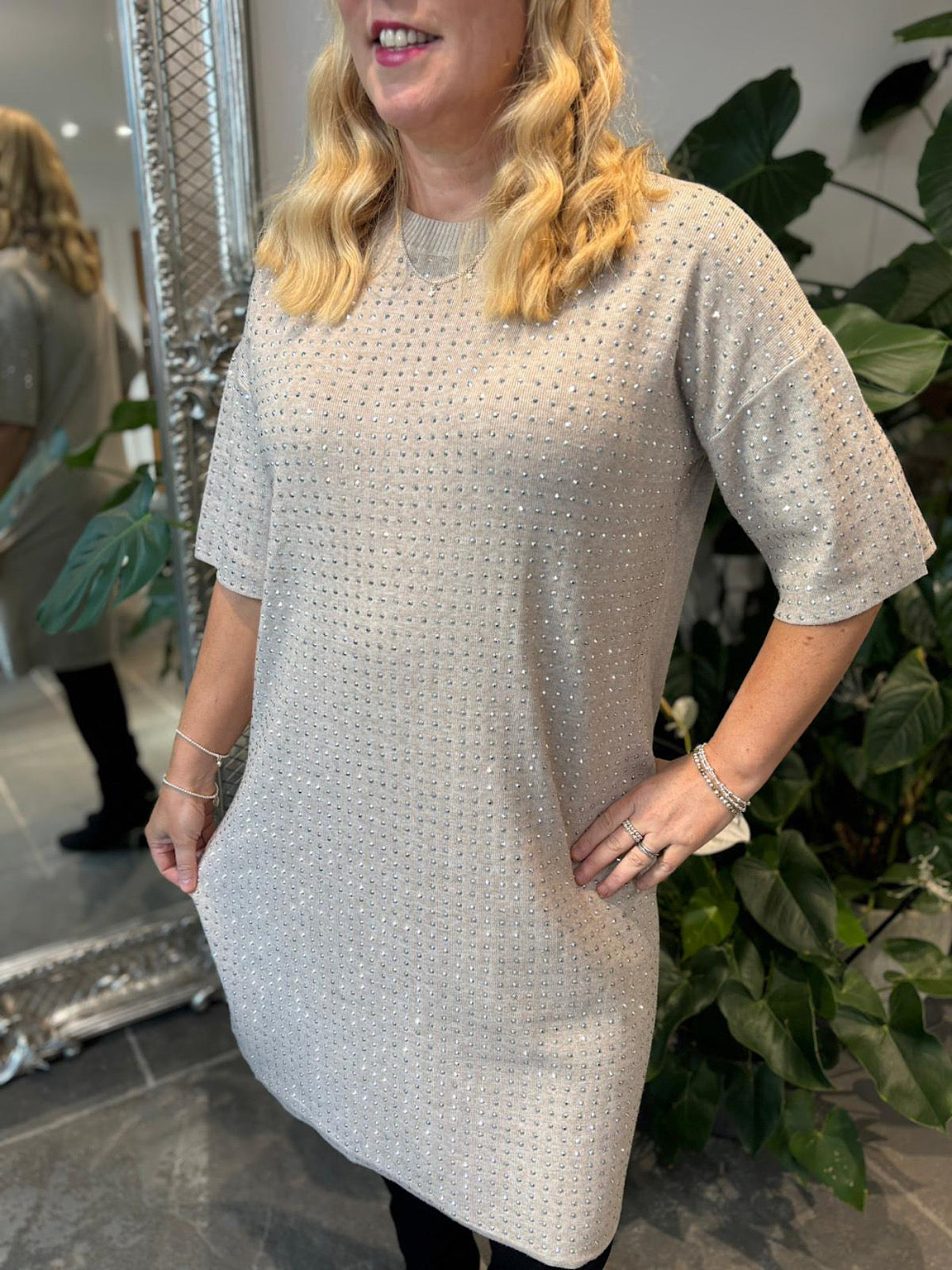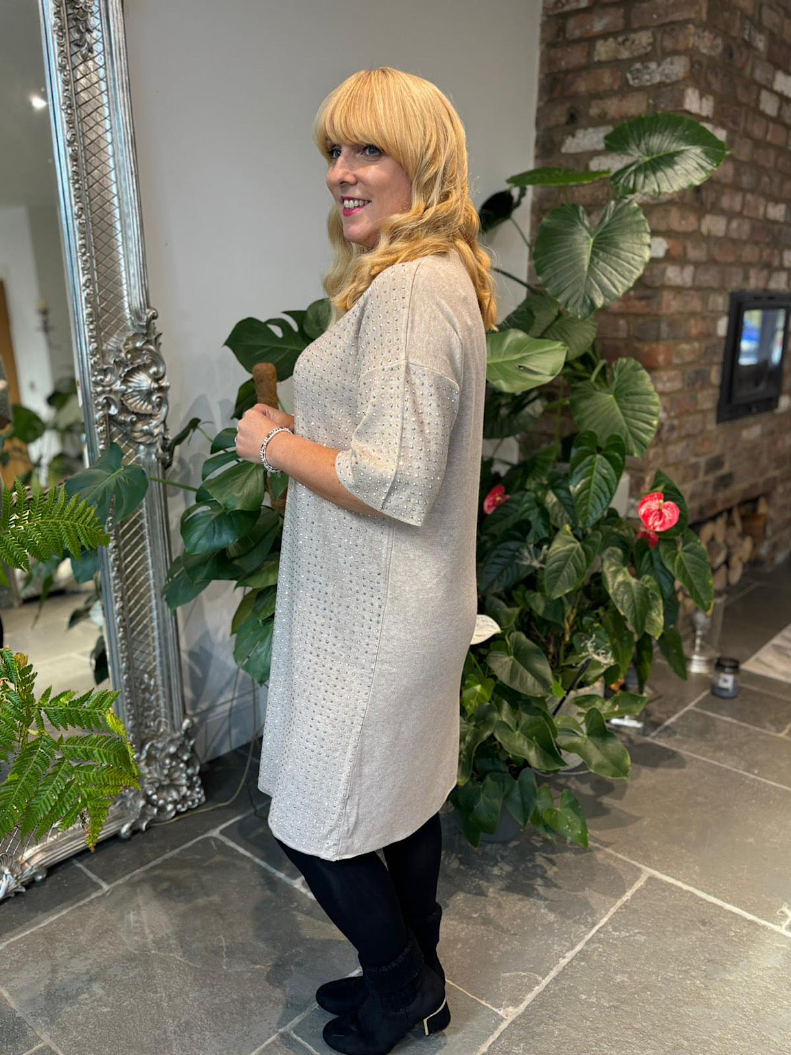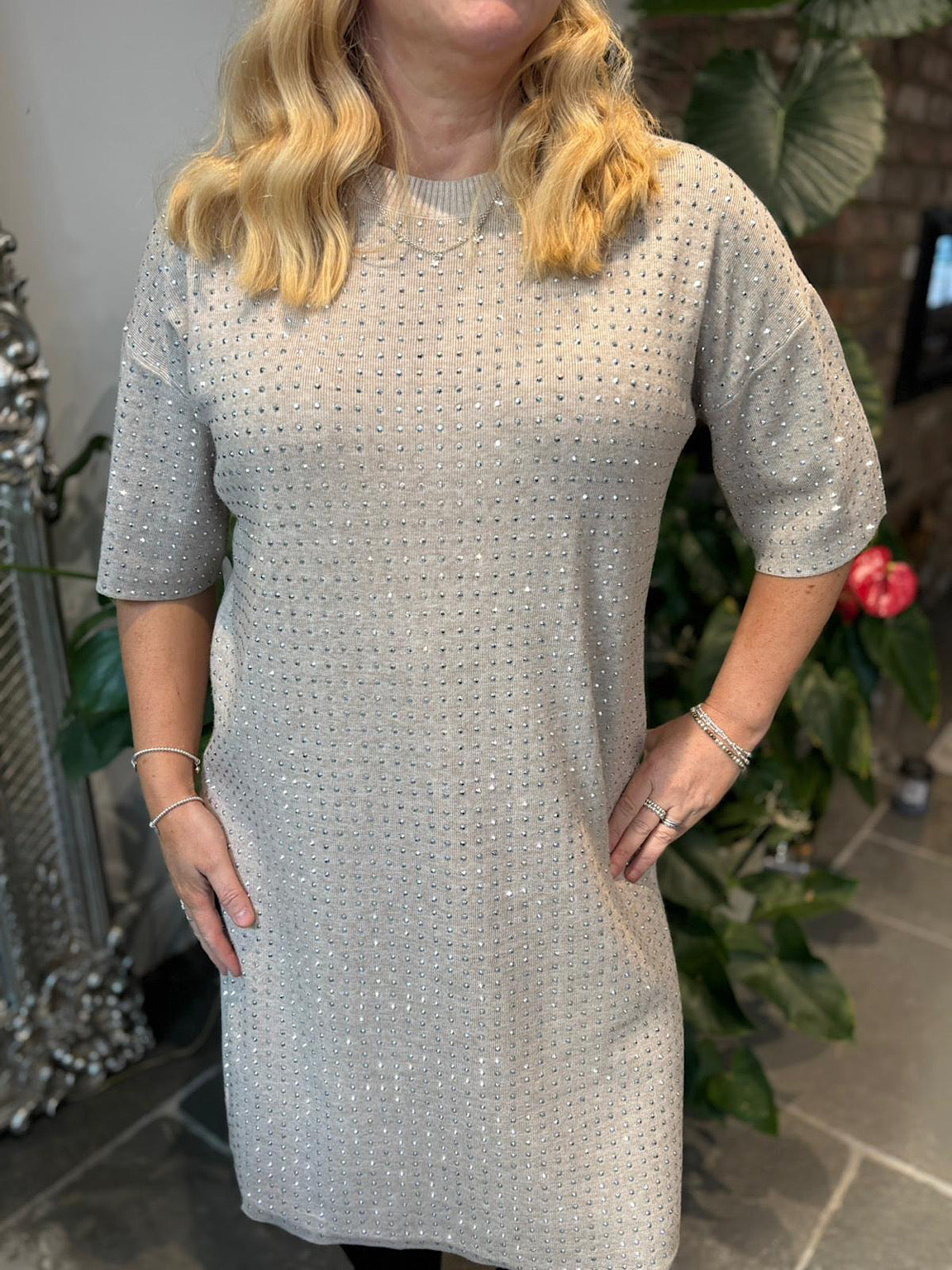 The Studded Knit Dress Serena offers a soft, knitted fabric with elegant studded detailing for a refined look. Its flattering sleeve length enhances the silhouette, creating a polished and sophisticated style. Ideal for dressing up with understated glamour, this jumper dress combines comfort and elegance effortlessly.