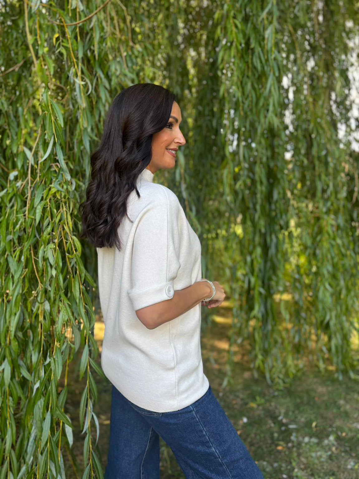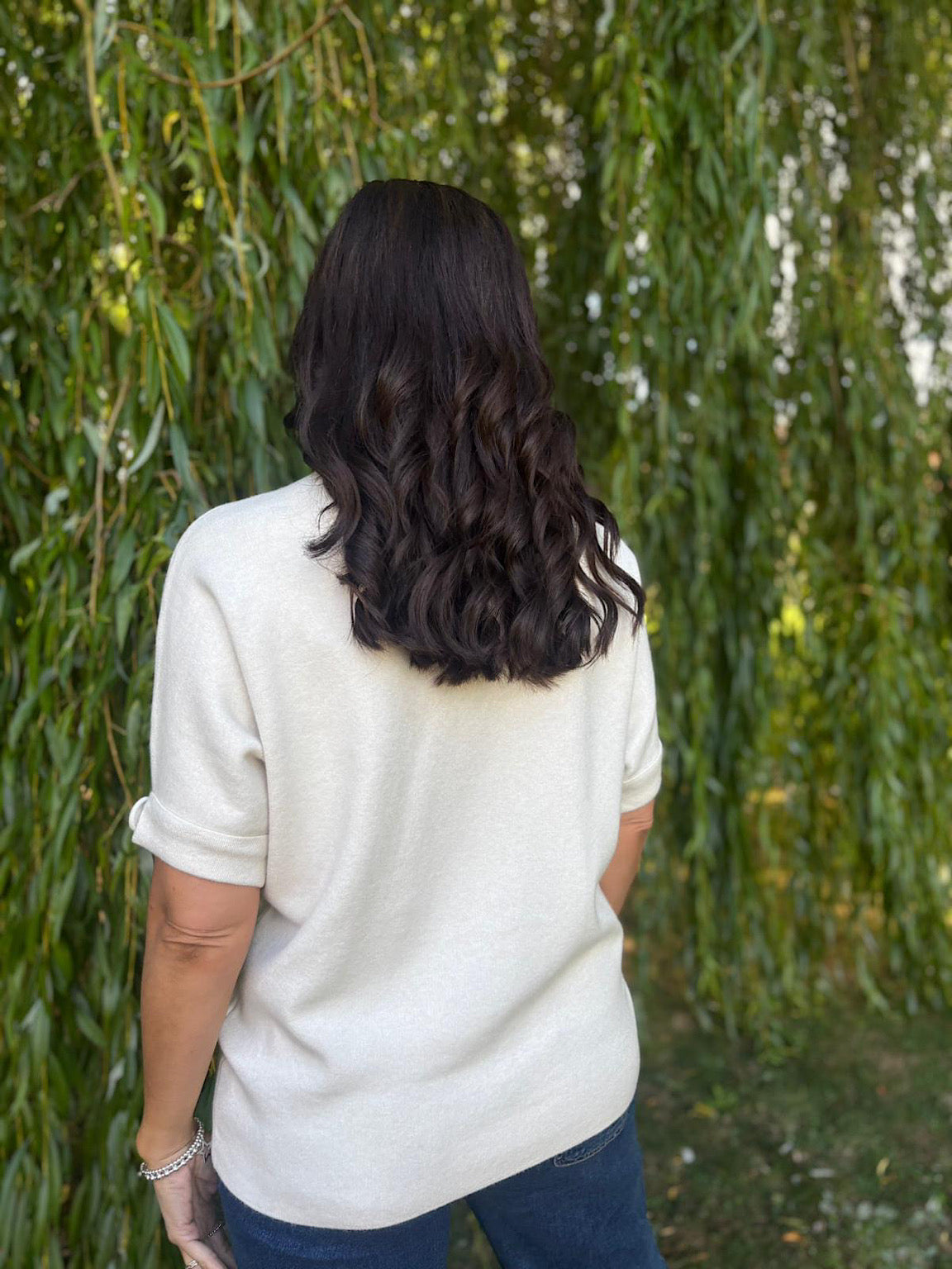 This soft knit top combines comfortable wear with delicate style, featuring a textured flower design and the embroidered word "beautiful" for a subtle, uplifting touch. Short sleeves are enhanced with a decorative button detail, adding a refined finish. Perfect for everyday wear, it offers both ease and elegance to your wardrobe.