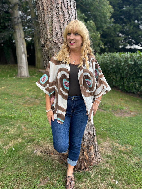 This Tie Dye Print Blouse Katherine features an oversized silhouette crafted from lightweight cotton, ensuring breathability and comfort. Its vibrant coloured tie dye design adds a contemporary, artistic flair, while the short sleeves make it ideal for warm weather or layering. Perfect for those seeking a stylish yet relaxed fit with a unique pattern.