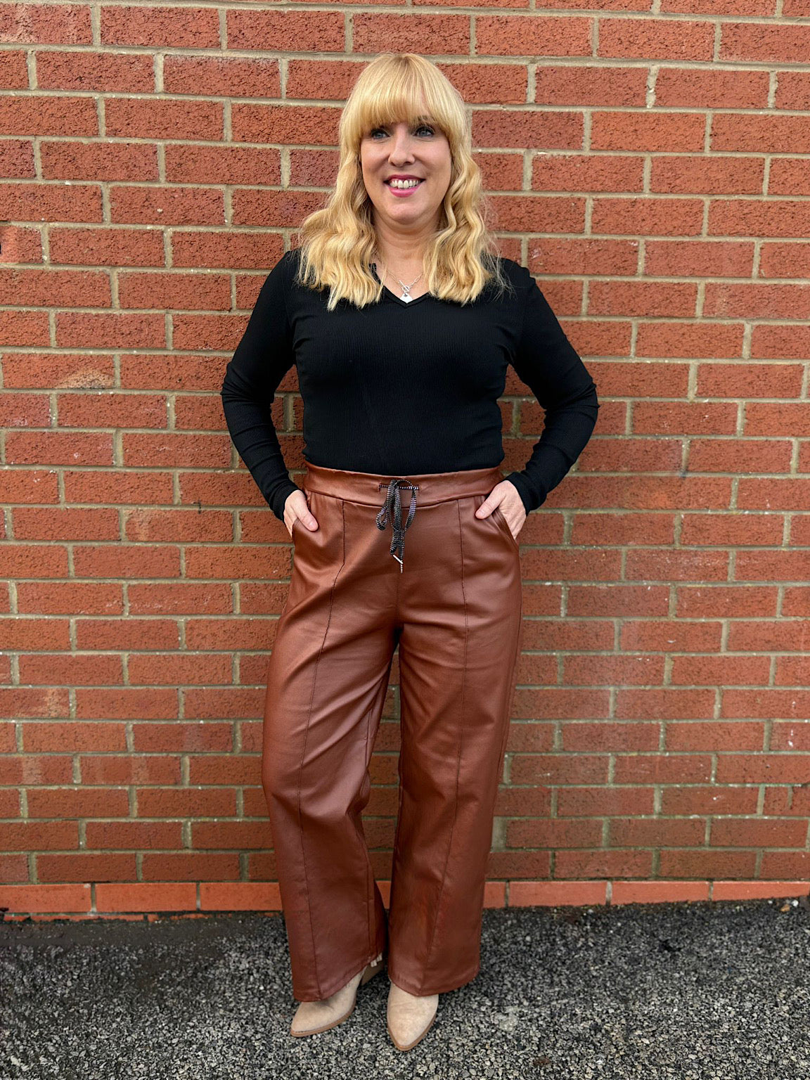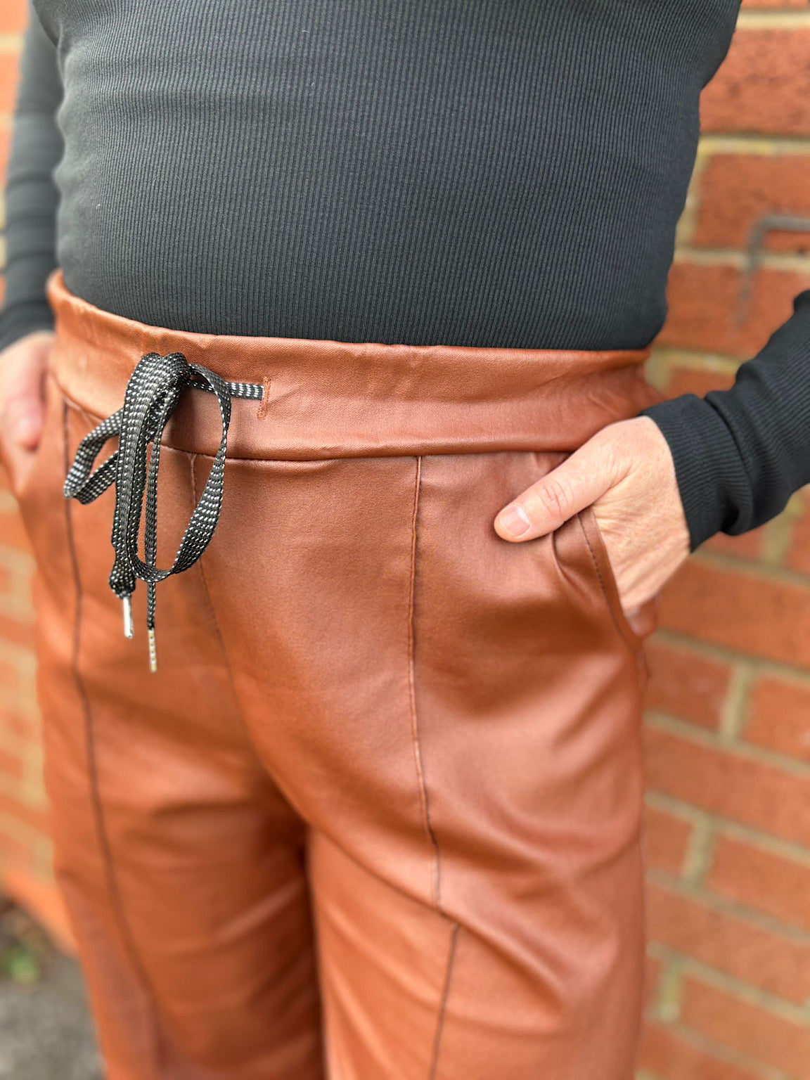Elevate your wardrobe with these striking wide-leg trousers, designed for effortless style and comfort. Featuring a distinctive seam front detail that adds contemporary edge, these trousers showcase a luxurious pleather finish that catches the light beautifully. The relaxed fit skims your silhouette without clinging, while an adjustable drawstring waist ensures a personalised fit throughout the day. Perfect for dressing up or down, these versatile trousers work beautifully with everything from crisp shirts to cosy knits, making them an essential addition to any modern wardrobe.