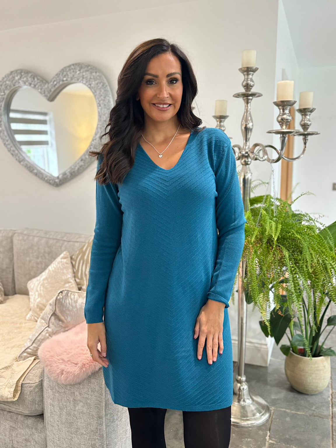 Experience comfort and style with the Chevron Knit Jumper Dress Kelly. Crafted from high-quality knit fabric, its chevron design adds a timeless, elegant touch. This cosy dress offers warmth and softness, making it perfect for cooler days while keeping you effortlessly chic.