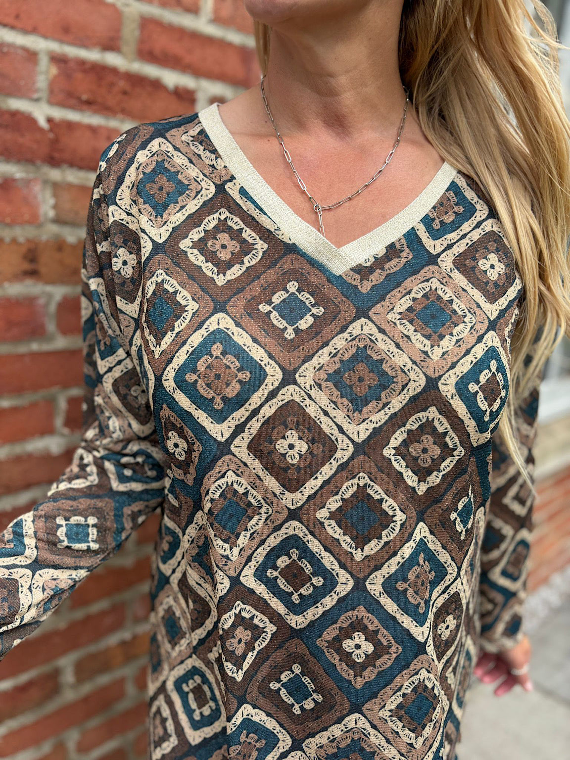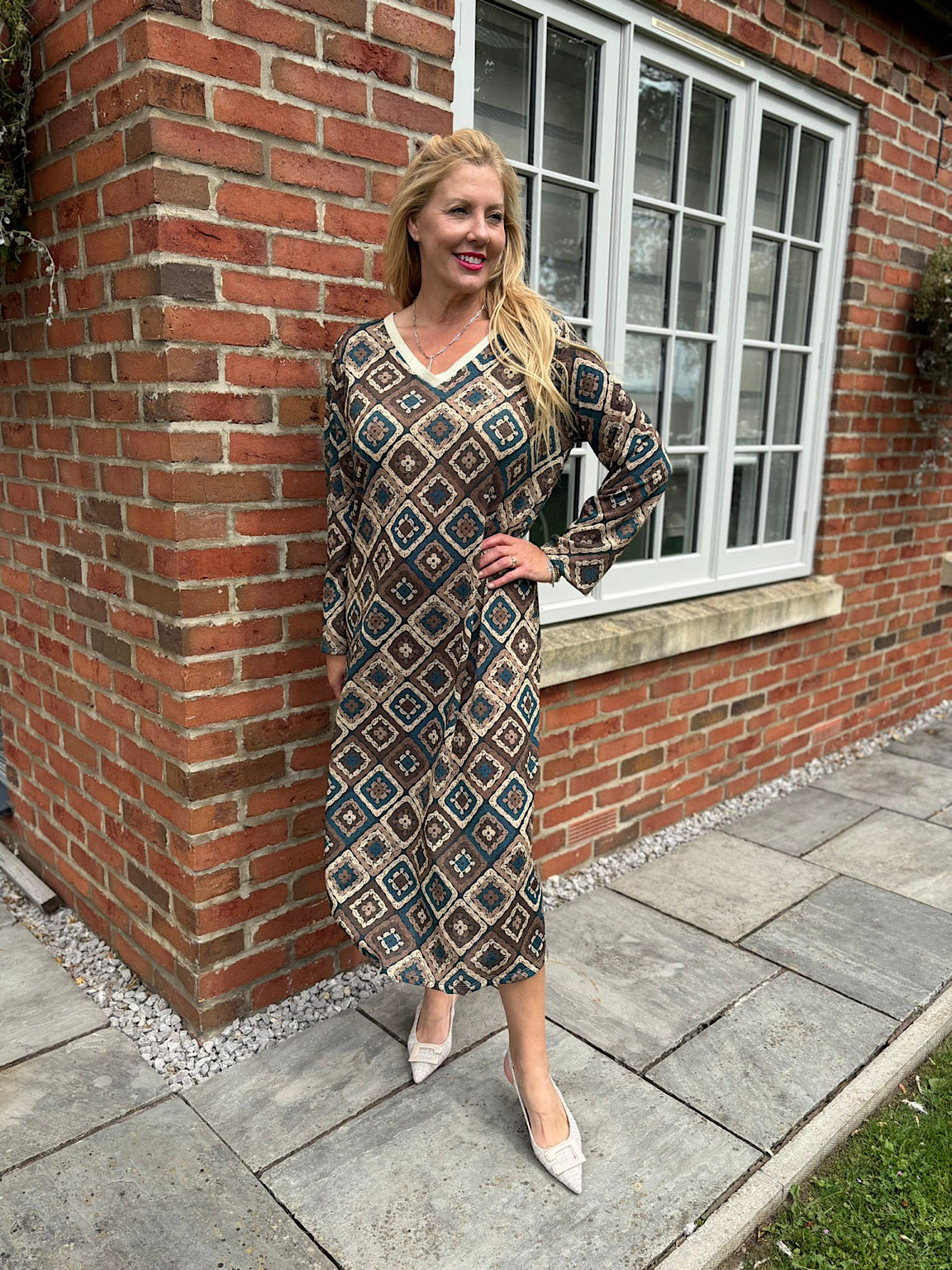 Elevate your style with the Diamond Shimmer Dress Freya, featuring a subtle gold lurex shimmer woven through a stylish diamond pattern. This long-sleeve dress offers a comfortable slip-on design, perfect for effortless elegance. Ideal for occasions where you want to feel confident and radiant.