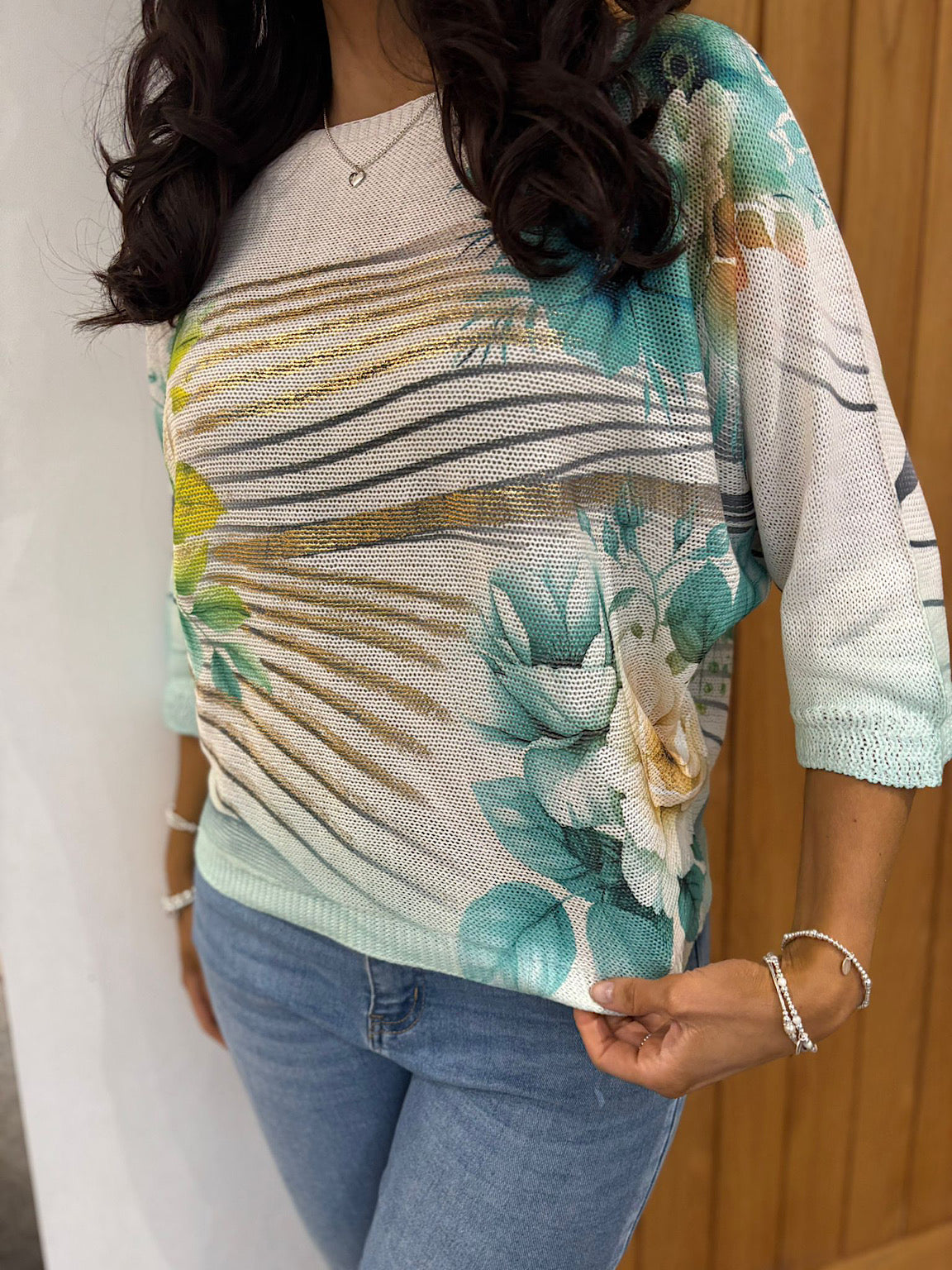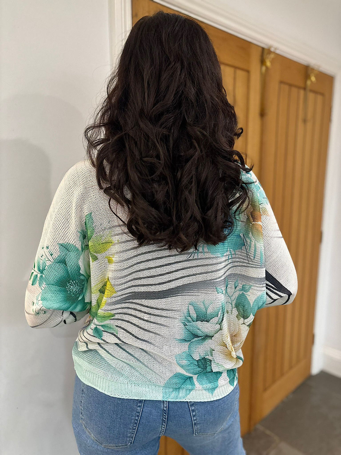 Embrace effortless elegance with this stunning soft knit featuring delicate floral motifs an shimmering metallic stripes. The teal base creates a calming, sophisticated palette that transitions beautifully from day to evening wear. Crafted from a luxuriously soft knit fabric, Dawn offers gentle comfort without compromising on style. The wave-inspired design adds movement and dimension, making this piece a versatile wardrobe essential that works beautifully layered or worn alone. Perfect for those who appreciate understated glamour with a touch of sparkle.