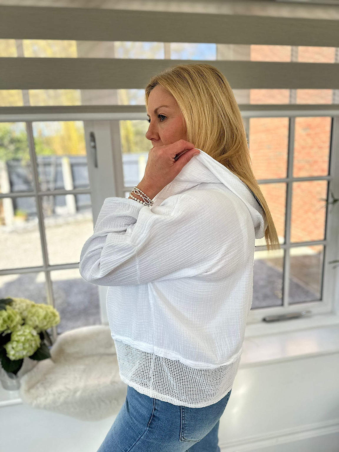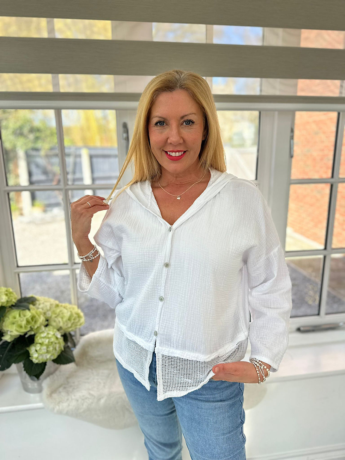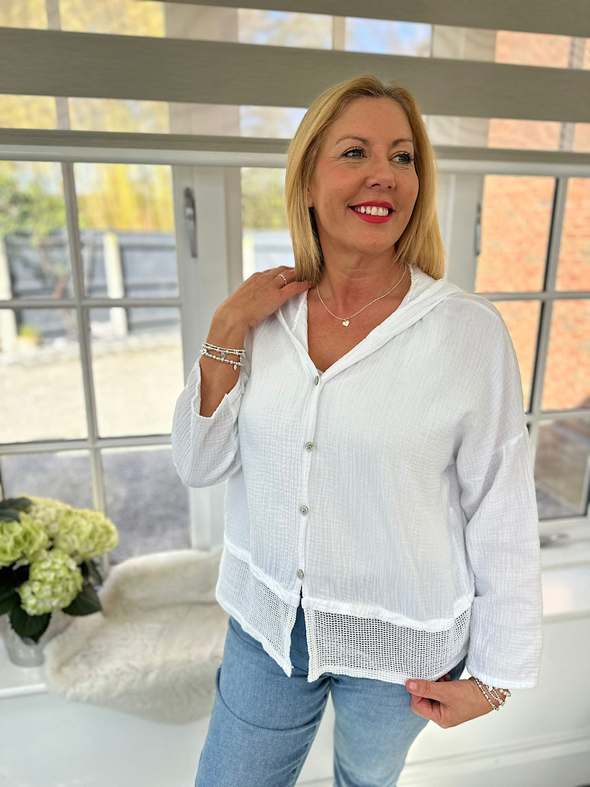 Embrace cosy comfort in this Bubble Cotton Hooded Jacket Hayley. Crafted from soft cotton, this hooded jacket features charming net detailing along the hem and a secure button closure. Perfect for layering on cooler days, the relaxed bubble design offers both style and warmth. An effortless addition to your everyday wardrobe.