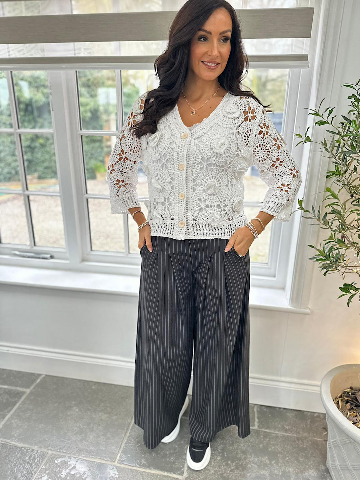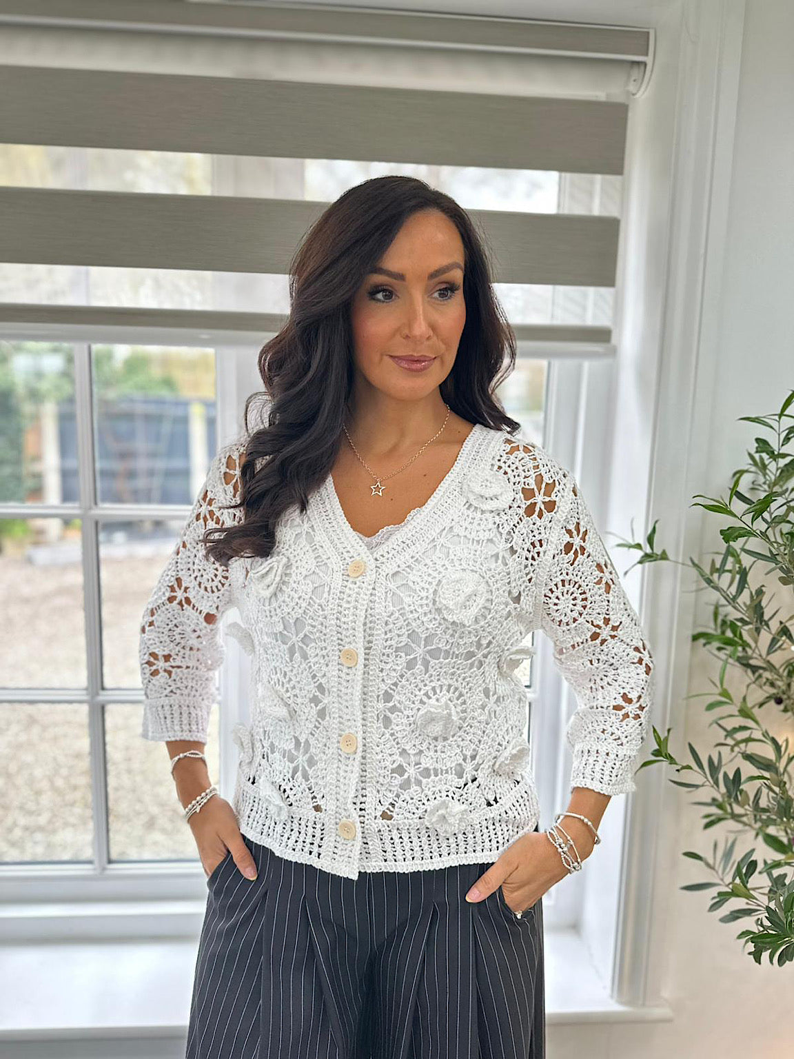 Embrace effortless elegance with this charming white cardigan, adorned with delicate crochet flower appliqués that add a romantic, handcrafted touch. The soft, feminine silhouette is enhanced by intricate floral details, while practical button fastening makes layering a breeze. Perfect for adding a touch of whimsy to any outfit, this piece celebrates timeless style with contemporary flair.
