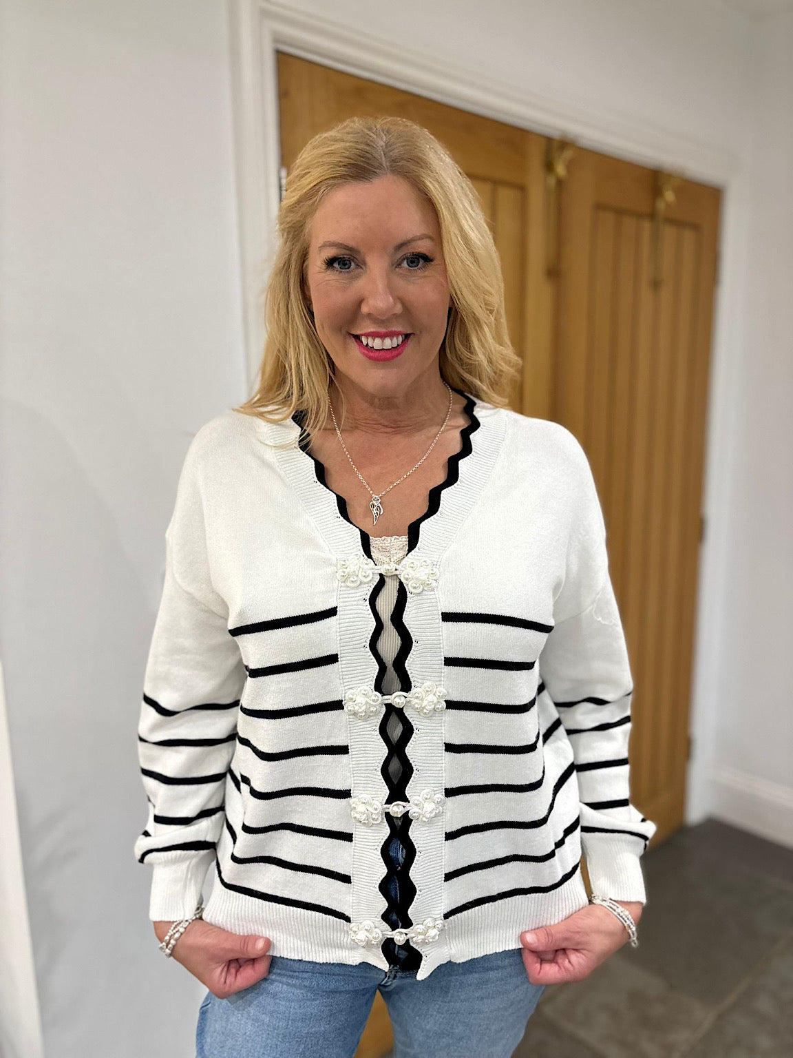 Scalloped Edge Striped Cardi Clara Elevate your everyday wardrobe with this charming striped cardigan, designed to bring effortless style to any occasion. Featuring delicate scalloped edges that add a touch of feminine elegance, this piece is finished with pearl detail buttons that catch the light beautifully. The classic striped pattern works seamlessly with your existing pieces, while the supportive fit ensures you'll feel confident and comfortable all day long. Perfect for layering over dresses or pairing with your favourite jeans, this versatile cardi is a wardrobe essential that deserves a place in your collection.