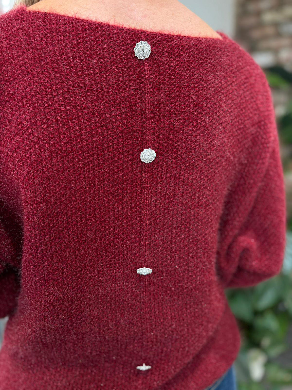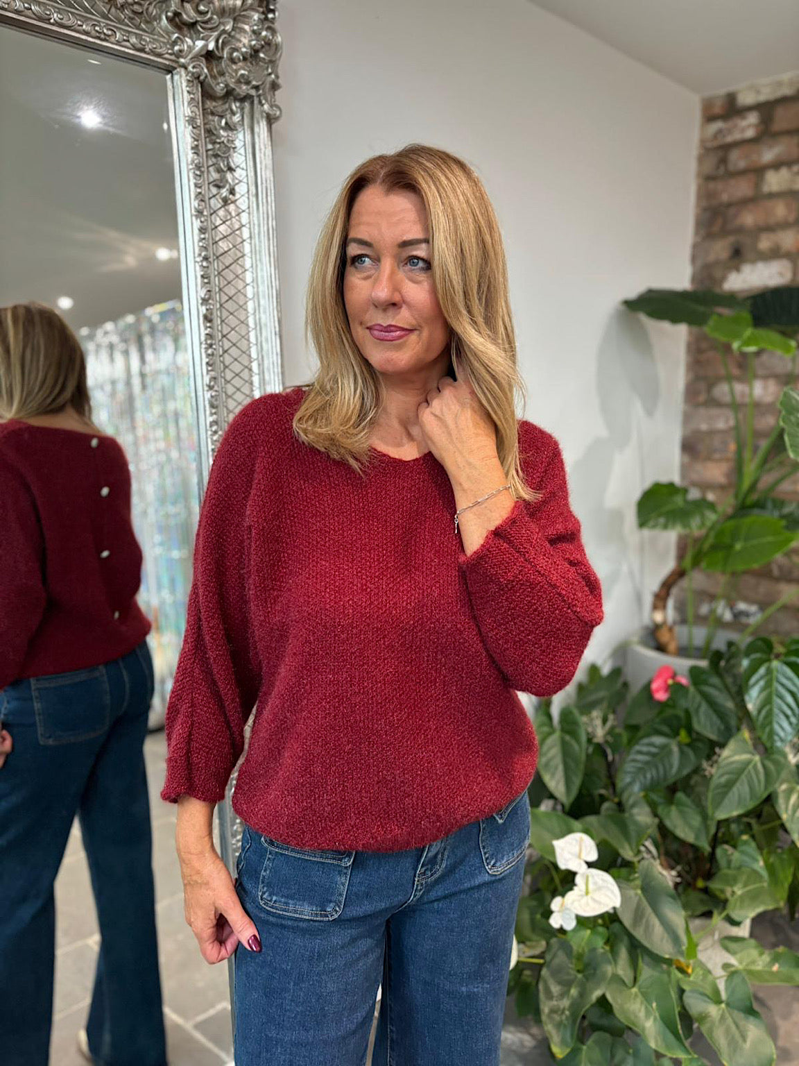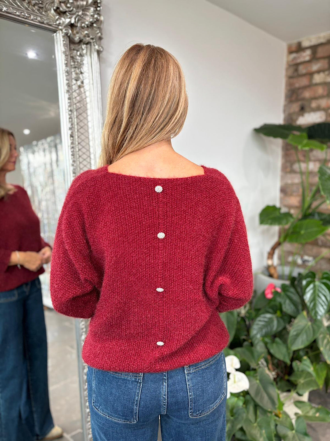 The Back Detail Knit Top Billie features elegant batwing sleeves and delicate button detailing along the back, adding a sophisticated touch to your outfit. Crafted from subtly shimmering fabric, this top brings a soft glow to your look, perfect for both day and evening wear. Comfortable and stylish, it supports your confident, graceful style effortlessly.