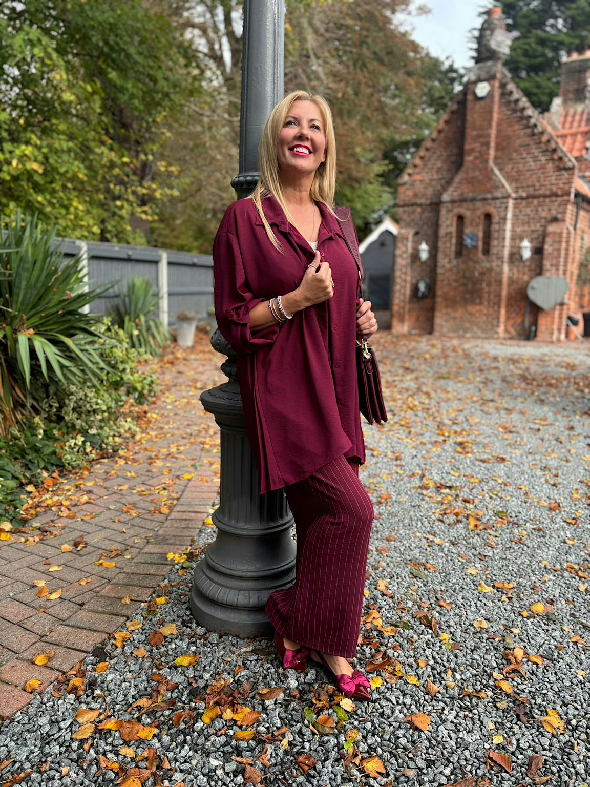 Styled with.....> Wine Giraffe Print Zip Top Poppy/ Chocolate Kitten Heel Bow Shoes/ Wine Coated Trousers