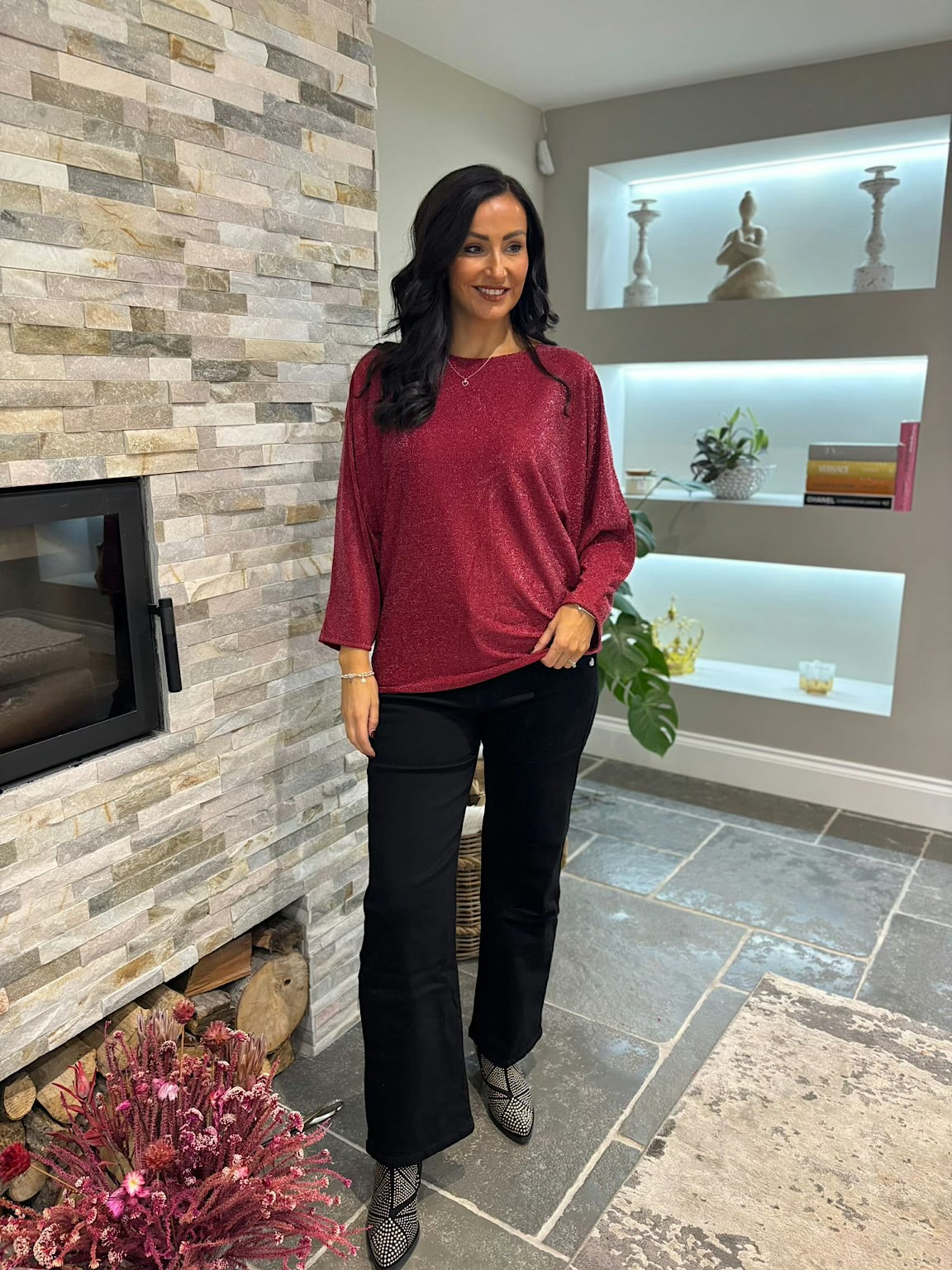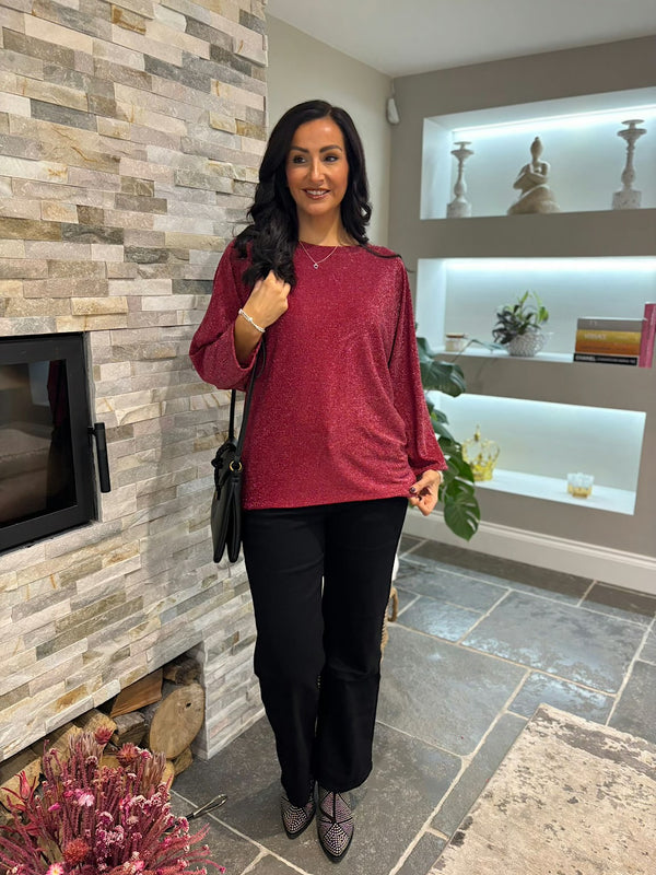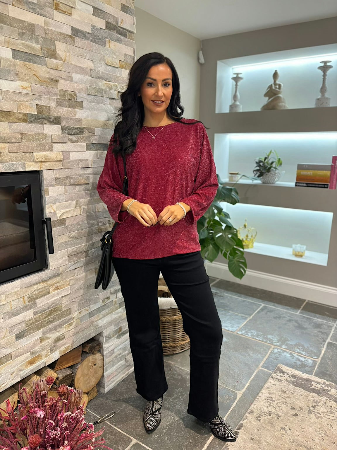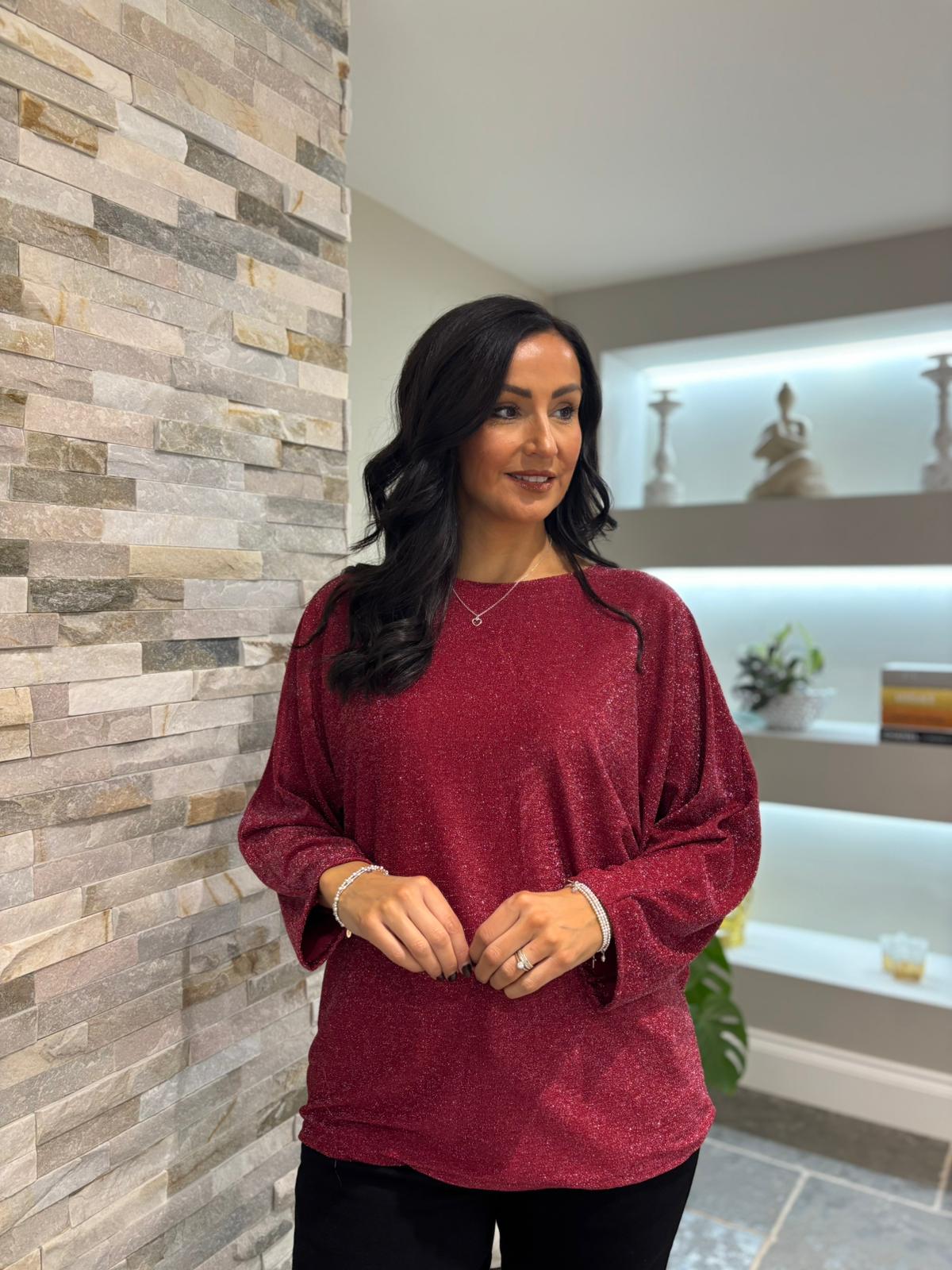 This shimmer top features elegant batwing sleeves, offering both comfort and a stylish silhouette. Perfect for adding a touch of sparkle to your outfit, its flowing design ensures ease of movement while maintaining a flattering fit. Ideal for dressing up casual looks or pairing with your favourite accessories for special occasions.