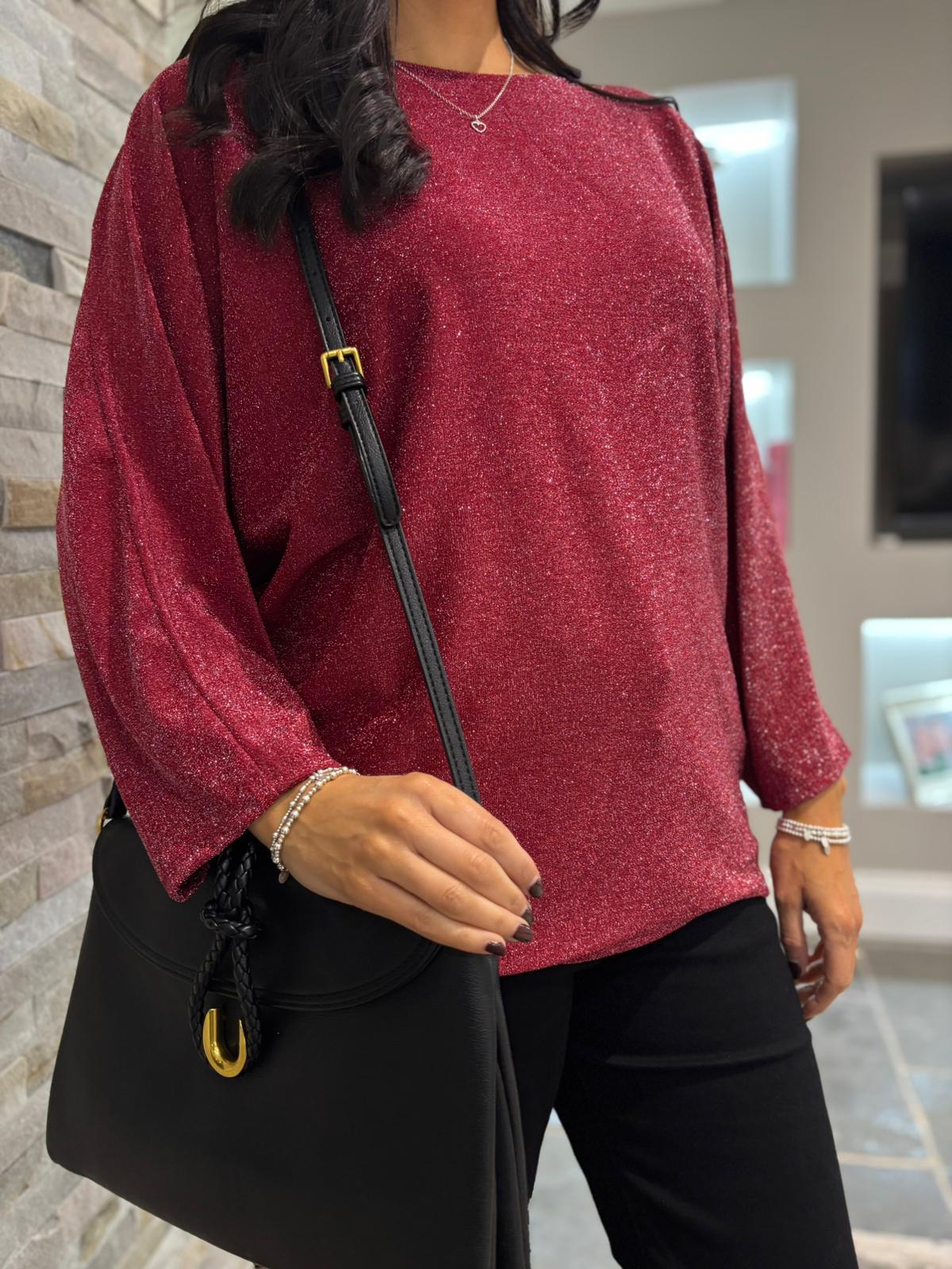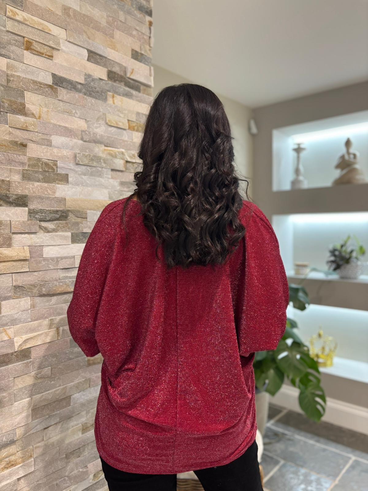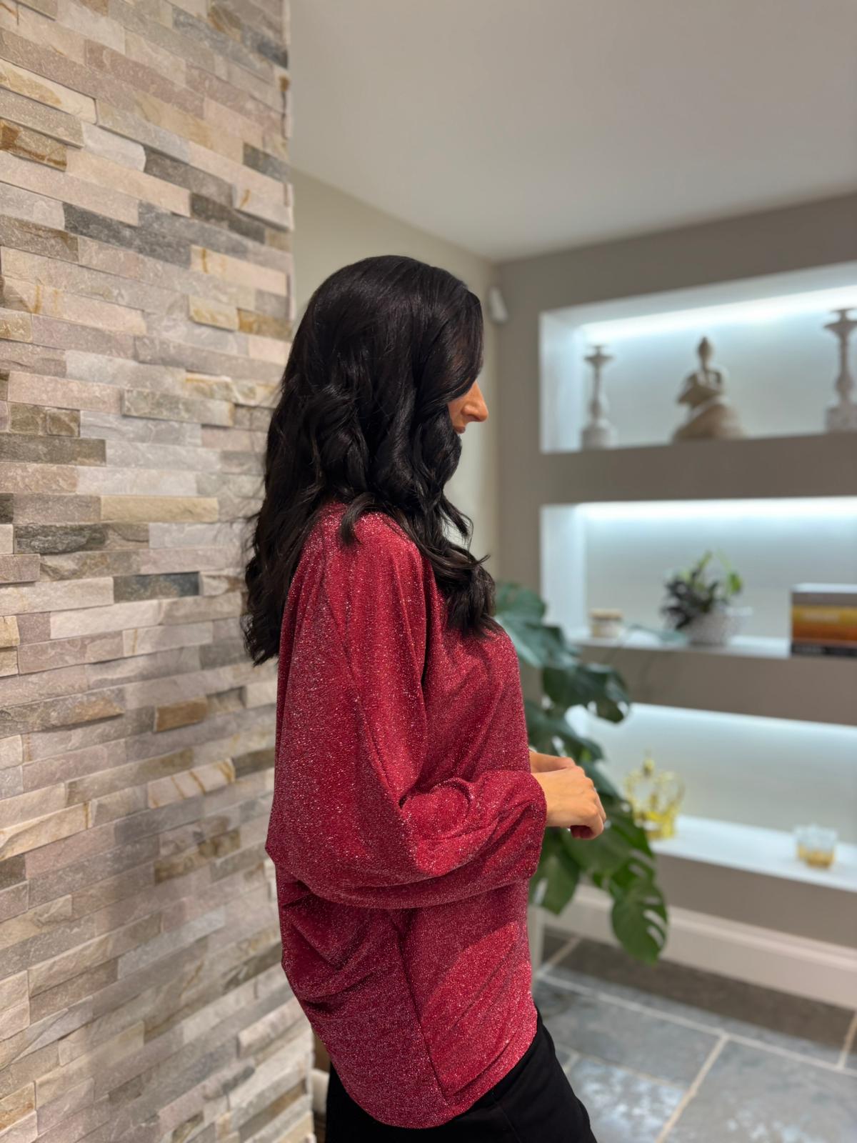 This shimmer top features elegant batwing sleeves, offering both comfort and a stylish silhouette. Perfect for adding a touch of sparkle to your outfit, its flowing design ensures ease of movement while maintaining a flattering fit. Ideal for dressing up casual looks or pairing with your favourite accessories for special occasions.