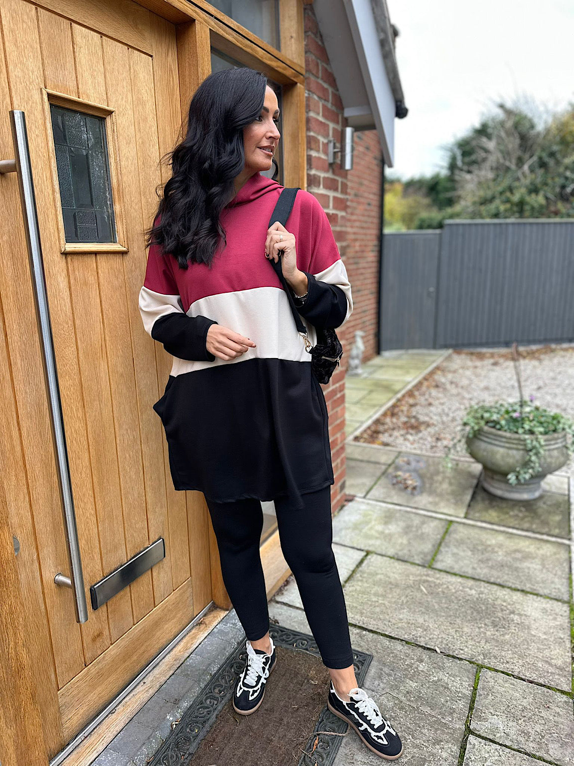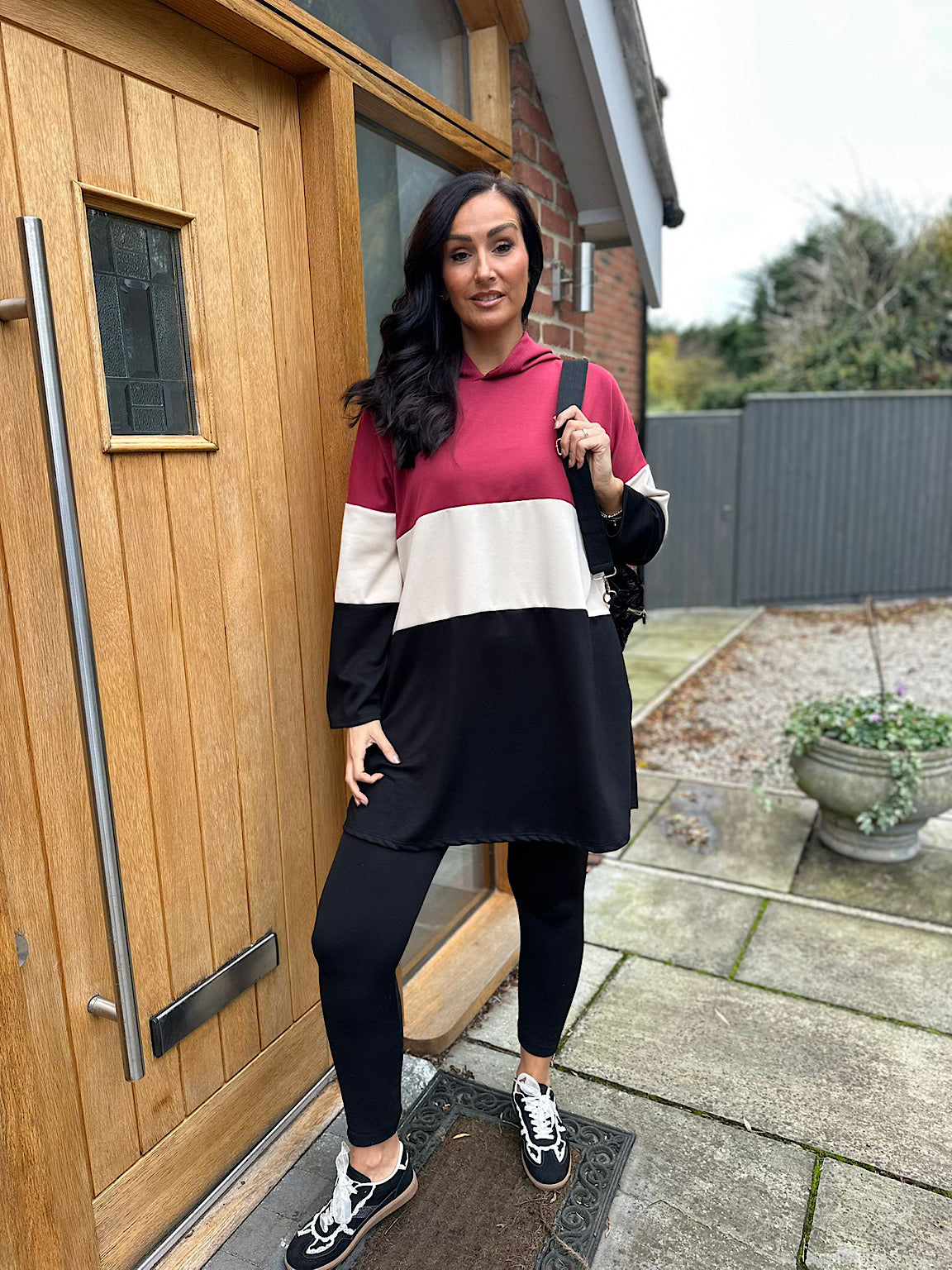 Block Stripe Sweat Dress Eva combines comfort with everyday style. This hooded sweat dress features a striking block stripe design, perfect for effortless layering. The practical side pockets keep your essentials close, while the relaxed fit and soft sweatshirt fabric make it ideal for casual days at home or out and about. Throw it on over your favourite basics for a cosy, put-together look that feels as good as it looks.
