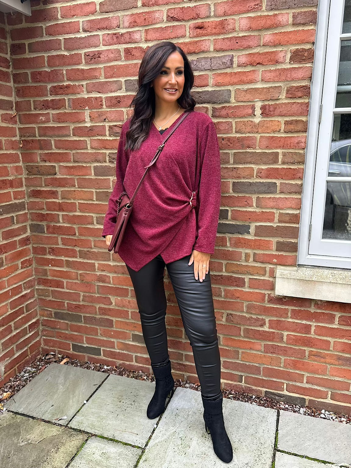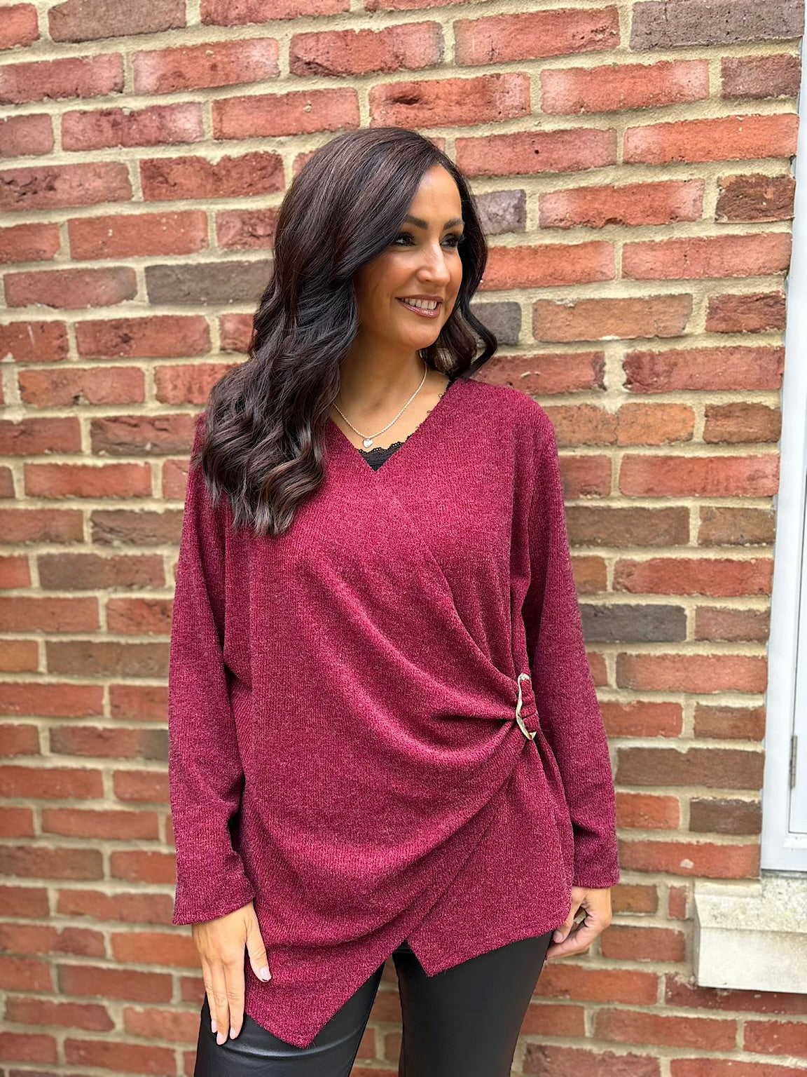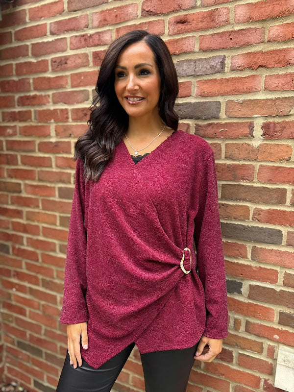 Elevate your wardrobe with the Brooch Cross Over Knit Hattie. Crafted from a soft knit fabric, this piece features an elegant cross-over design beautifully accented by a decorative brooch, adding a refined touch to your look. Ideal for sophisticated layering, it combines comfort with understated style.