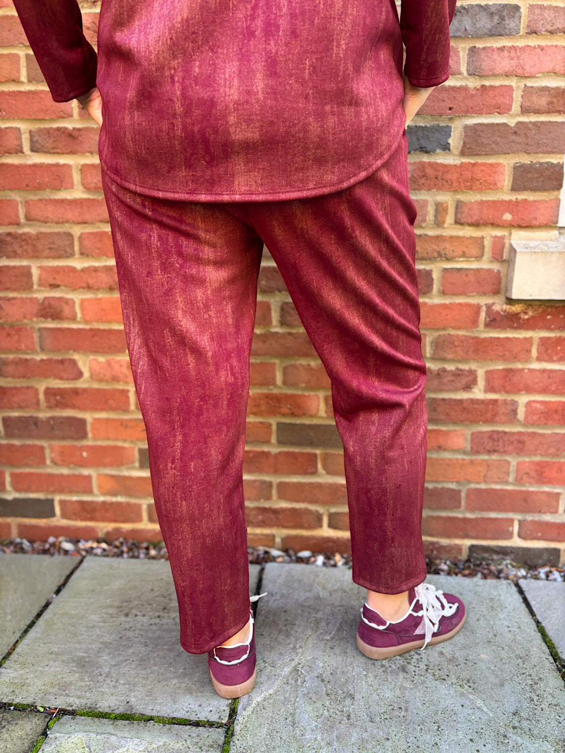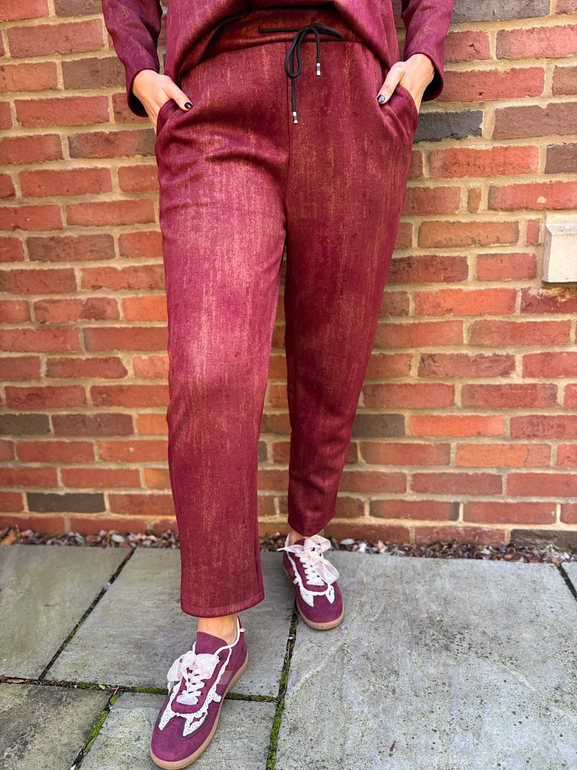 These Brushstroke Shimmer Joggers offer a relaxed fit with a soft brushed pattern highlighted by a subtle gold shimmer. Featuring a drawstring elasticated waist, they provide adjustable comfort and style perfect for your everyday casual looks. Pair with our Natalia Sweatshirt for a complete look.