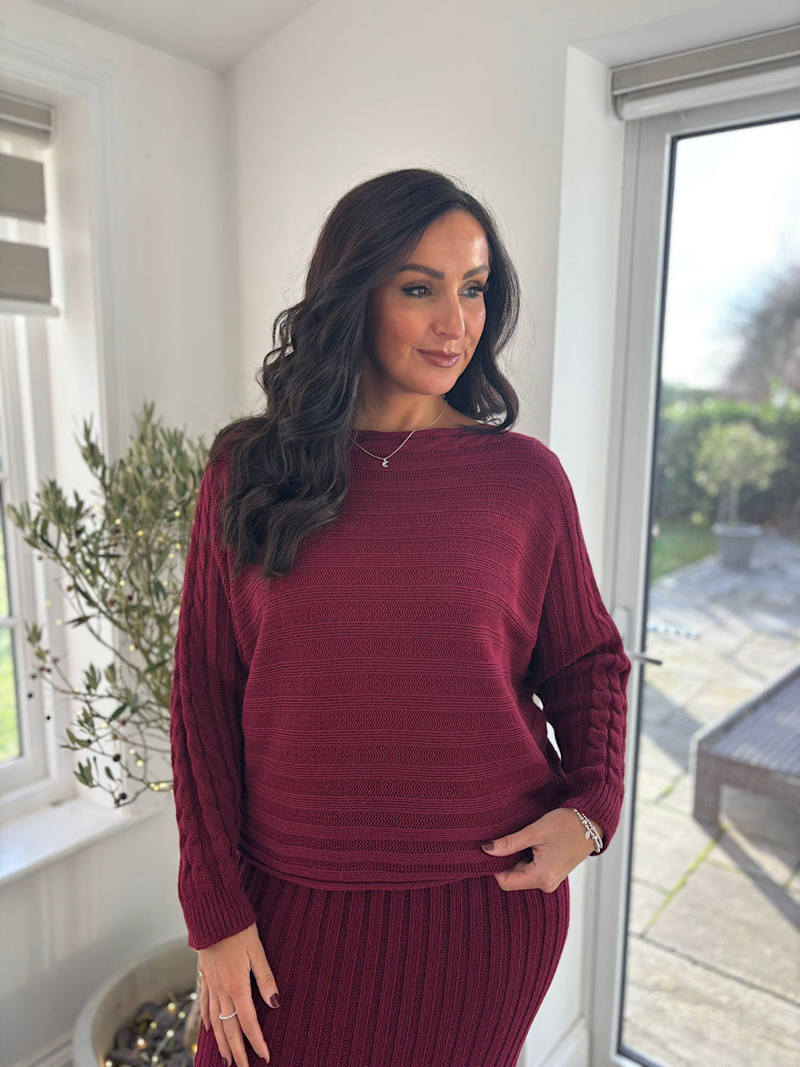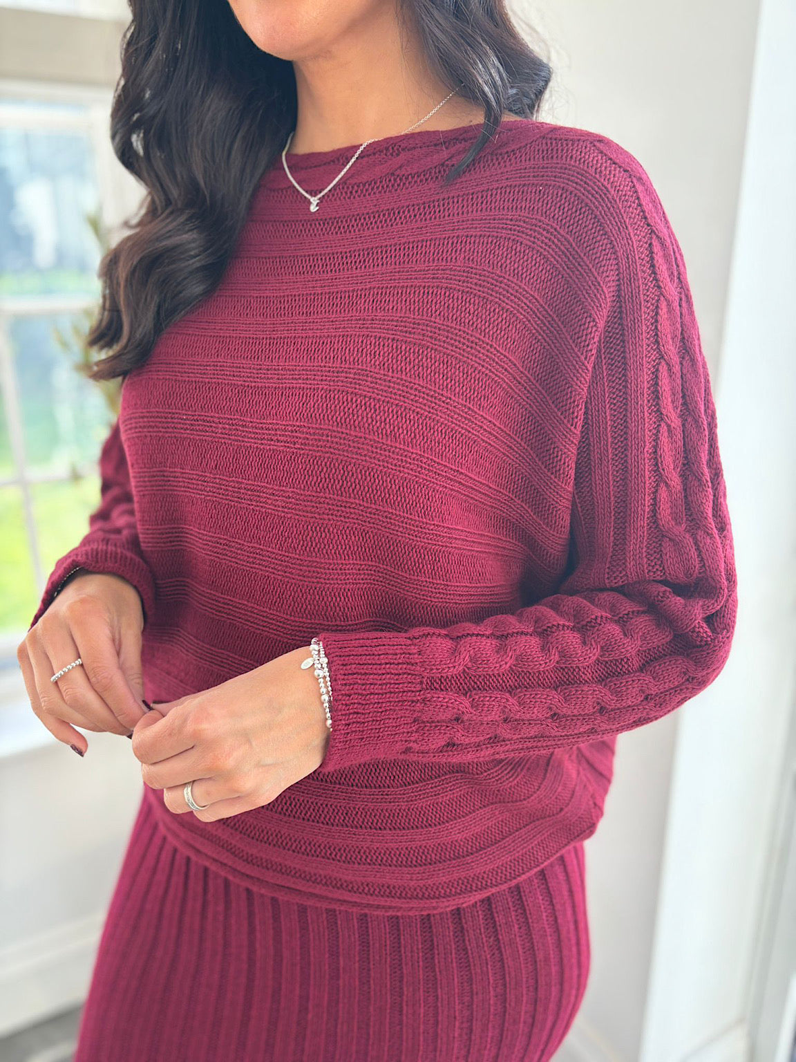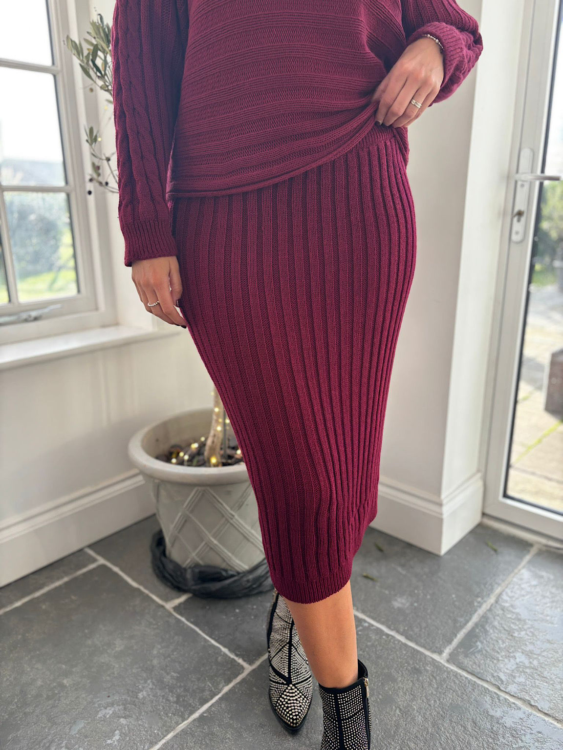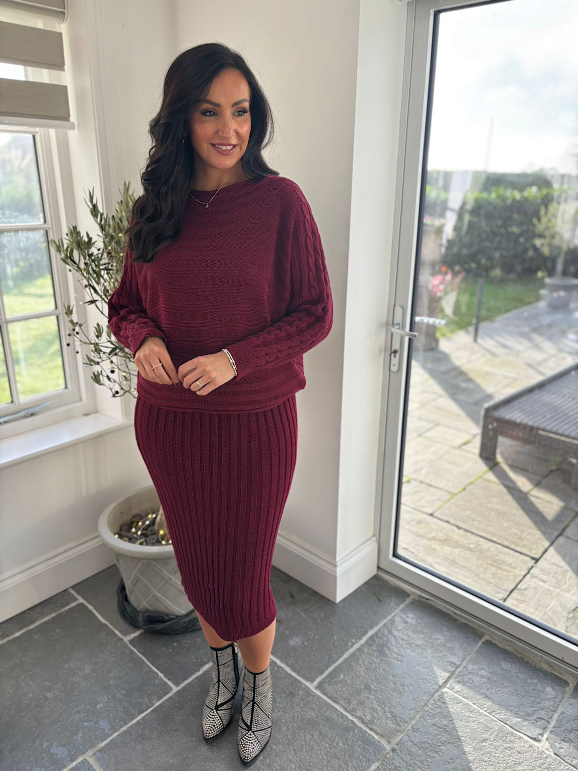 This two piece set is versatile and perfect for any occasion. Made of cosy knitted fabric, the cable detailing on the shoulder adds a touch of elegance. The ribbed design enhances the overall look of this stylish outfit. Perfect for staying warm and fashionable in the colder months.