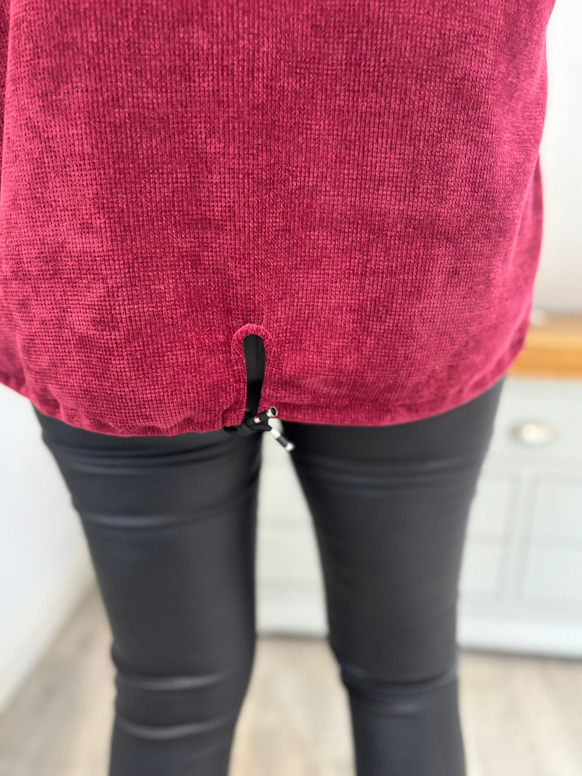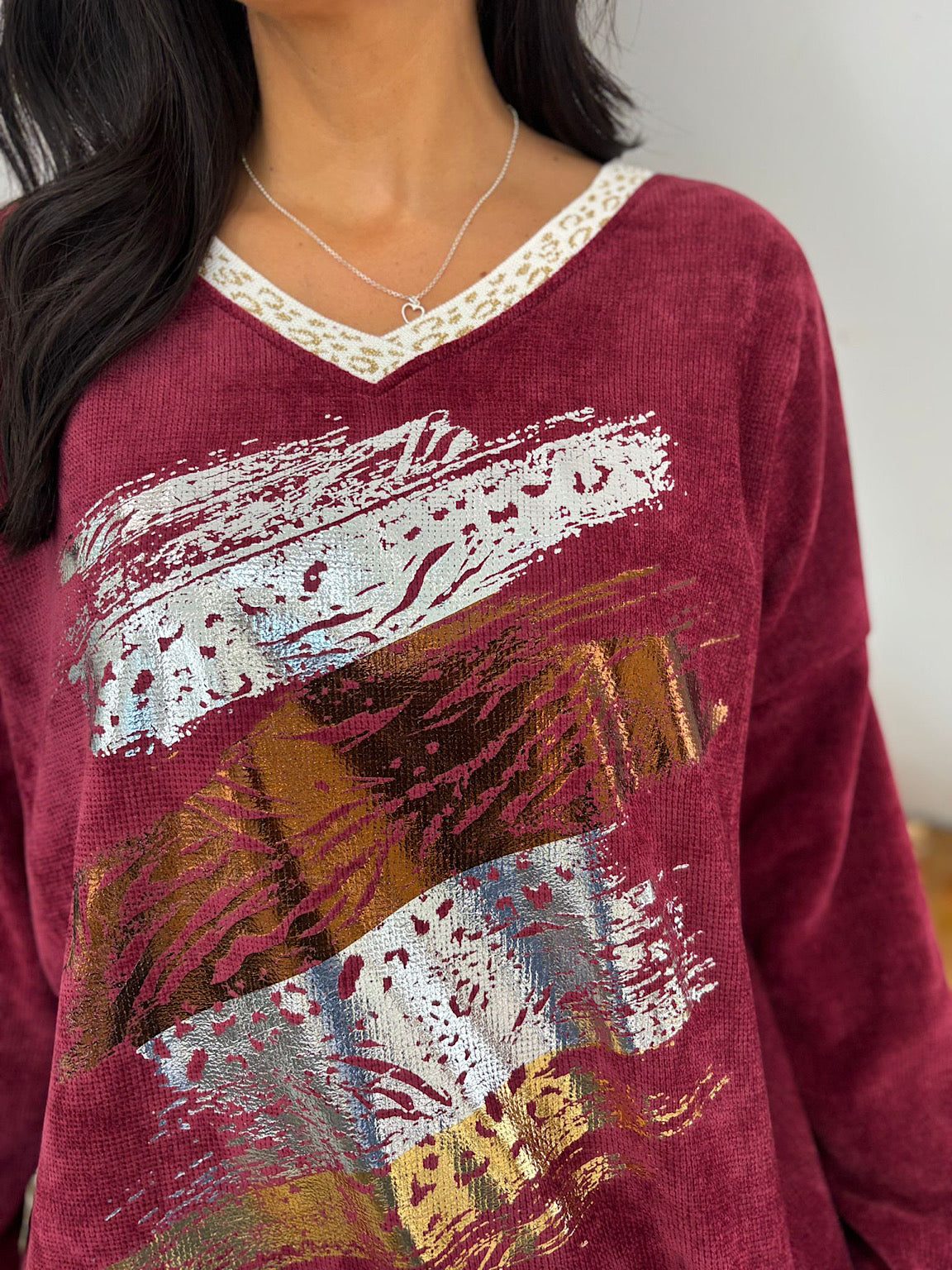 Wine Chenille Leopard V Neck Sweatshirt Elle
