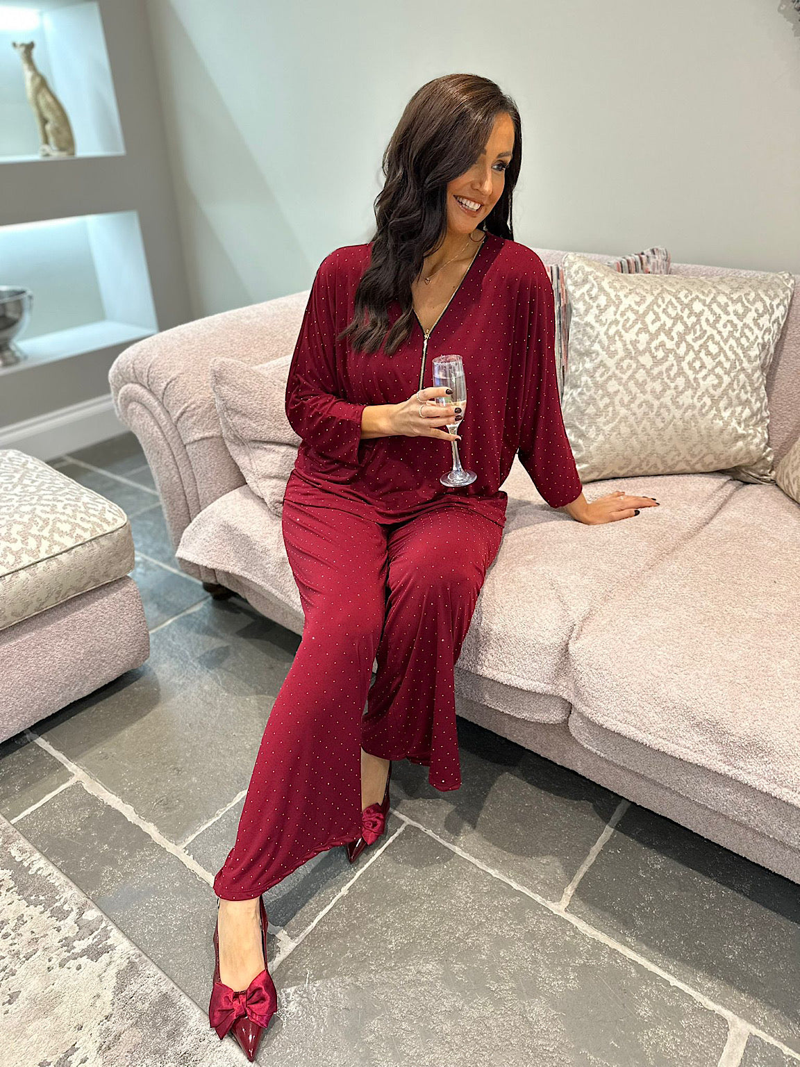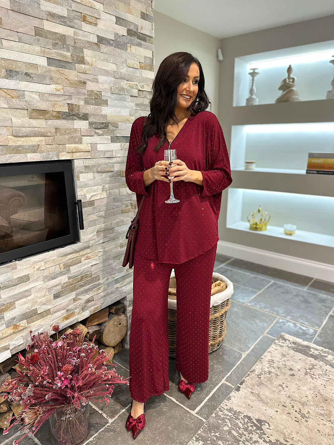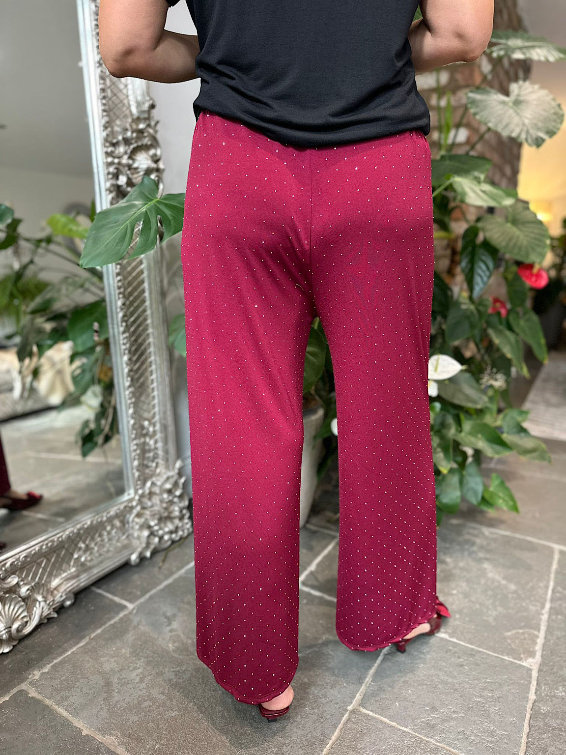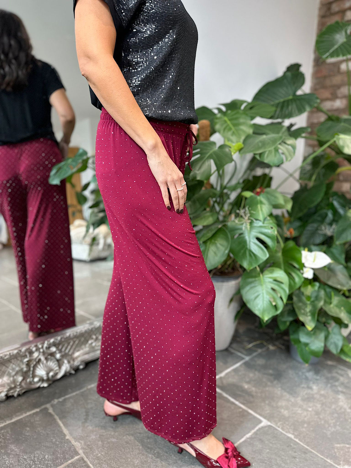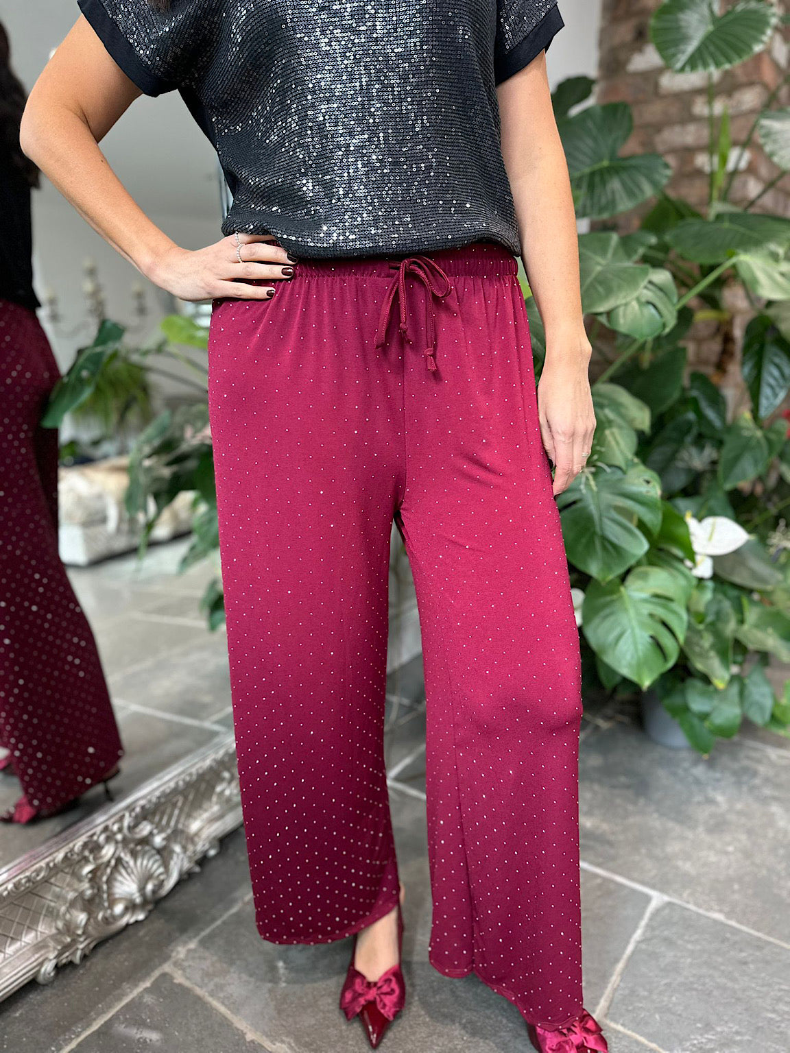 These Diamante Wide Leg Trousers feature a flowy fabric that moves gracefully with you. Tiny diamantes add a subtle sparkle, while the drawstring waist ensures a comfortable, adjustable fit. Perfect for combining style and ease in any setting. Pair with our Trisha Diamante Zip Top for a complete look.