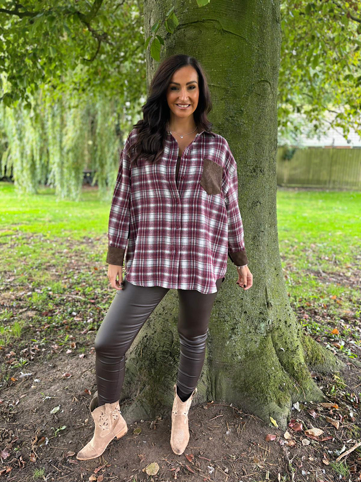 This checked shirt features refined faux leather trims on the collar, cuffs, and pocket, adding a subtle edge to its classic design. The button-up style offers versatility, making it a sophisticated choice for both casual and polished looks. Crafted to balance texture and pattern, it enhances your wardrobe with understated elegance.