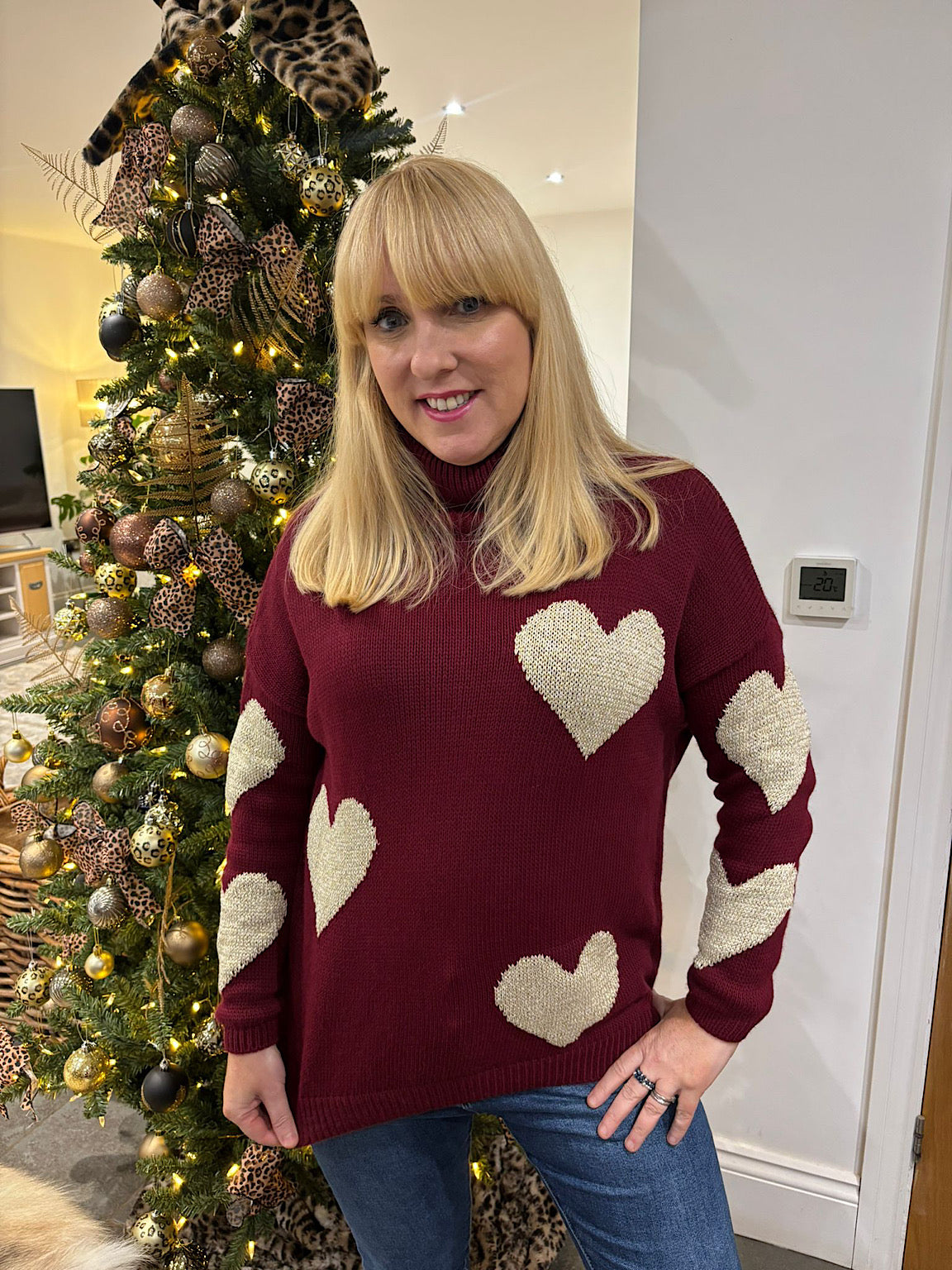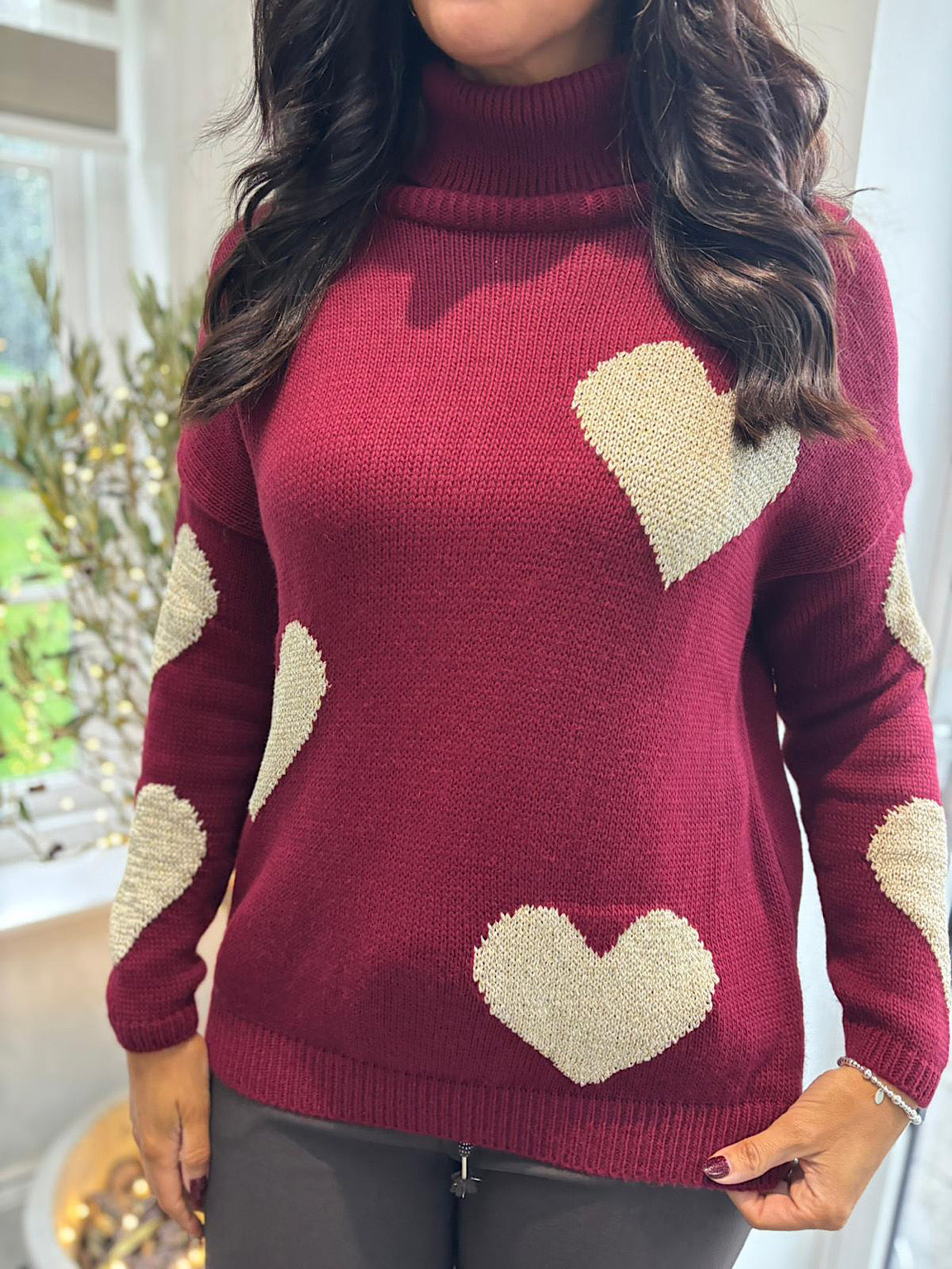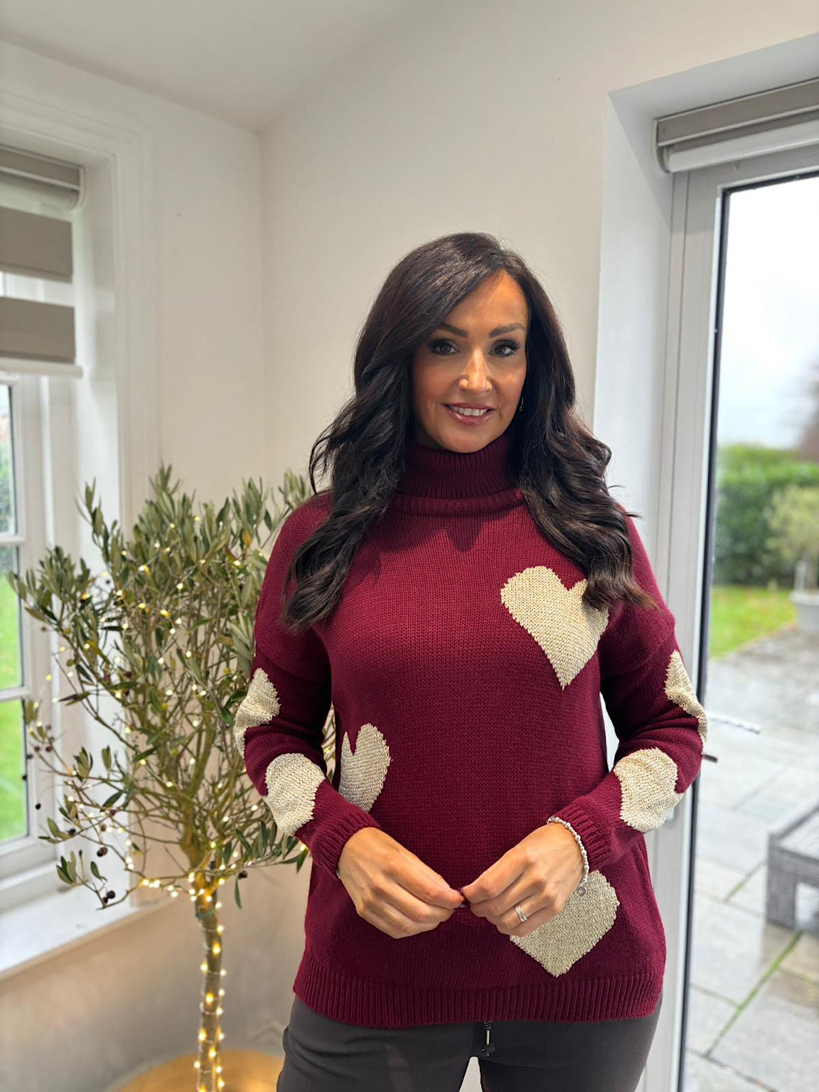 This roll neck jumper combines timeless comfort with a playful touch of glamour. Gold lurex hearts dance across the knit in an all over pattern, delivering just enough shimmer to elevate your everyday style. Soft, versatile, and effortlessly chic, it's the kind of piece you'll reach for again and again, whether you're dressing up or keeping things casual.