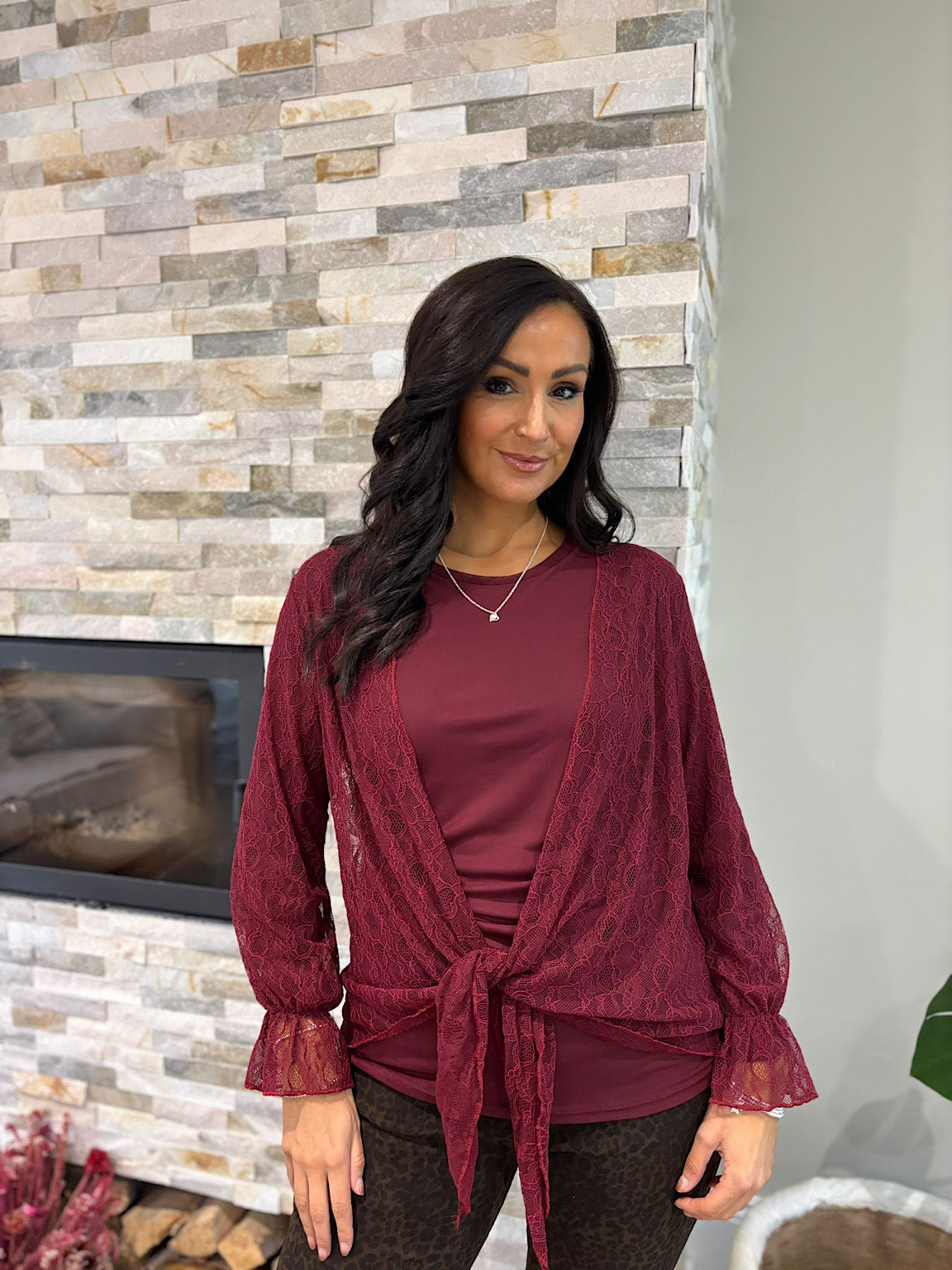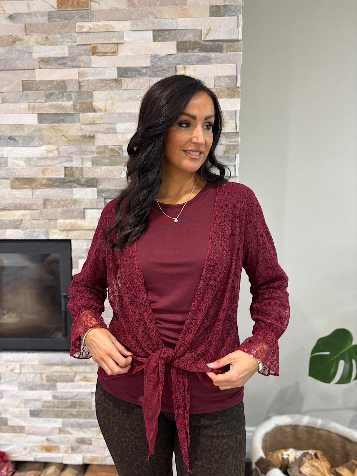Elevate your layering game with this lightweight lace tie front shrug. The delicate fabric drapes beautifully over dresses, tops, and camisoles, adding an instant touch of elegance to any outfit. Featuring charming ruffle sleeves, this versatile piece transitions seamlessly from day to evening wear. Perfect for layering when you need an extra touch of sophistication without the bulk.