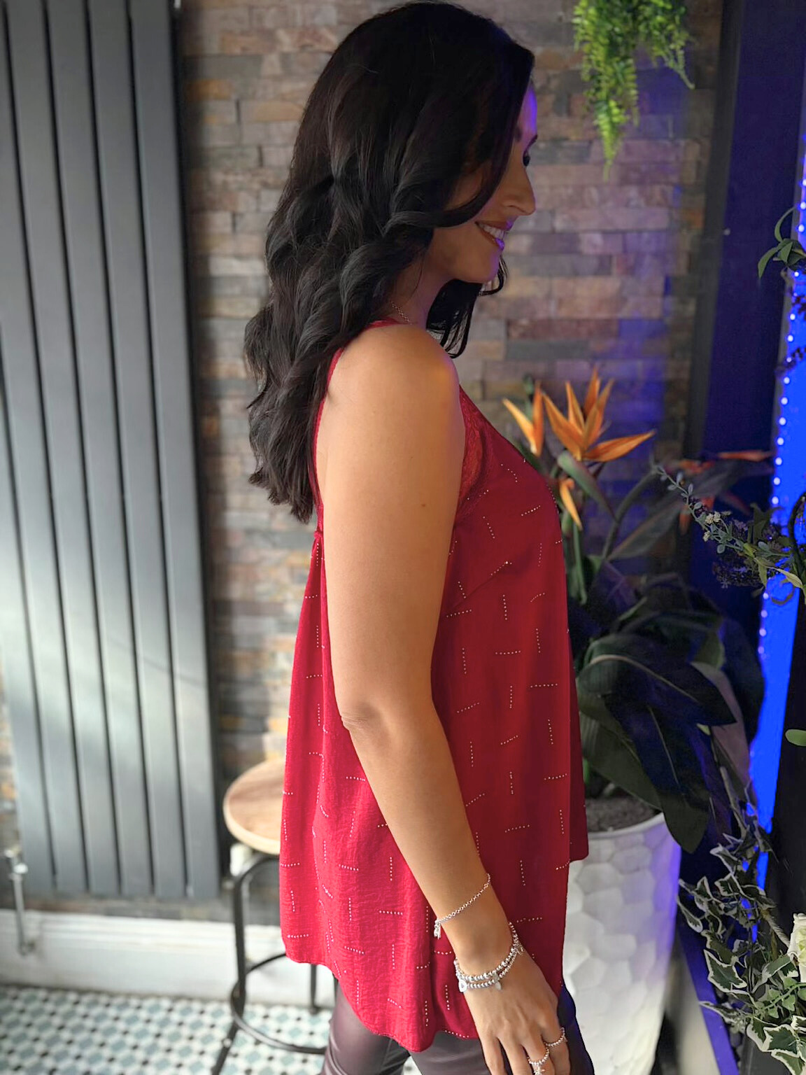 This Lace Trim Diamante Vest features elegant lace finishing on the hem and straps, adding a delicate touch to your look. Sparkling diamante details adorn both the front and back, offering subtle glamour for any occasion. Designed to combine comfort with eye-catching style, it’s a versatile addition to your wardrobe.