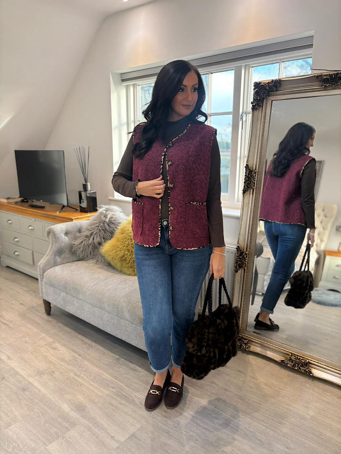 Elevate your style with the Leopard Trim Waistcoat Rhea, featuring a sleek button fastening and practical front pockets. The subtle leopard trim adds a refined touch, making this waistcoat a sophisticated choice for layering. Its tailored design ensures a flattering fit, perfect for adding elegance to any ensemble.