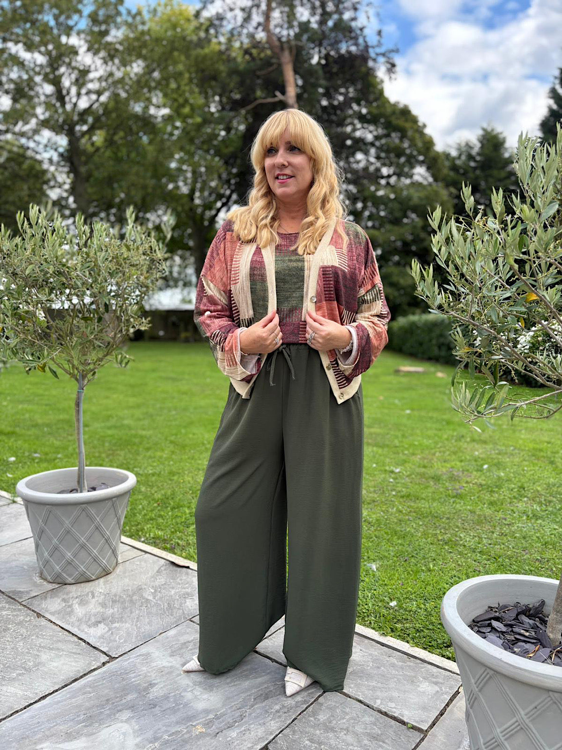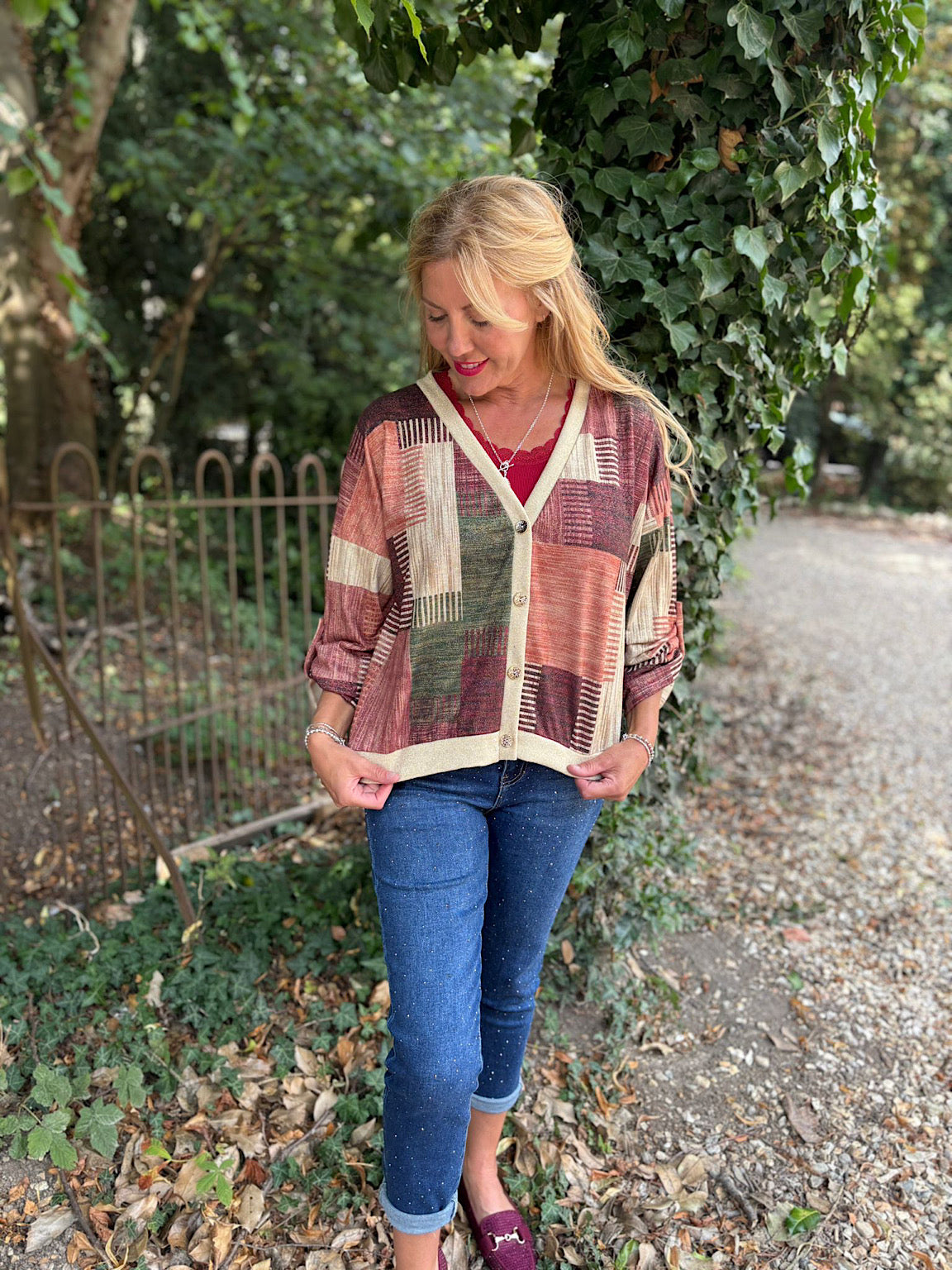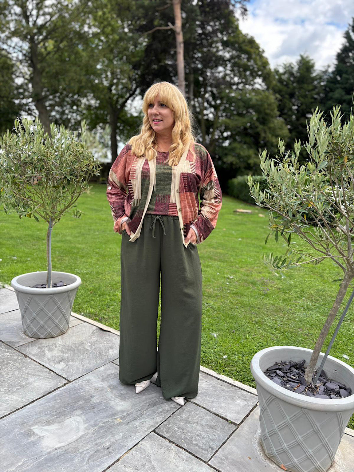 Styled with.....>Wine Patchwork Shimmer Top Lottie/ Khaki Wide Leg Pocket Trousers Claudia/ Chocolate Faux Suede Chain Loafer/ Denim Diamante Straight Leg Jeans