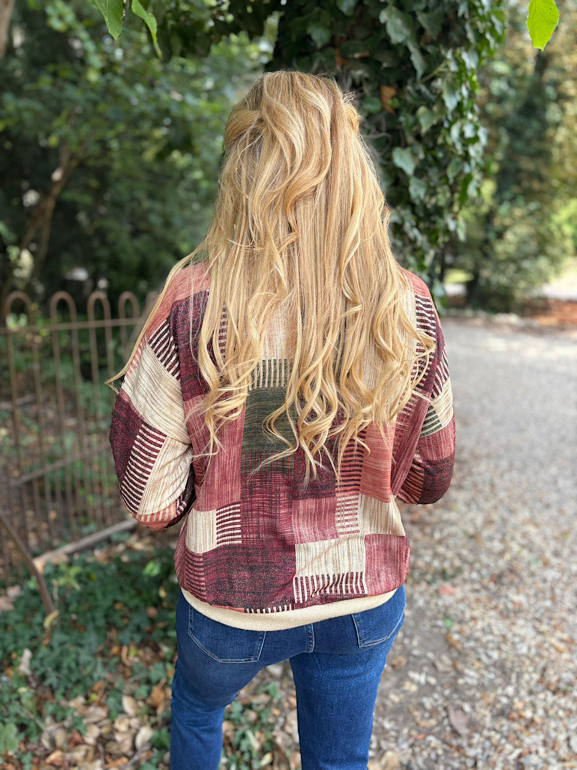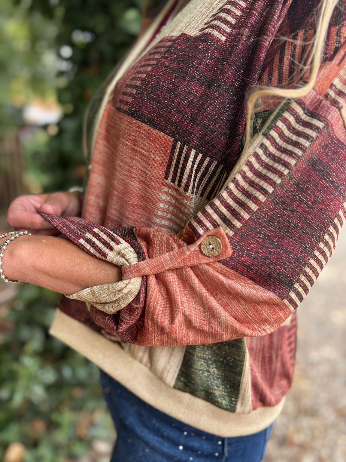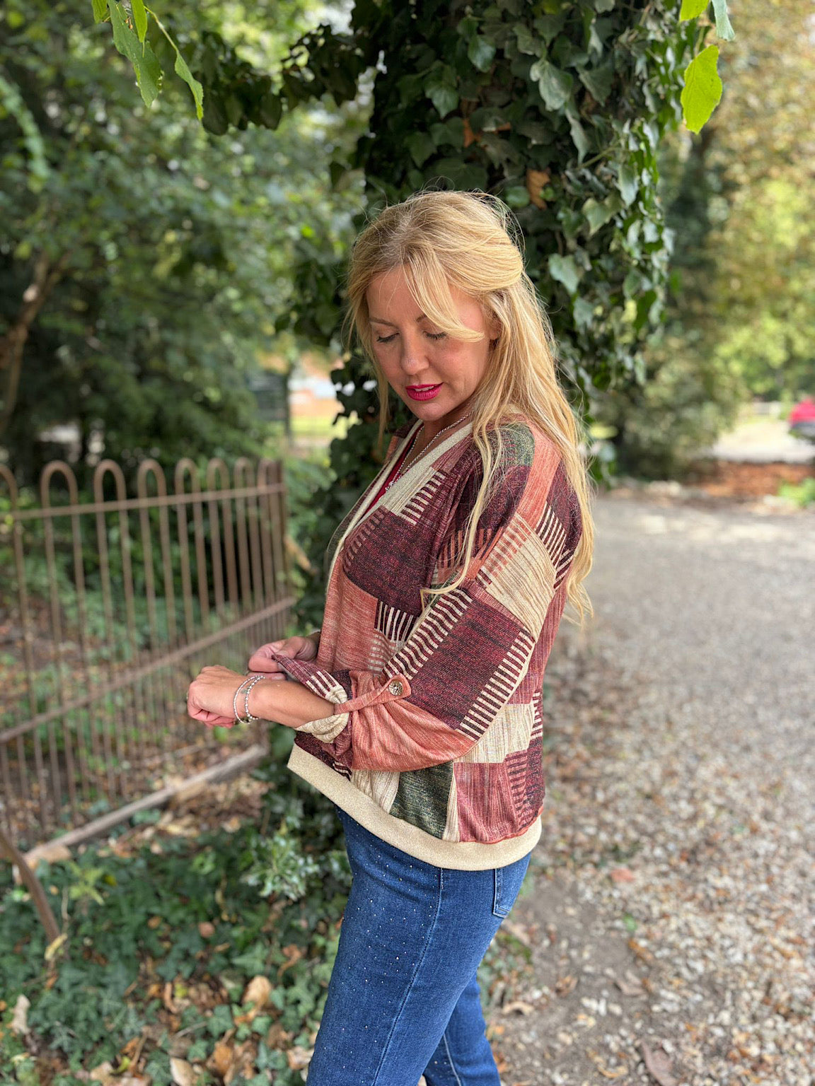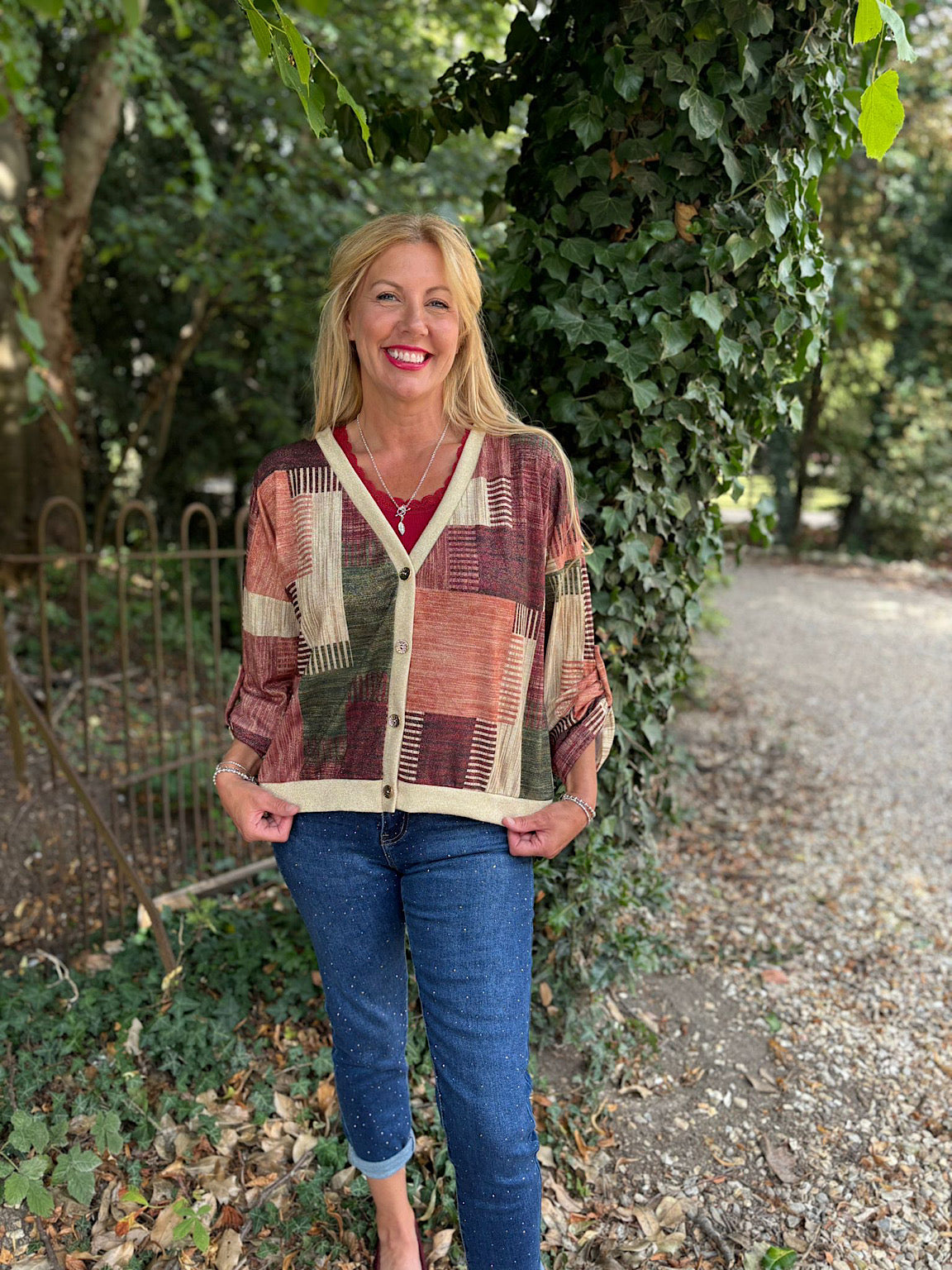 Styled with.....>Wine Patchwork Shimmer Top Lottie/ Khaki Wide Leg Pocket Trousers Claudia/ Chocolate Faux Suede Chain Loafer/ Denim Diamante Straight Leg Jeans