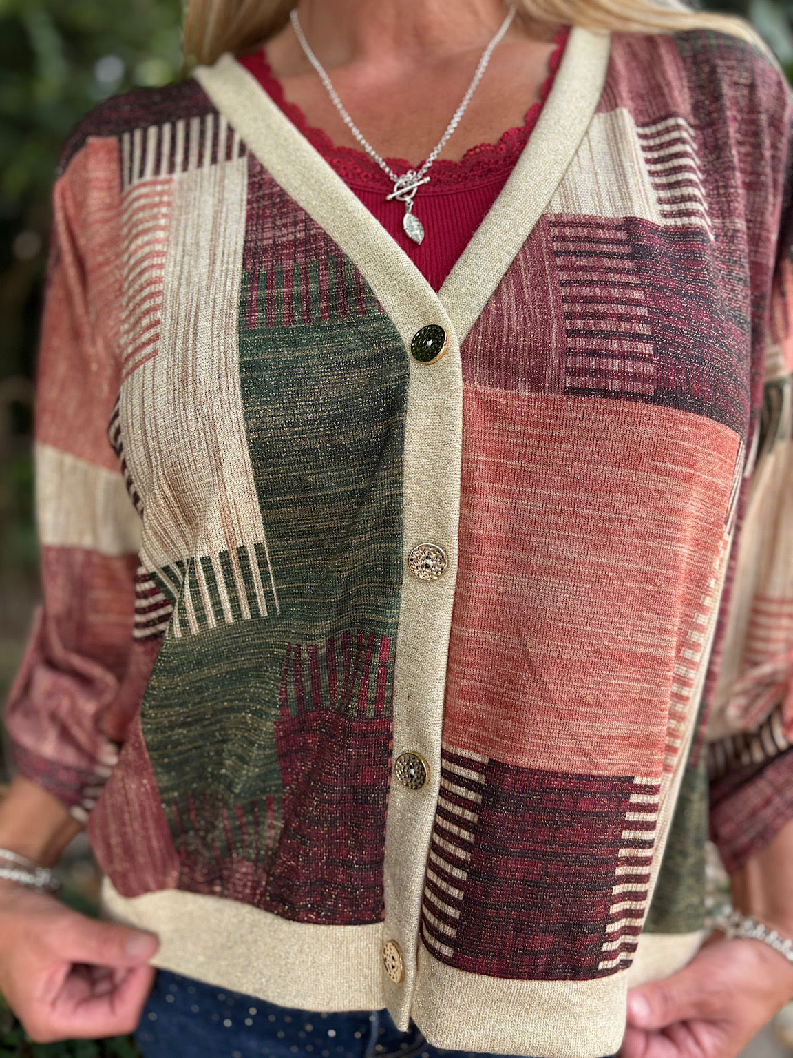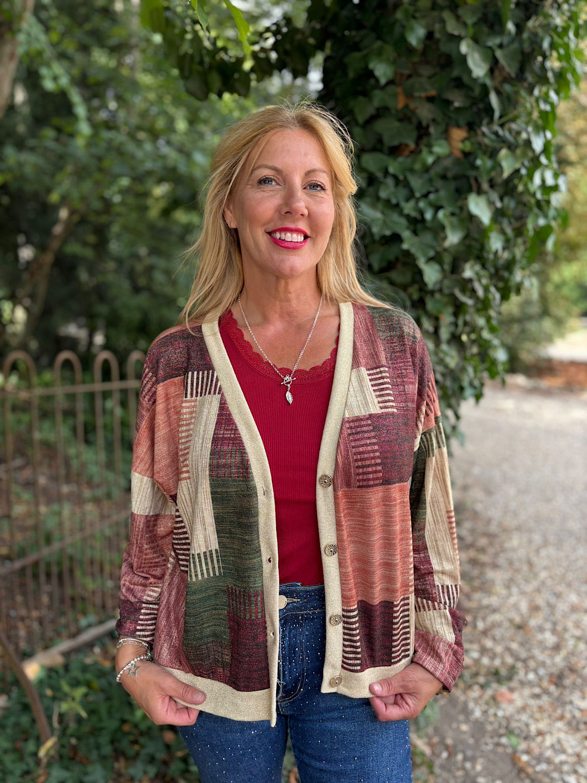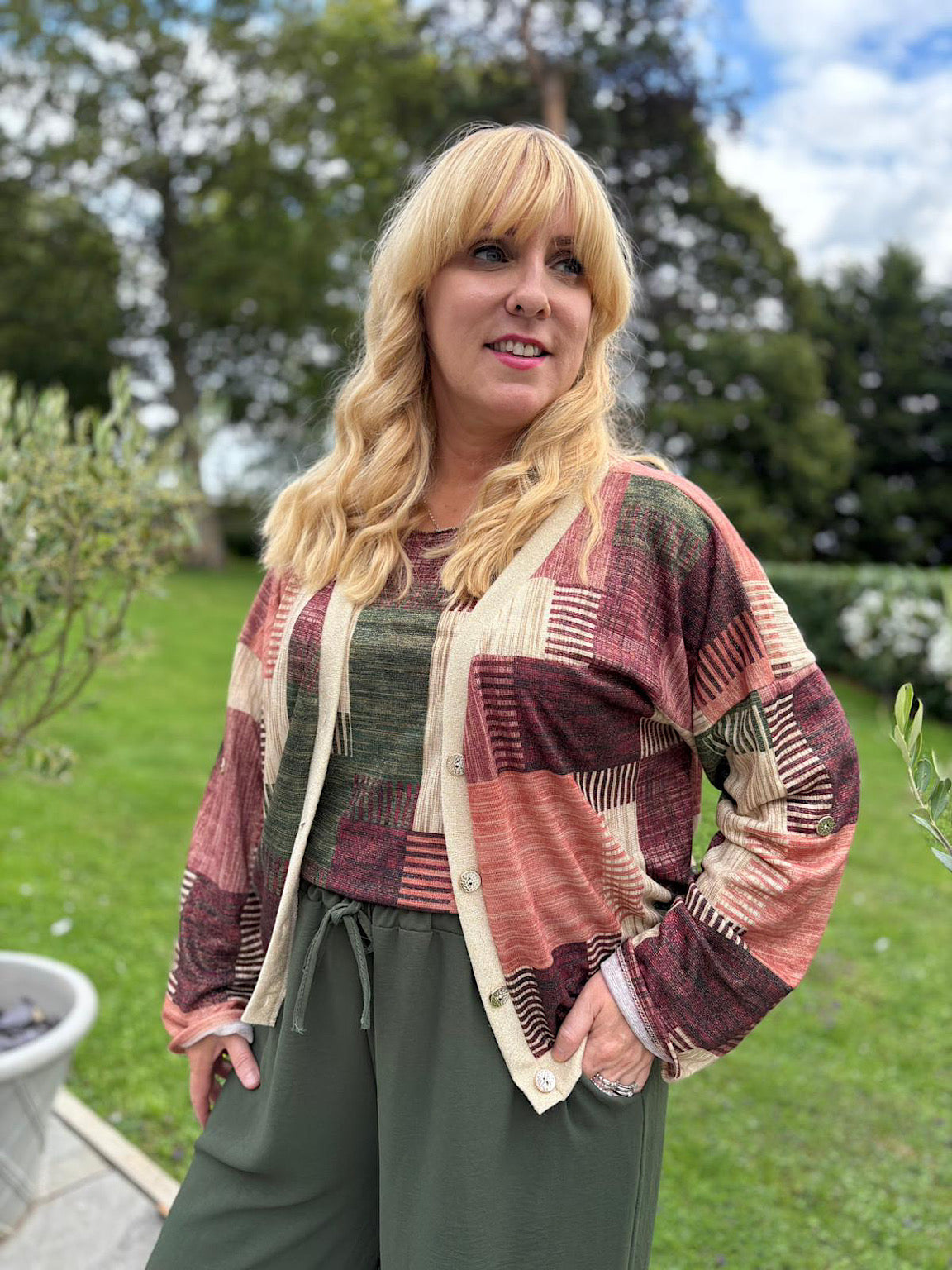 This Patchwork Shimmer Jacket Fern features a unique patchwork design enhanced with subtle gold lurex threads woven throughout the fabric, adding a refined shimmer. The button fastening ensures a secure and comfortable fit, making it a stylish and versatile addition to your wardrobe. Perfect for elevating your look with a touch of elegance and warmth.